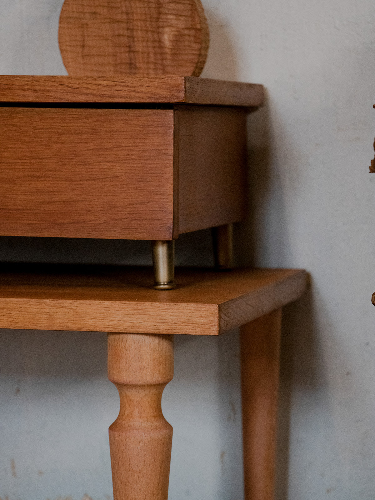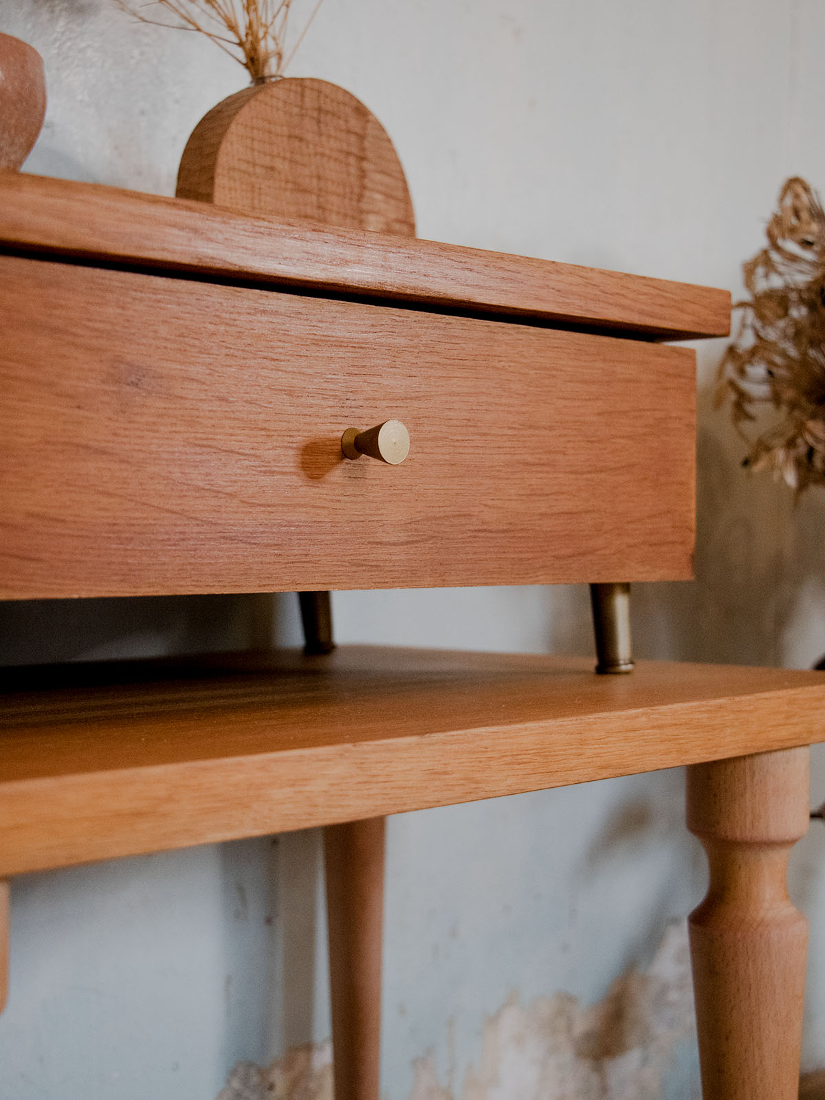 Add a touch of retro warmth with this beechwood bedside table, dating from the 1950s/60s. Its compact size, featuring a raised shelf and drawer, offers practical storage for your books and bedtime essentials. The beechwood veneer and legs reveal a beautiful natural tone that complements both contemporary and vintage interiors, and its simple, elegant silhouette creates a soft and balanced ambiance.