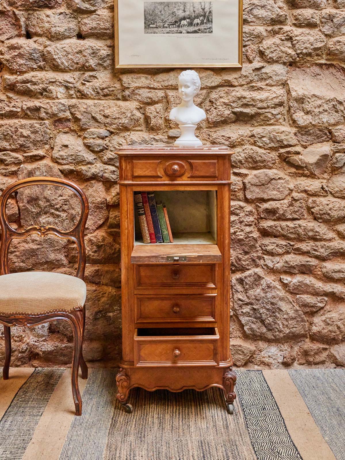 Elevate your bedroom with this Louis XV style bedside table, featuring a finely crafted wooden body and pink and white marble tops. Its four drawers and drop-front provide elegant storage for books, jewelry, and accessories, while its delicate proportions complement both classic and contemporary interiors. Discreet casters allow for easy mobility and can be removed to restore the original look and enhance its elegance.