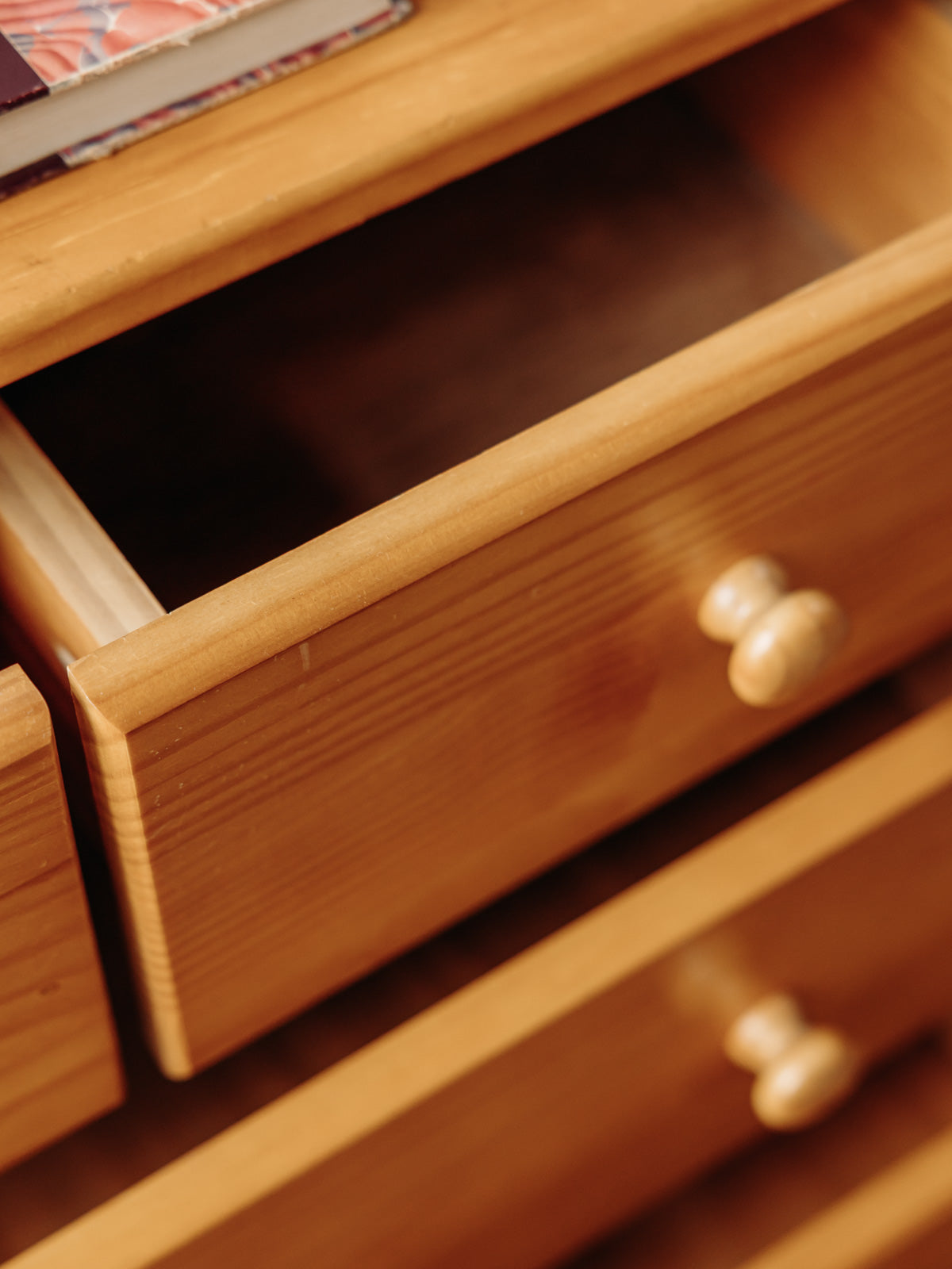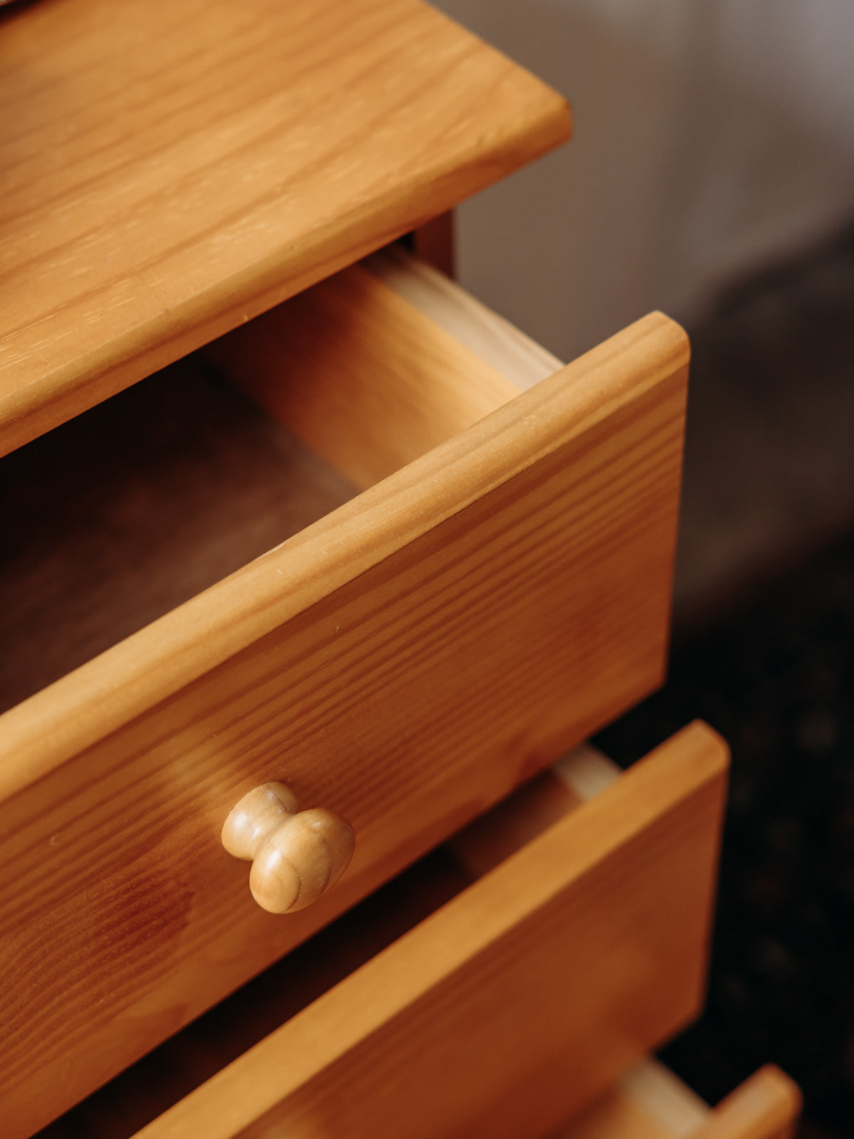 Apportez une touche chaleureuse et naturelle avec cette commode en pin clair qui combine lignes simples et pieds ronds pour une silhouette épurée. Ses cinq tiroirs — deux en parties supérieures et trois plus profonds — offrent un rangement modulable pour le linge, les accessoires ou les papiers, tandis que ses larges rebords structurent le plateau et accueillent objets décoratifs ou cadres. Son format équilibré et la douceur du bois s'intègrent aussi bien à une chambre qu'à une entrée, créant une ambiance calme et invitante.