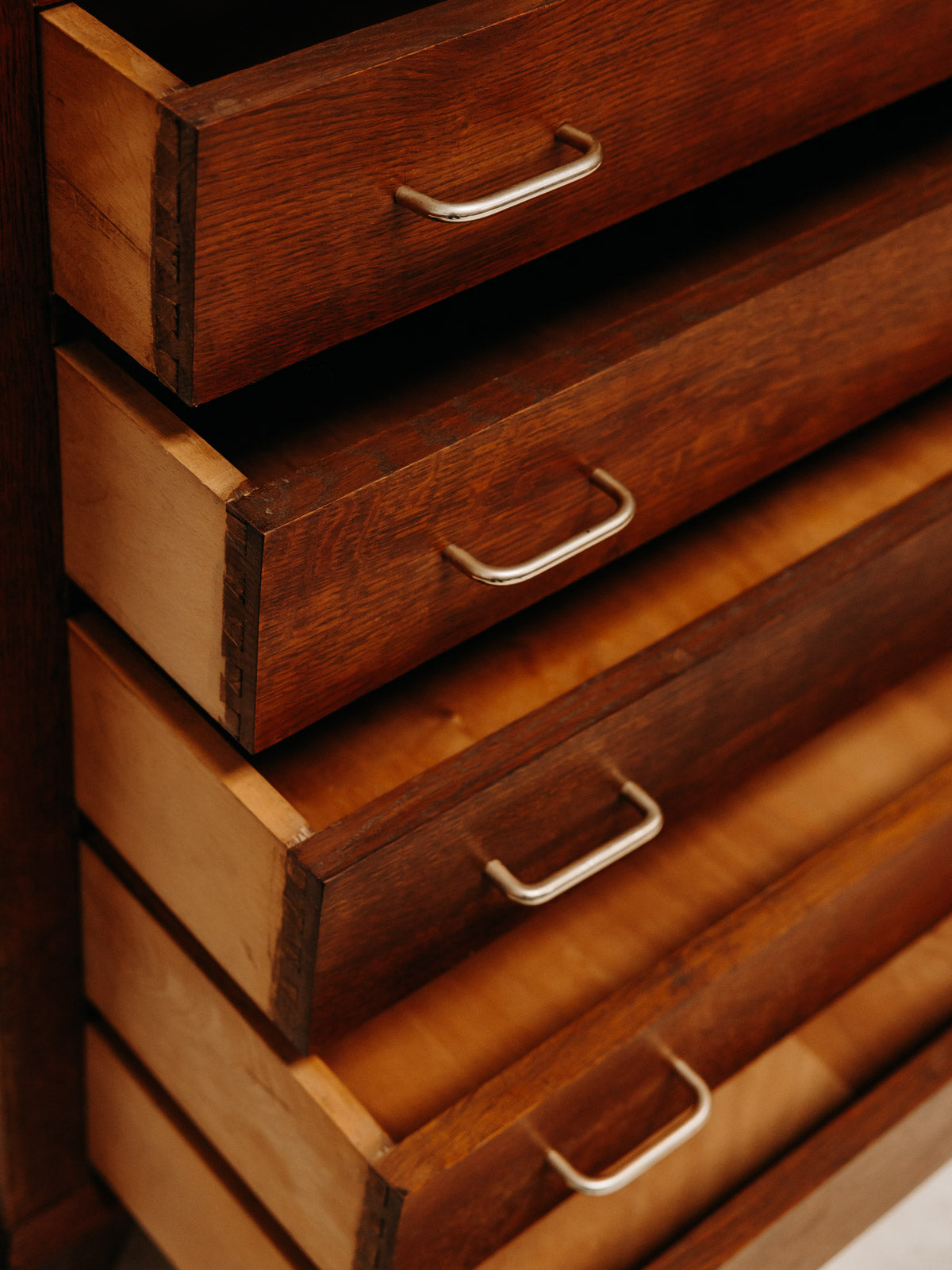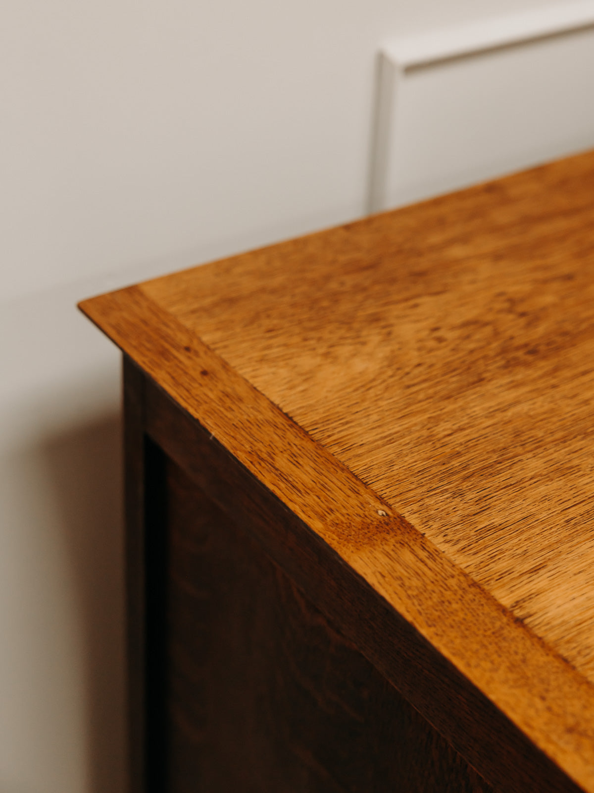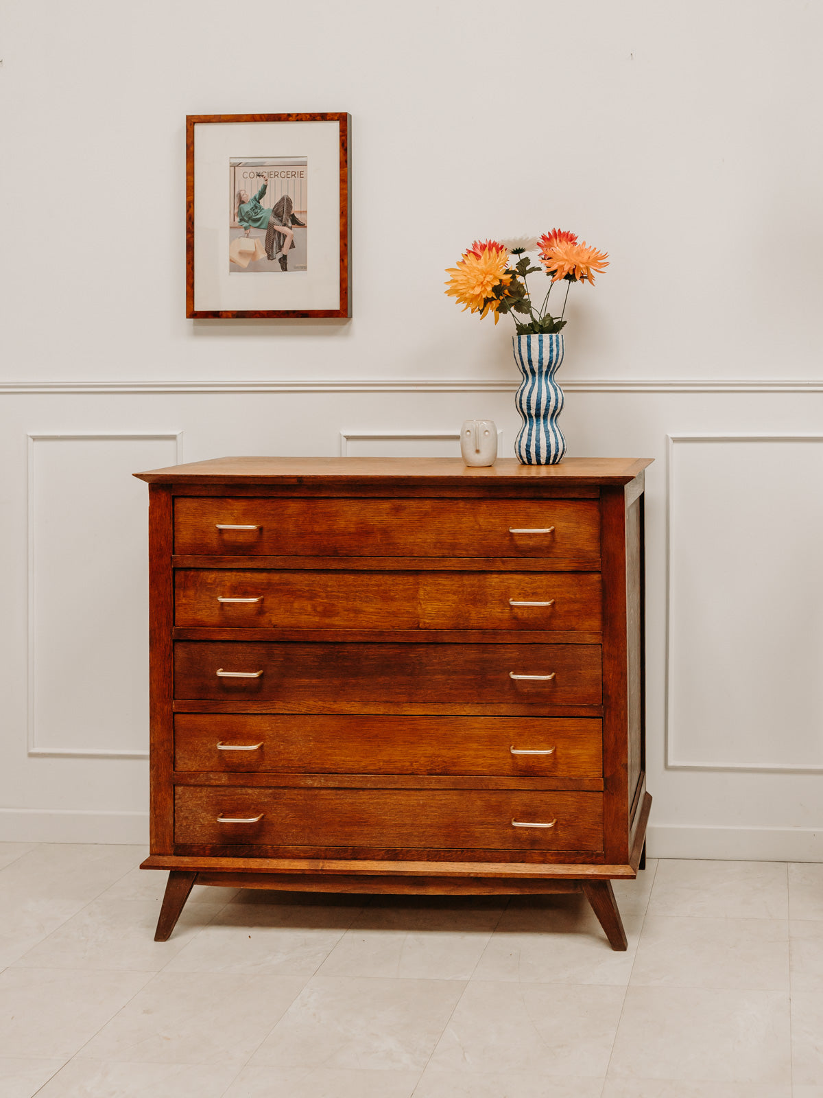 Adoptez cette grande commode en bois foncé au charme maîtrisé, dont le plateau élargi offre un élégant support pour lampes et objets du quotidien. Ses cinq tiroirs dotés de poignées métal proposent un rangement généreux et organisé, tandis que les pieds compas à l'avant lui confèrent une touche rétro et une silhouette équilibrée. Parfaite pour une chambre ou une entrée, elle installe une atmosphère chaleureuse et structurée.