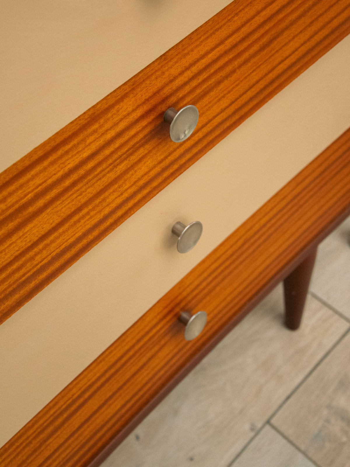 Discover this two-tone, five-drawer chest, enhanced by zinc knobs and splayed legs that lend it a retro-chic and airy feel. Its generous proportions offer functional storage for linens and accessories, while the contrasting finishes bring understated elegance to the bedroom or entryway. A few scratches on one side and small chips on the corners are a testament to its age.