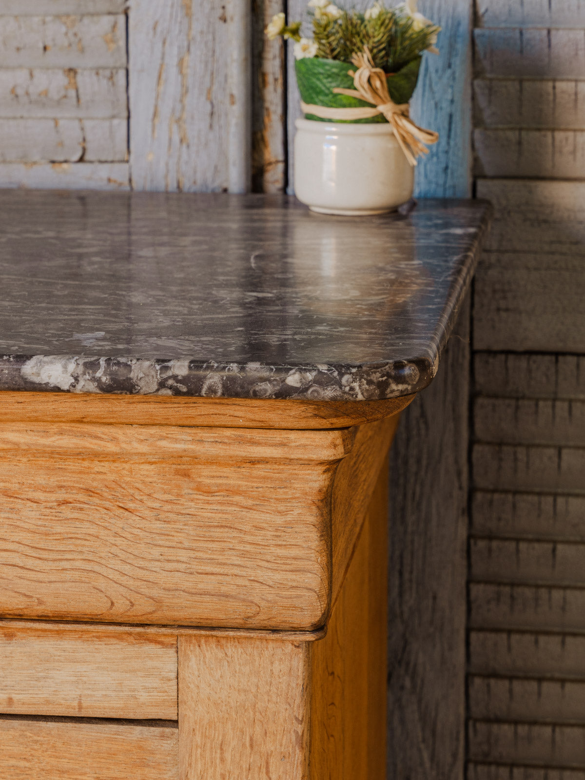 Adoptez cette commode Louis-Philippe en bois, sublimée par un plateau en marbre qui lui confère une allure à la fois noble et sobre. Ses trois tiroirs proposent un rangement généreux et ordonné, chacun doté d'une serrure : la clé fournie permet d’actionner le tiroir central pour un usage sécurisé et pratique. Idéale dans une chambre ou une entrée, elle installe une ambiance intemporelle et chaleureuse, parfaite pour organiser linge et objets du quotidien. Quelques traces du temps.