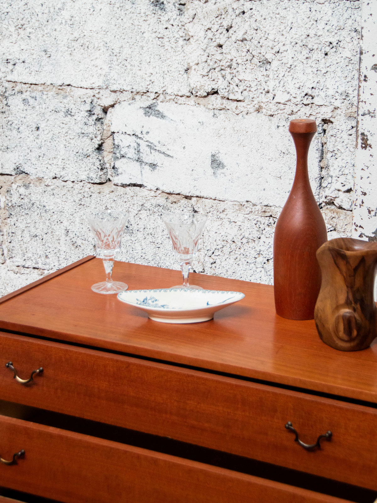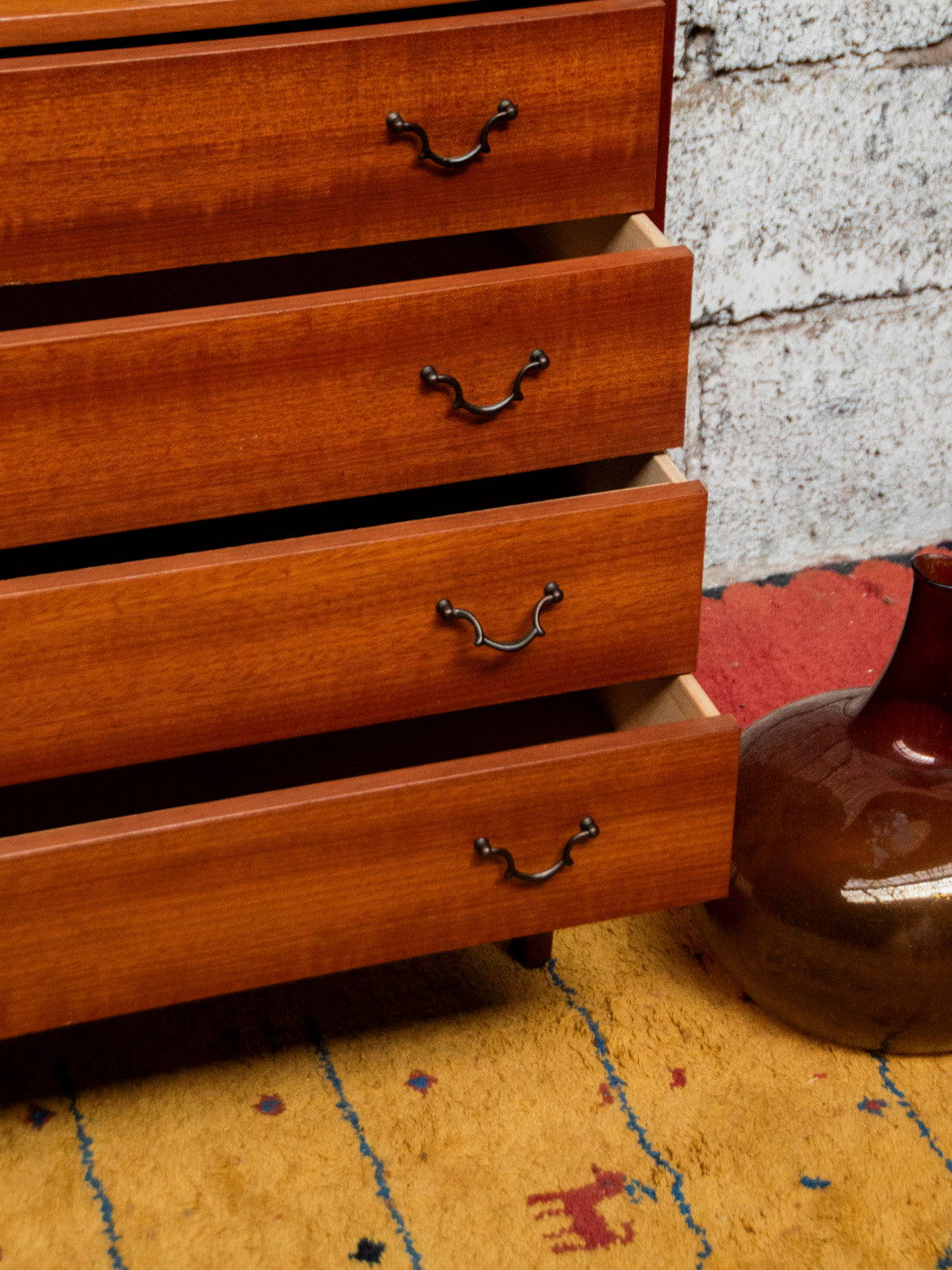 Sublimez votre intérieur avec cette commode en bois aux lignes mid-century, sculptée dans un beau bois orangé qui diffuse une chaleur naturelle. Ses quatre tiroirs, équipés de poignées pendantes en métal noir, offrent un rangement astucieux sans encombrer l'espace, grâce à son gabarit compact et ses pieds hauts fuseaux qui allègent les proportions. Idéale dans une chambre ou une entrée pour instaurer une atmosphère élégante et accueillante.