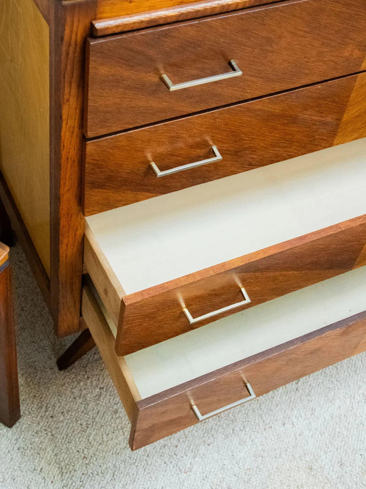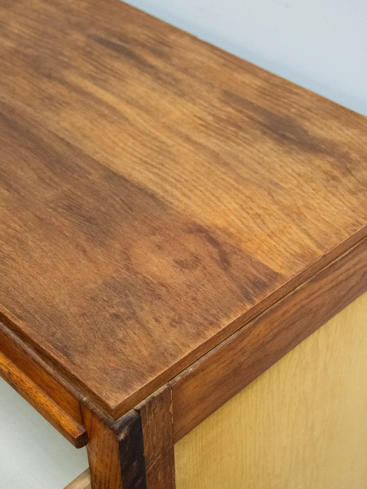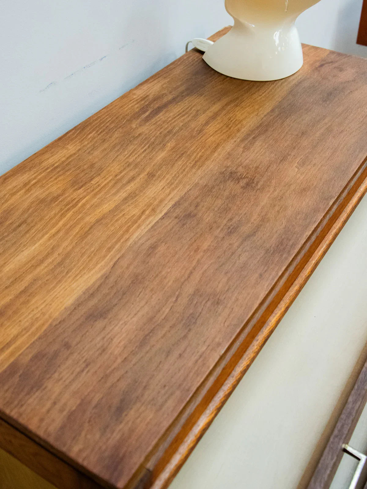 Discover this magnificent dark oak chest of drawers from the 1950s, with its elegant compass legs that add a vintage touch to your interior. Featuring four spacious drawers, it offers both style and practicality. Fully refurbished, this piece has a slight defect on the right back corner and some wear and tear. Its oak veneer adds a natural warmth that complements any decor style. A true statement piece for your home!