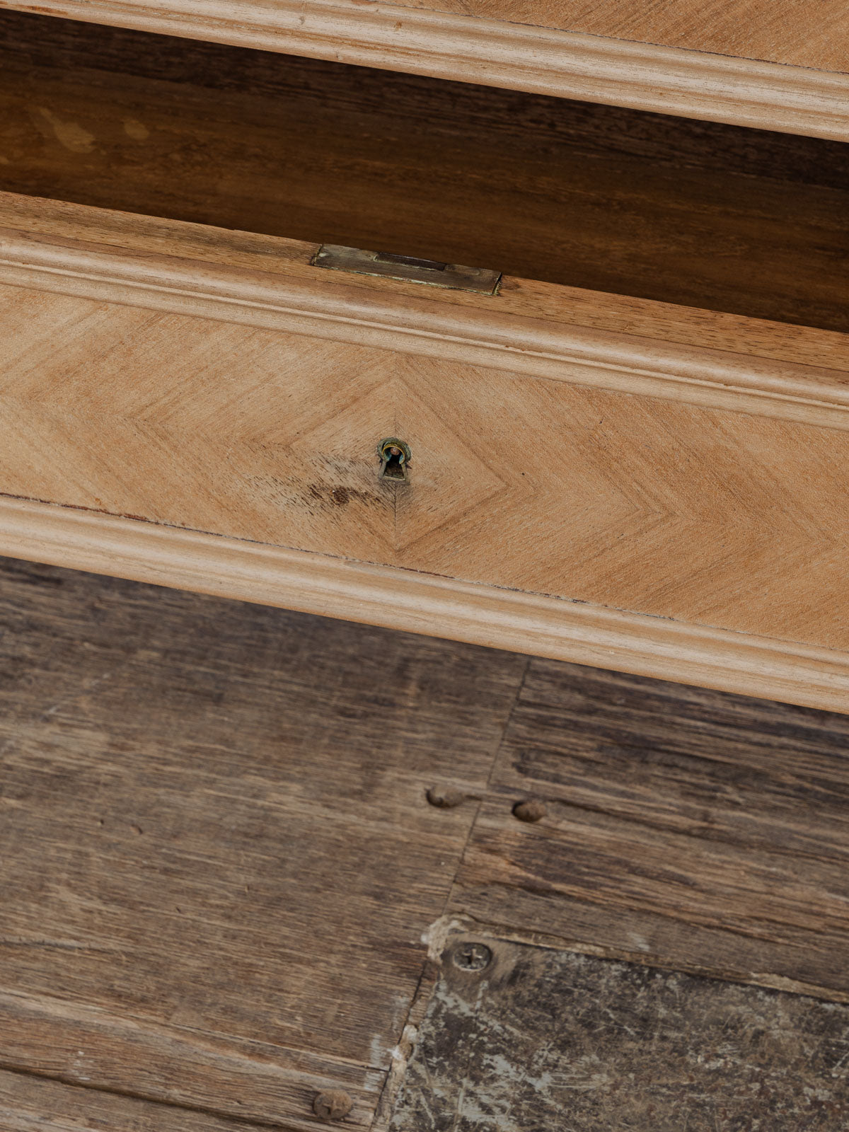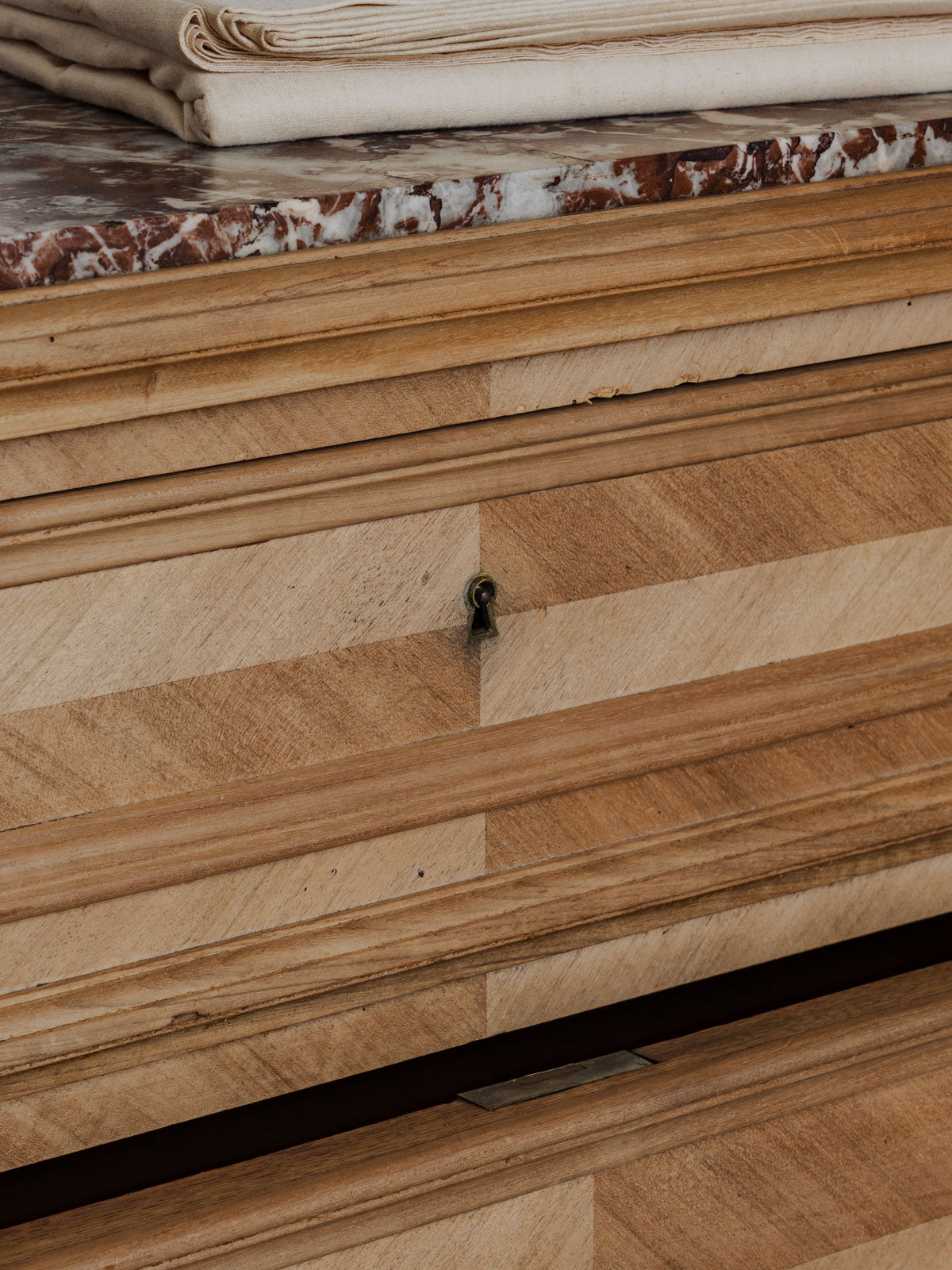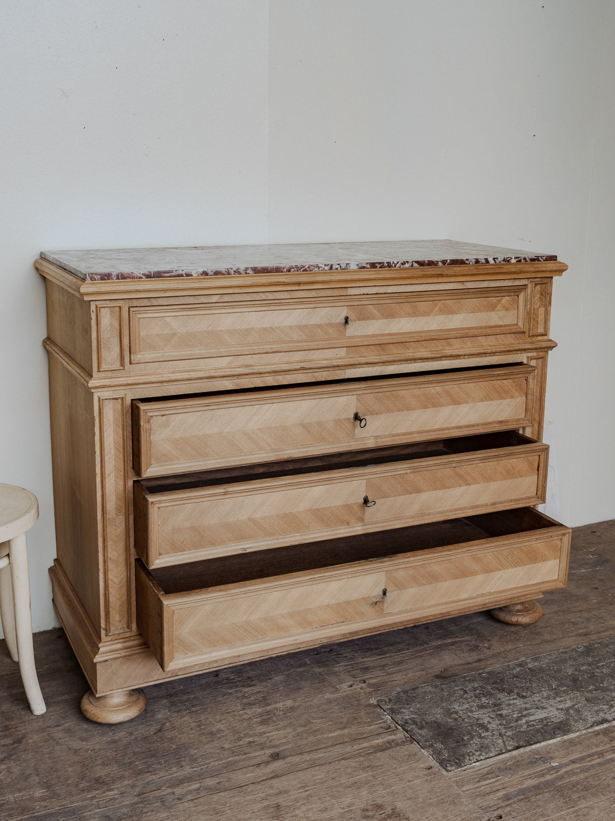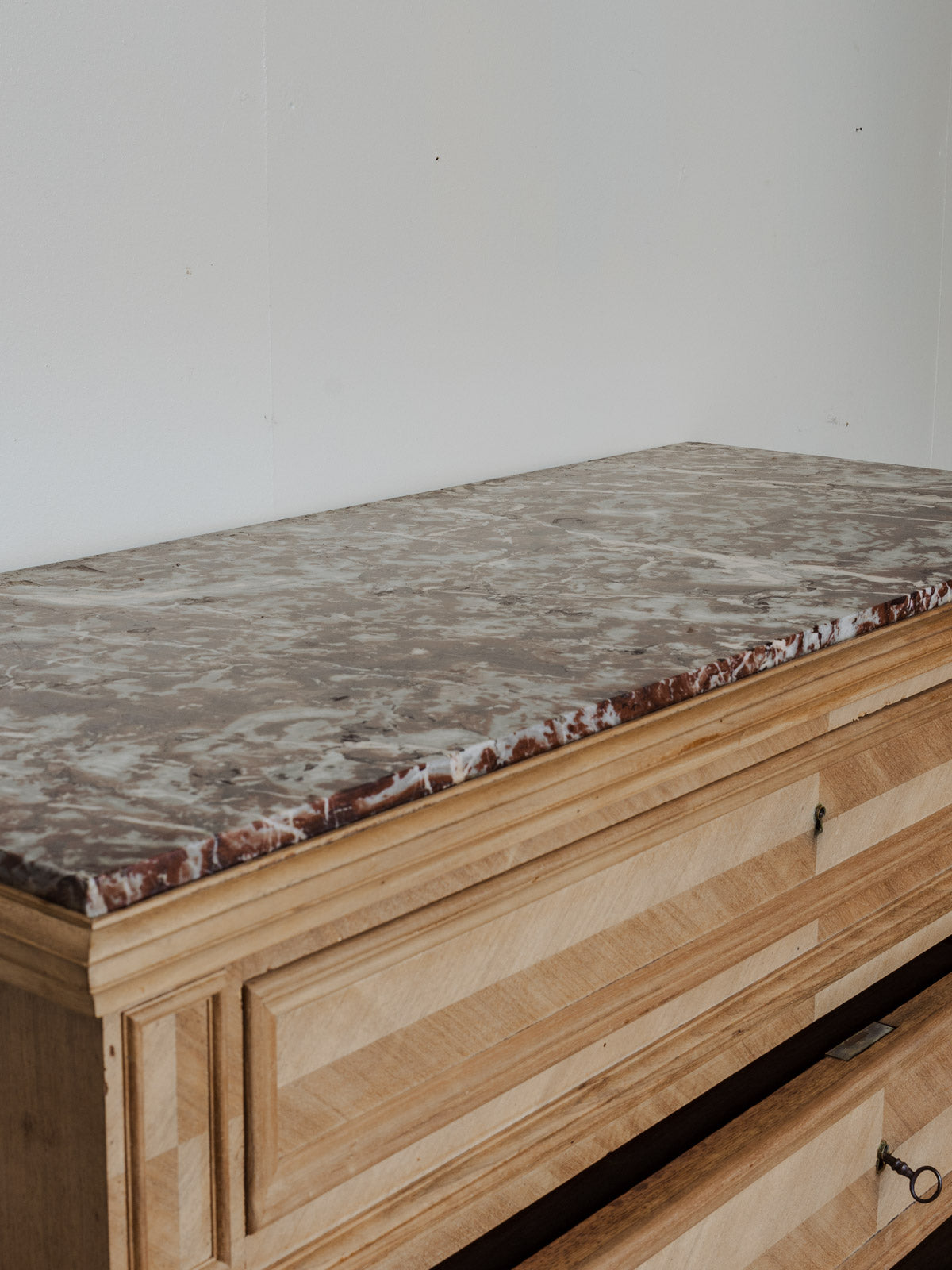 Discover this Louis-Philippe chest of drawers with a burgundy and gray marble top, enhanced by stripped marquetry walnut that lends it a warm elegance. Its four drawers and proportions offer practical storage for the bedroom or entryway, while the rounded legs emphasize its classic style. Two original keys attest to its history and add a touch of authenticity. The locks are not functional, and some signs of age are present.