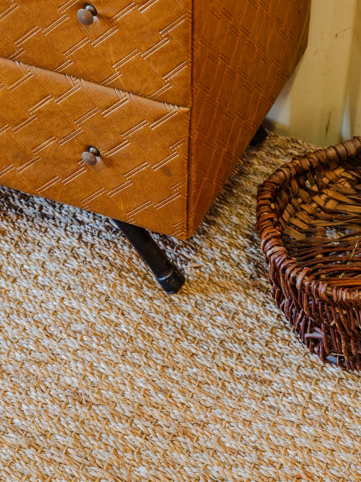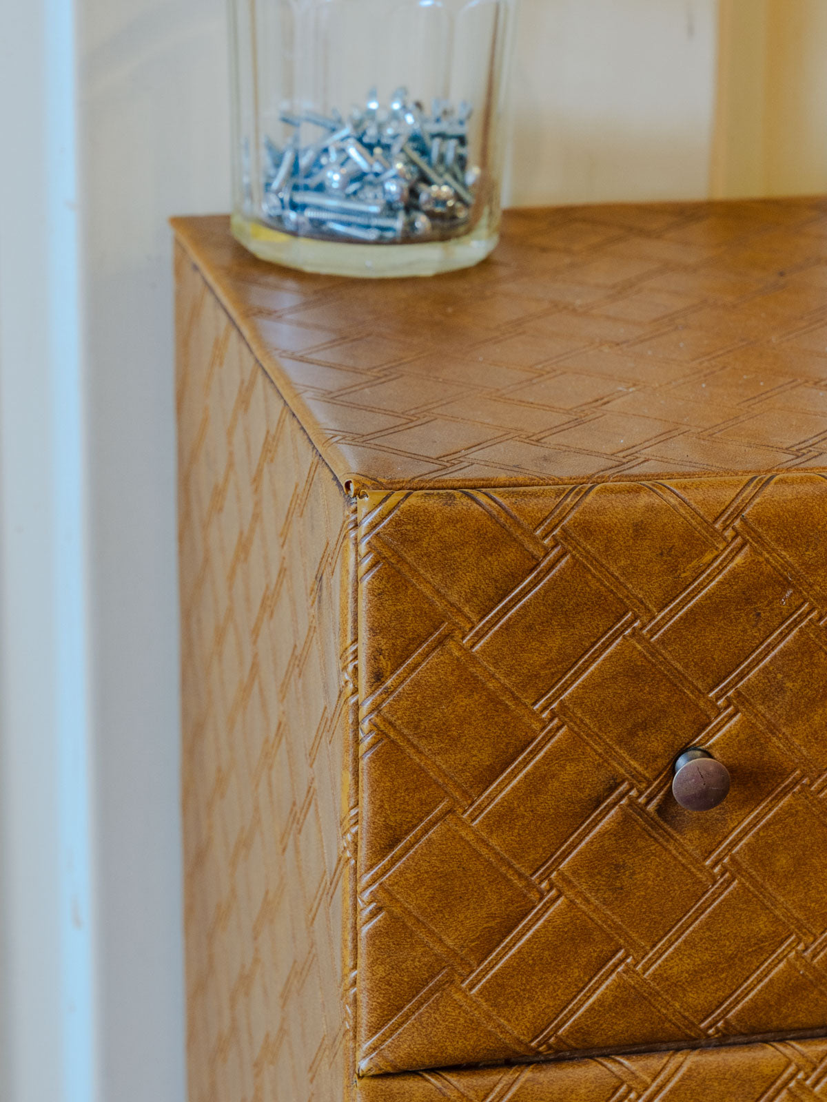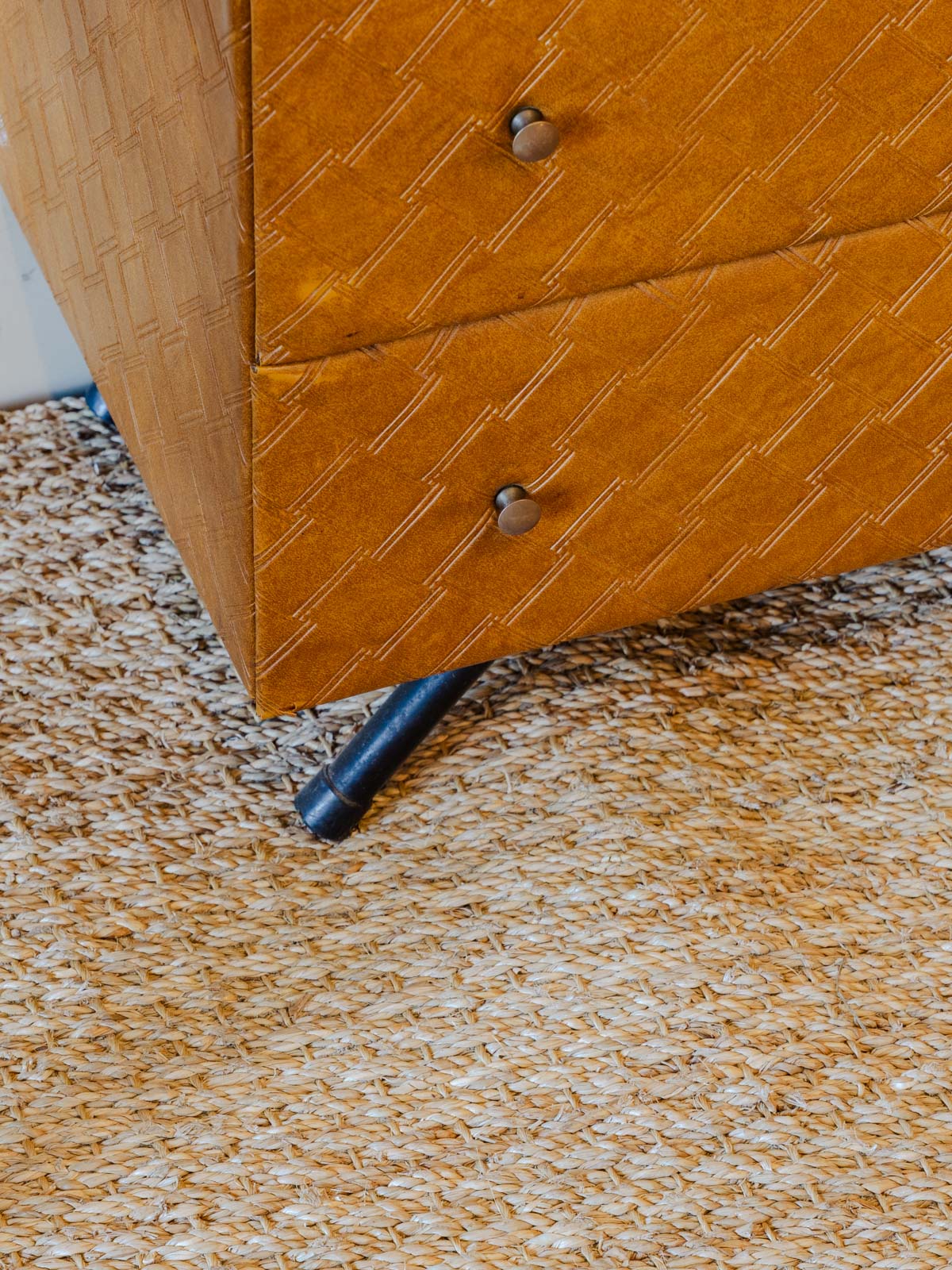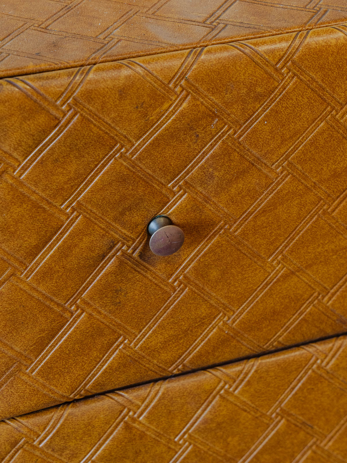 Adoptez ce meuble d'appoint vintage revêtu d'un skaï matelassé qui lui confère une allure rétro-chic. Ses cinq tiroirs, habillés intérieurement d'une feutrine rouge, offrent un rangement organisé pour petits objets et accessoires du quotidien, tandis que les pieds d'école d'époque lui apportent une silhouette graphique. Son format la rend parfait en bout de canapé, dans une entrée ou comme chevet, pour une touche chaleureuse et résolument singulière. Quelques traces du temps.