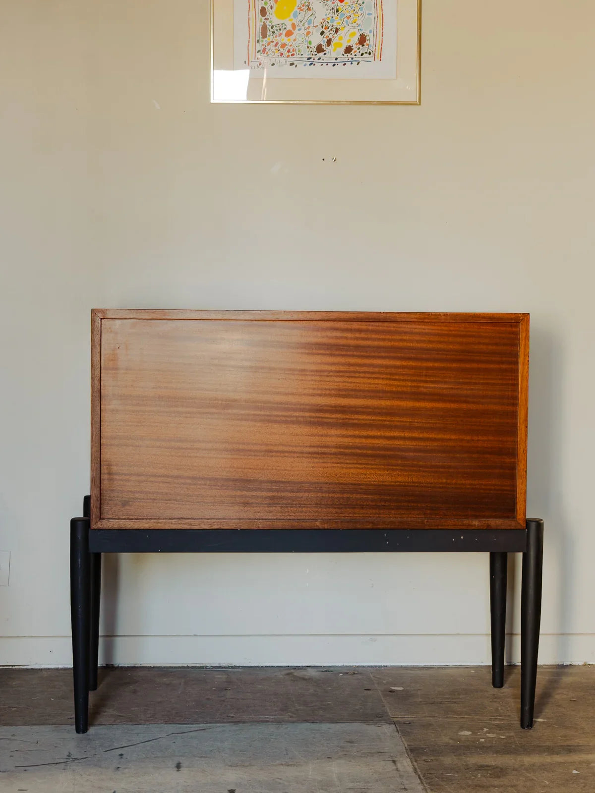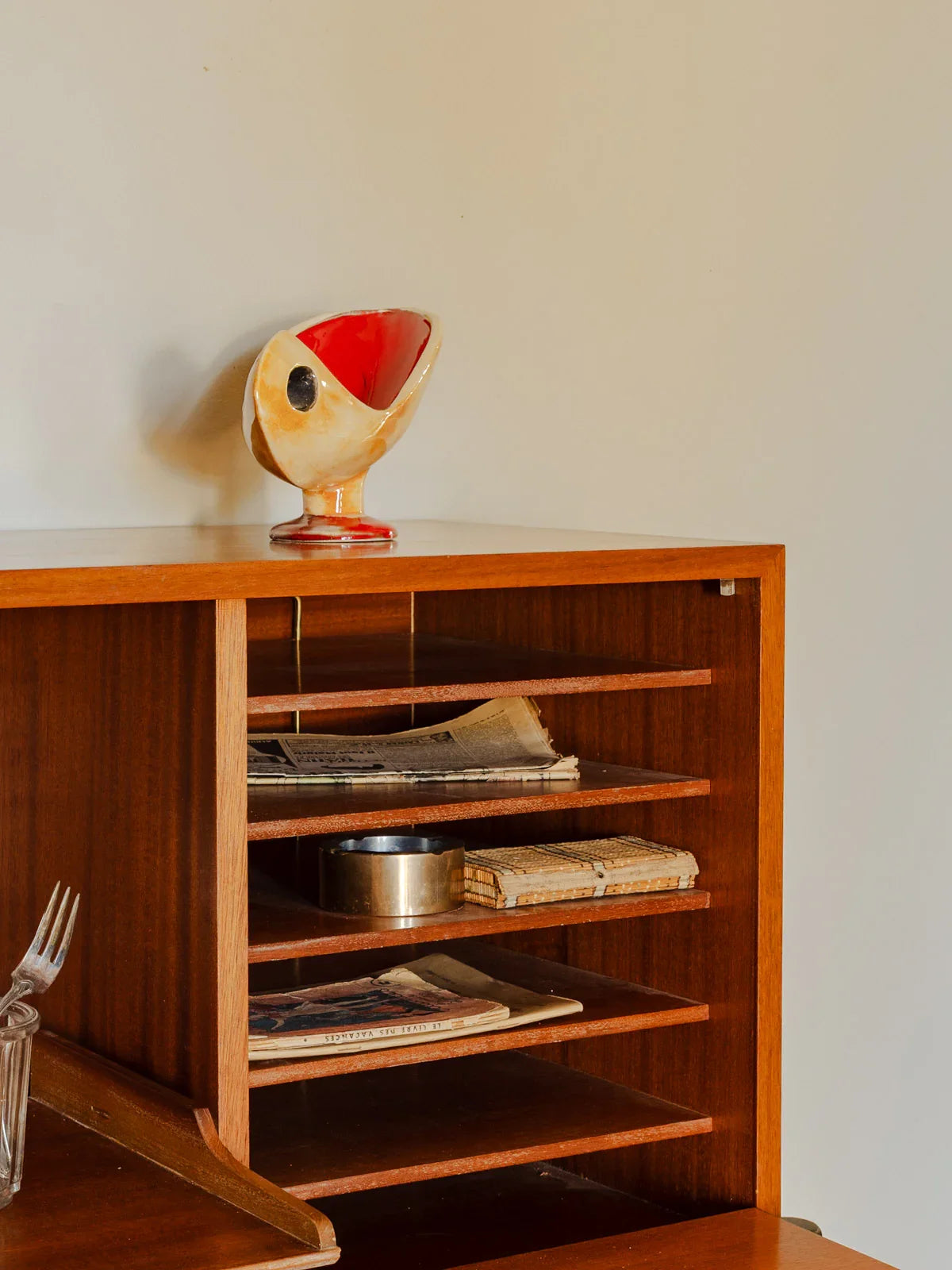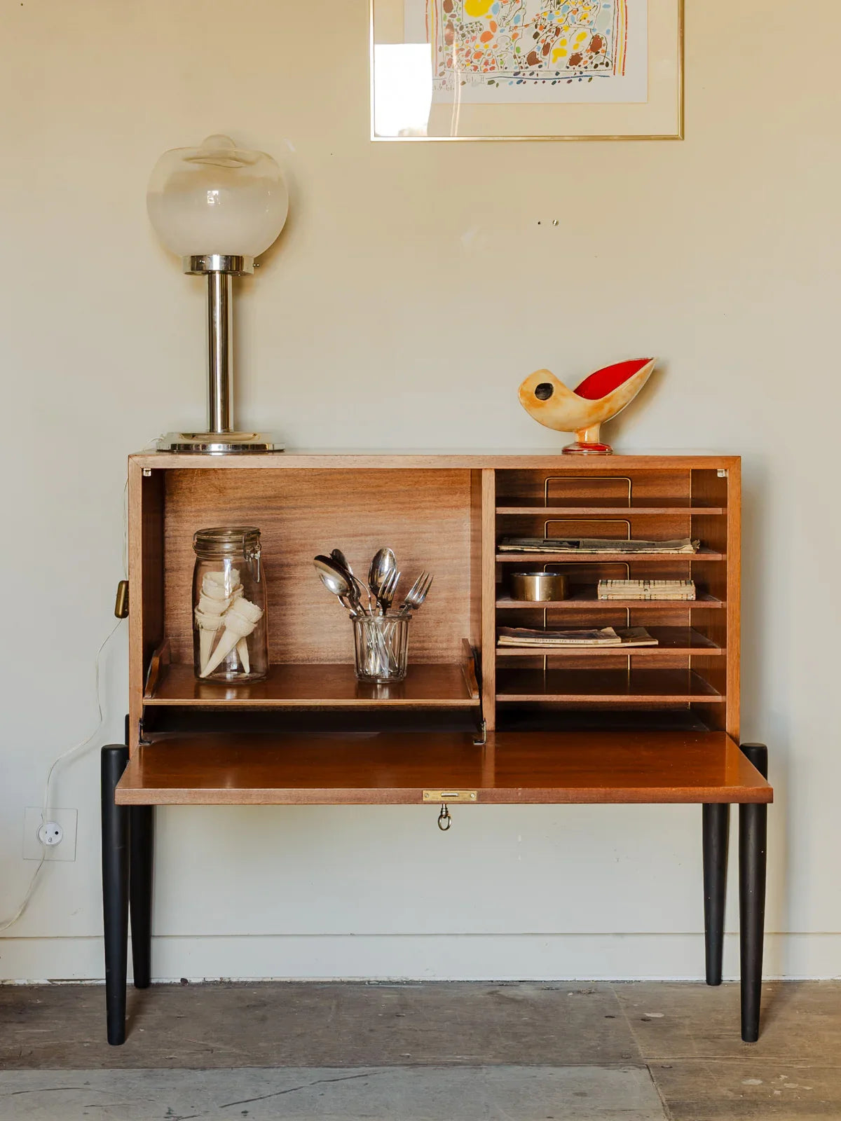 Discover this elegant 1970s chest of drawers, made of teak, which will add a vintage touch to your home. It features a practical compartment with a sliding tray, ideal for easy access to your essentials. Additionally, its other compartment has five compartments, perfect for organizing your small items in style. With its wooden base, this chest of drawers combines functionality and aesthetics, blending harmoniously into any space.