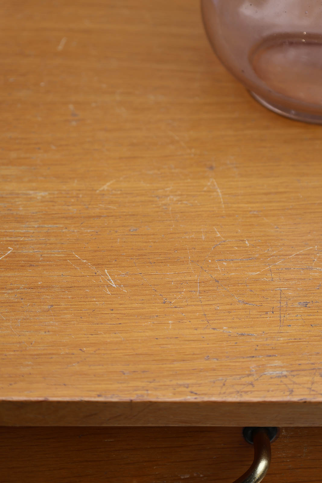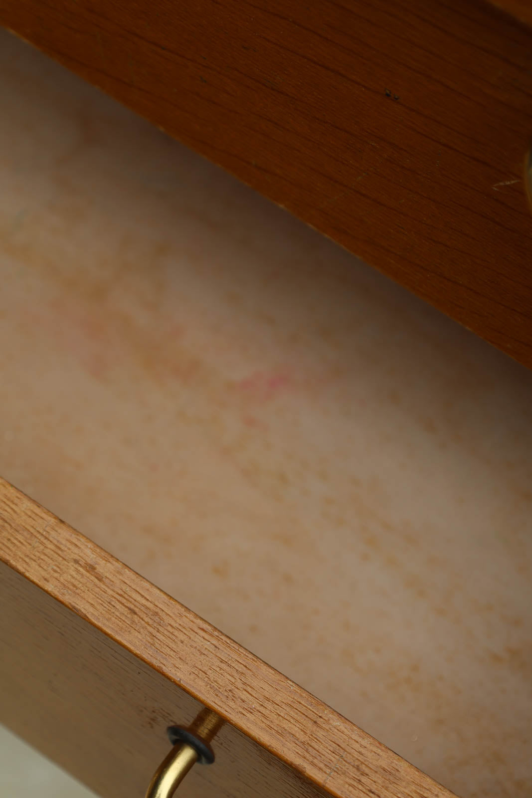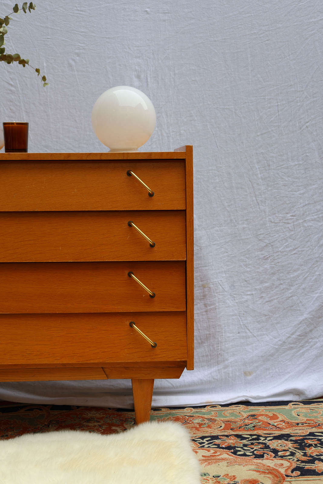 Enhance your interior with this Scandinavian teak chest of drawers featuring clean lines and splayed legs, which brings a refined mid-century look. Its four staggered drawers offer ample storage while maintaining harmonious proportions, and the gold brass handles add a warm and sophisticated touch. Ideal for a bedroom or entryway to structure the space and create a natural and elegant atmosphere. Some black marks on the top.