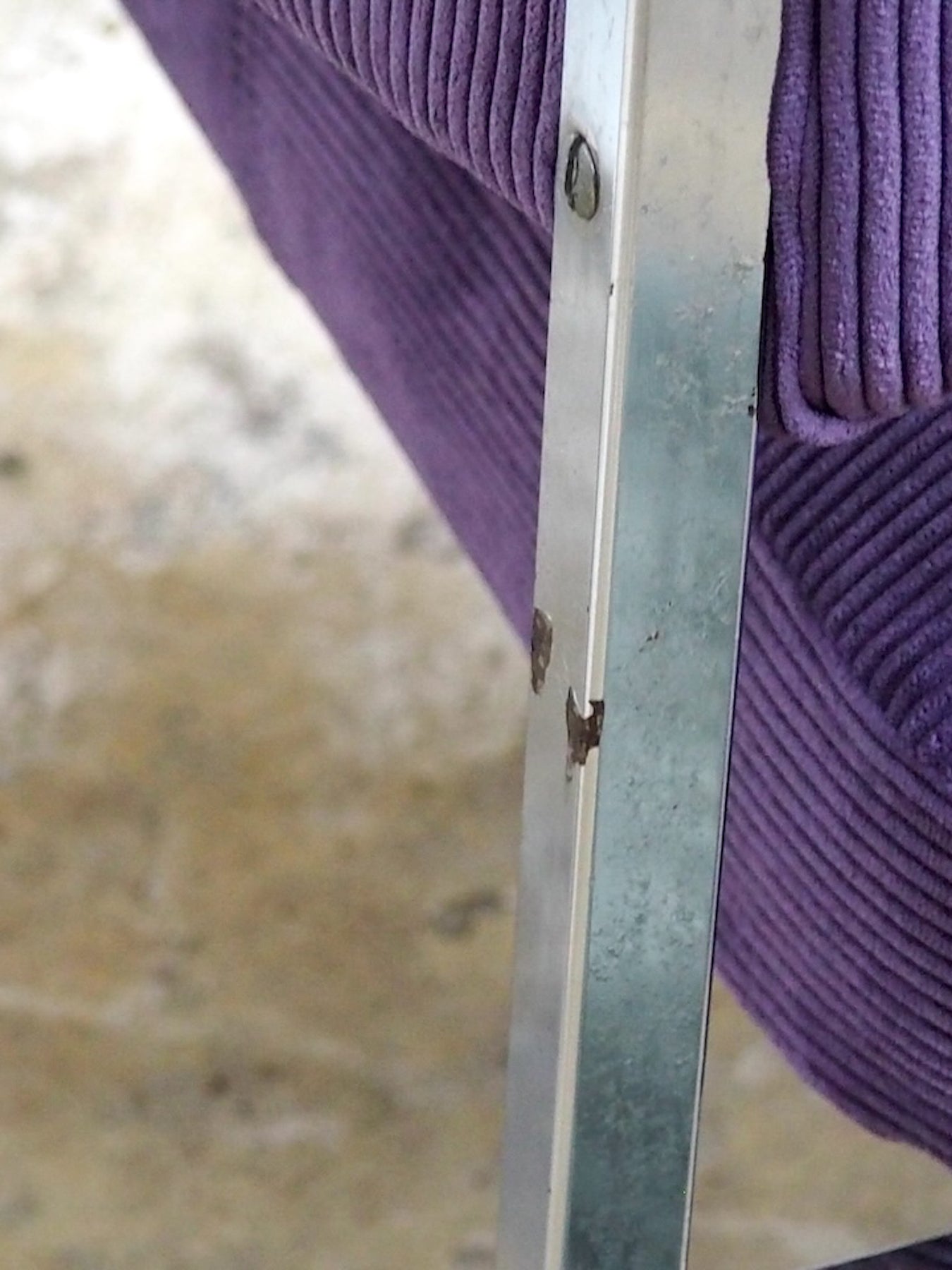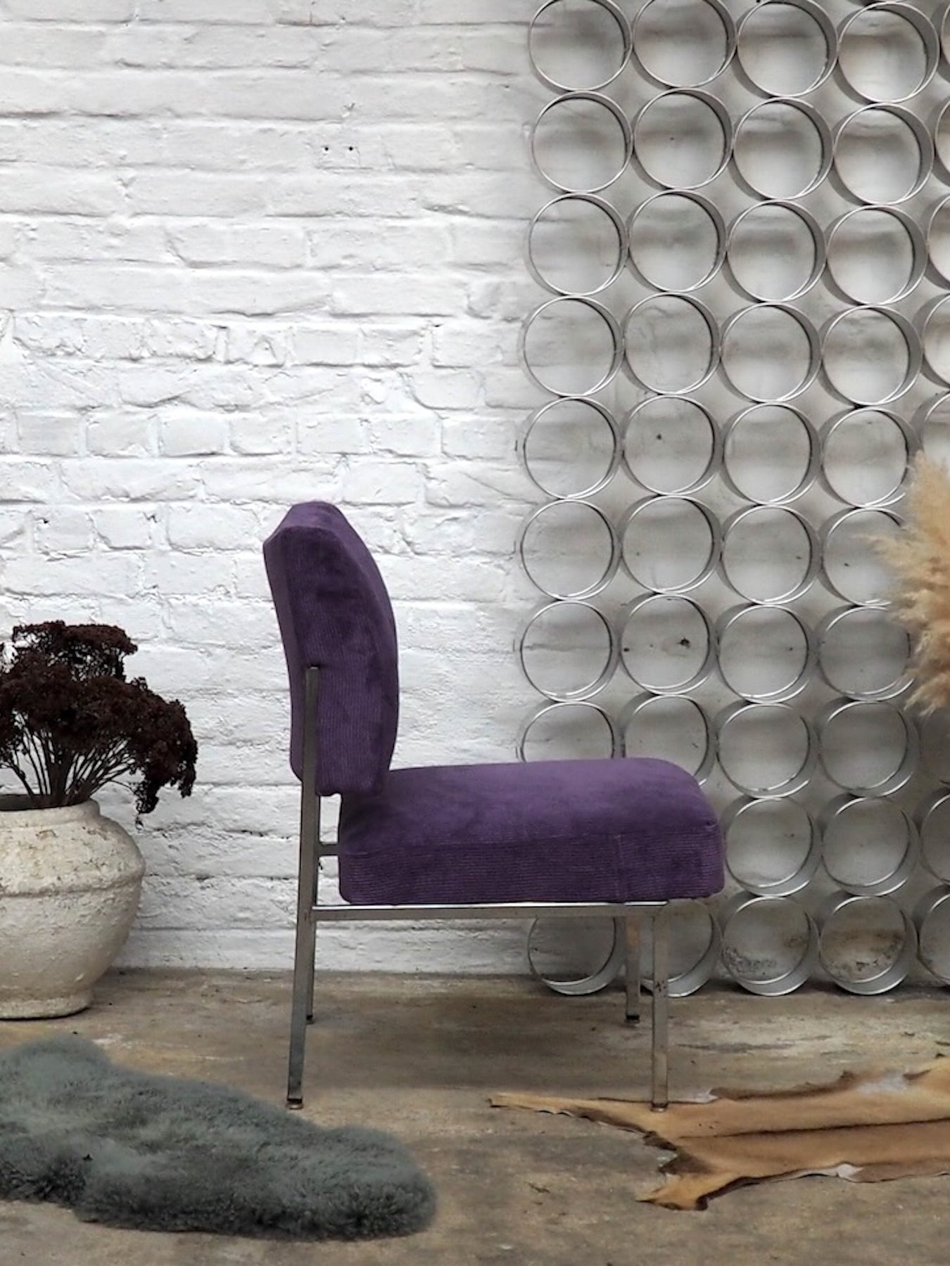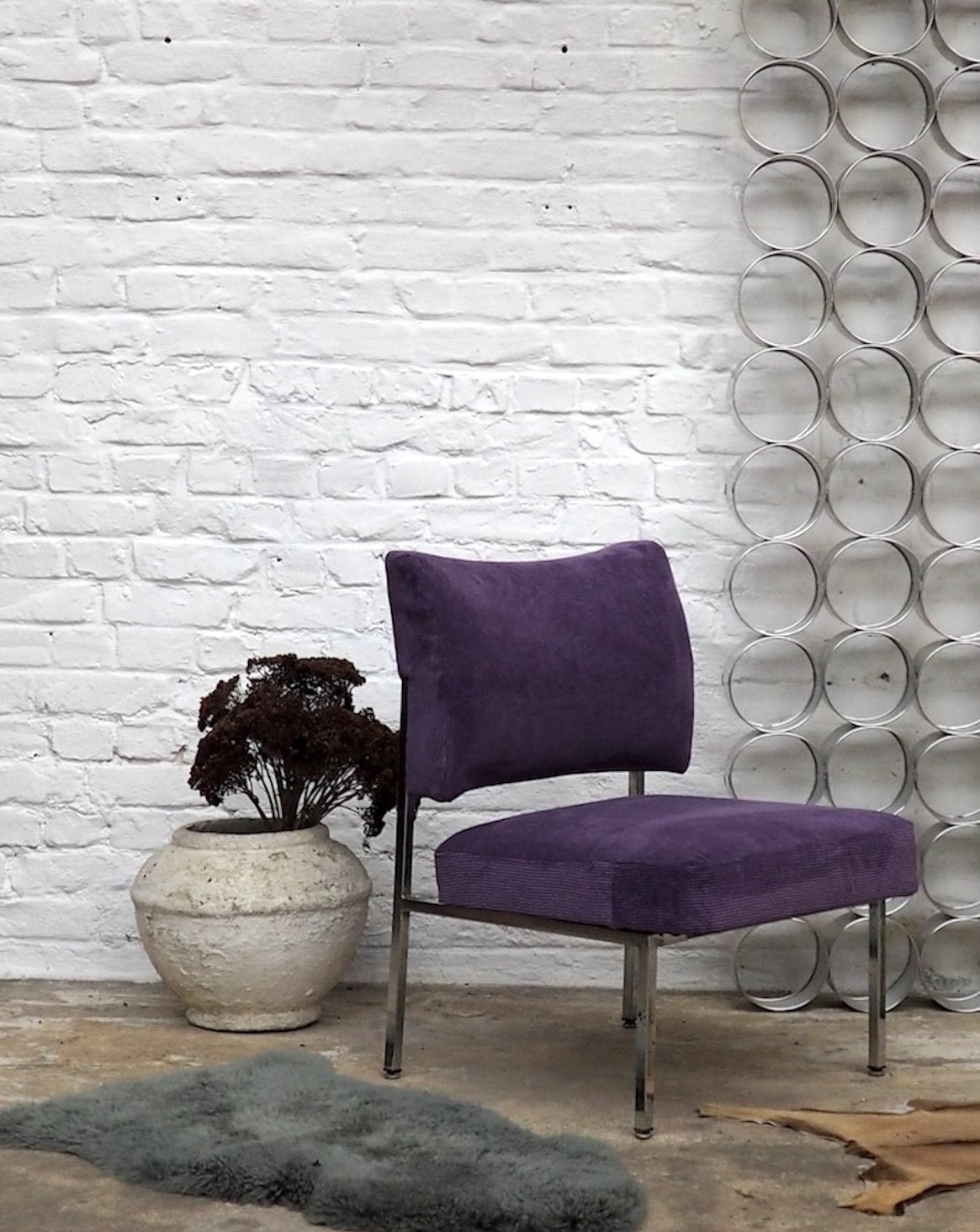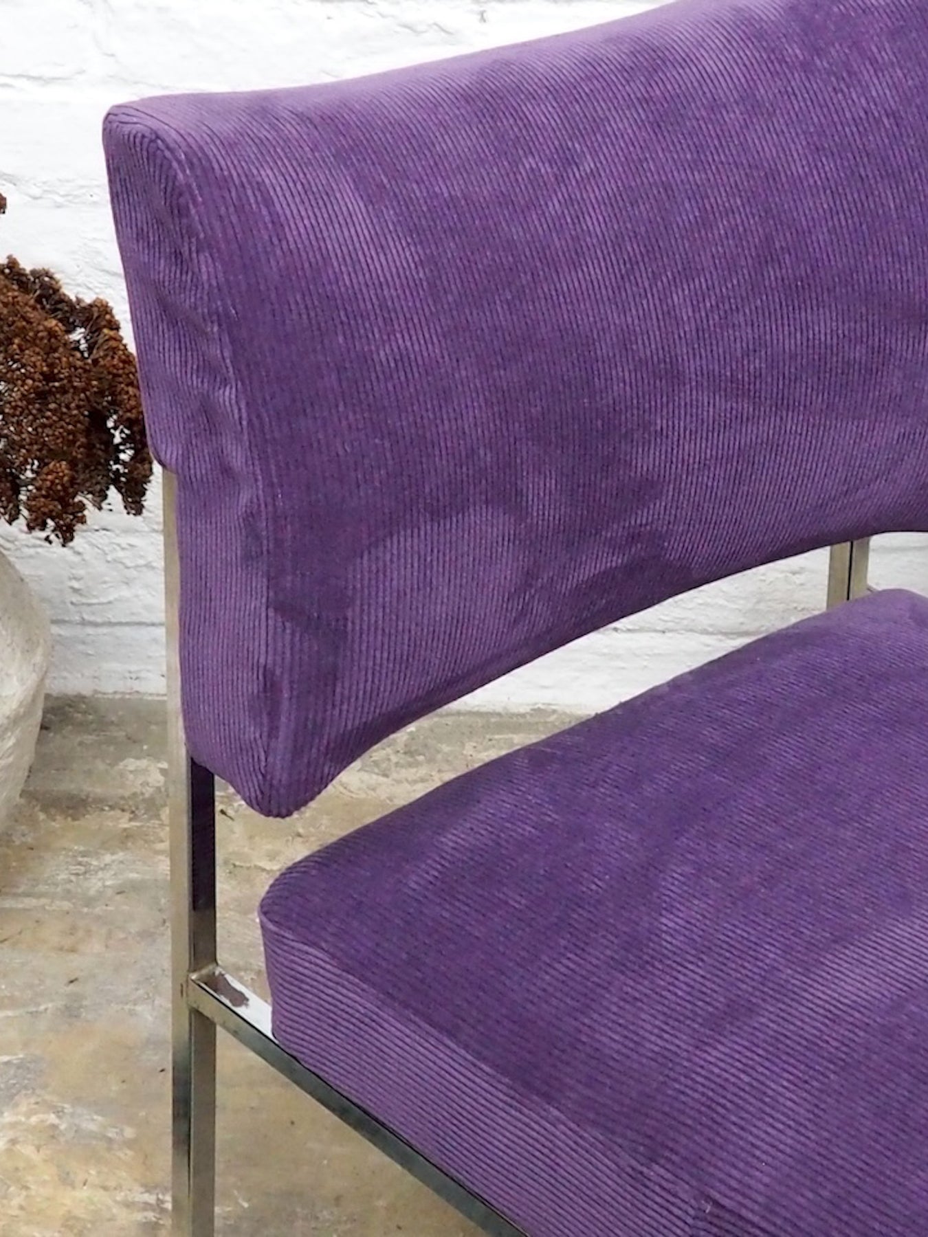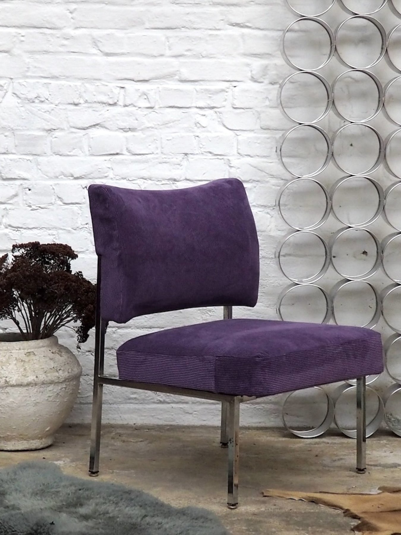 Adoptez cette chauffeuse des années 70, refaite à neuf dans un velours côtelé violet qui souligne ses volumes et son allure rétro-chic. Le piètement en aluminium chromé apporte une note graphique et légère, tandis que l'assise accueillante et le format compact en font un fauteuil d'appoint idéal pour un coin lecture ou une chambre élégante. Quelques traces d'usure sur le chrome.