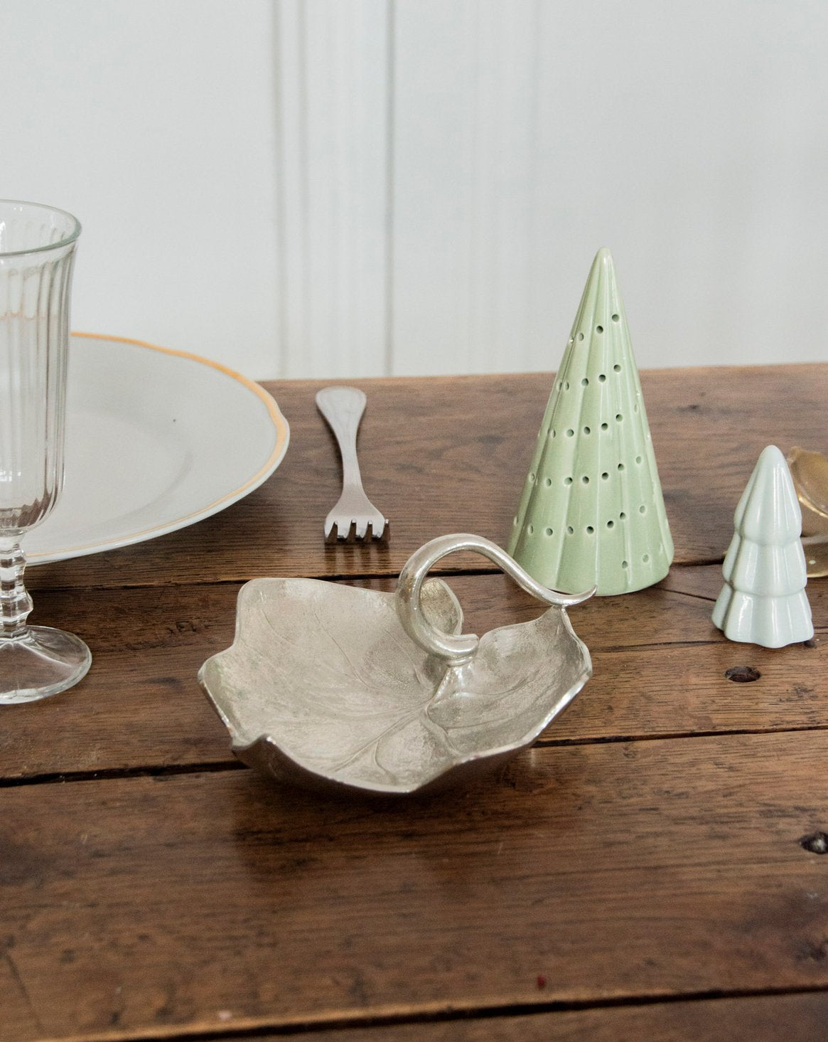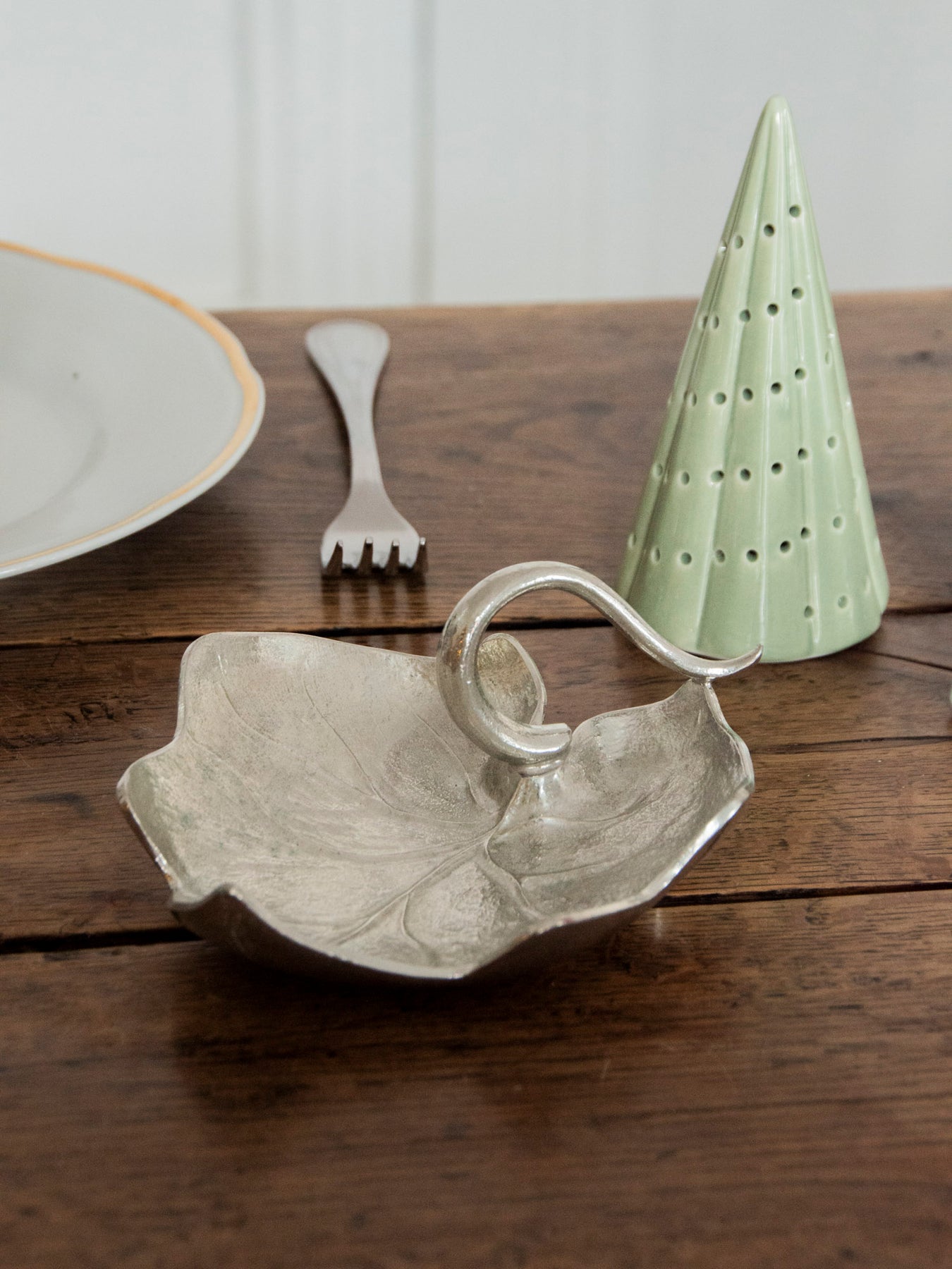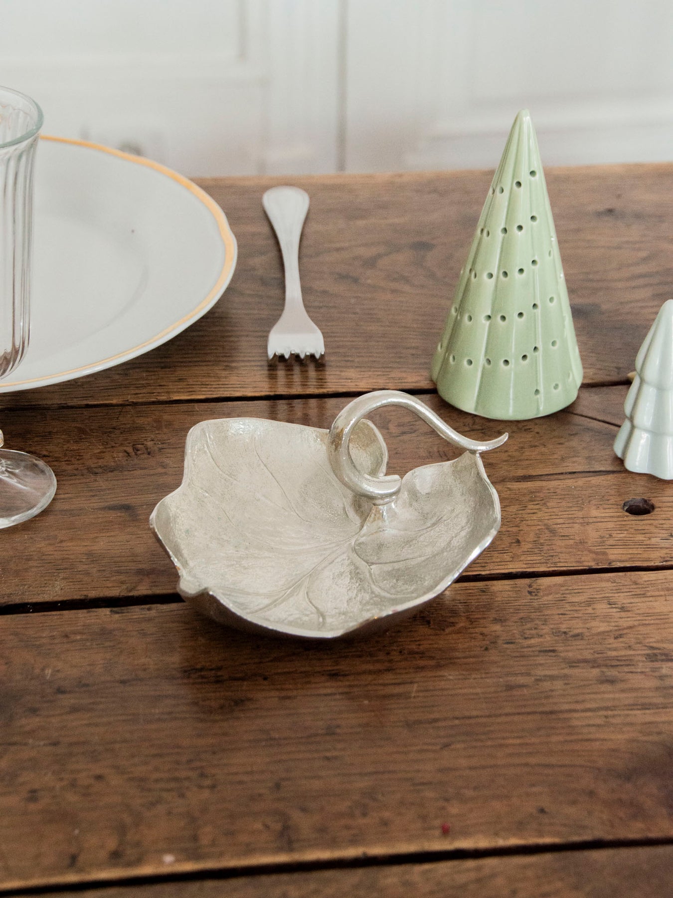 Add this leaf-shaped metal valet tray to your entryway or living room: it gently and stylishly holds keys, coins, and small jewelry. Its metal, crafted in delicate curves, evokes a light presence that integrates easily on a console table, shelf, or coffee table. Designed to organize everyday essentials without cluttering the space, it offers a discreet and decorative storage solution. A useful object that brings a touch of nature and graphic design to your interior.