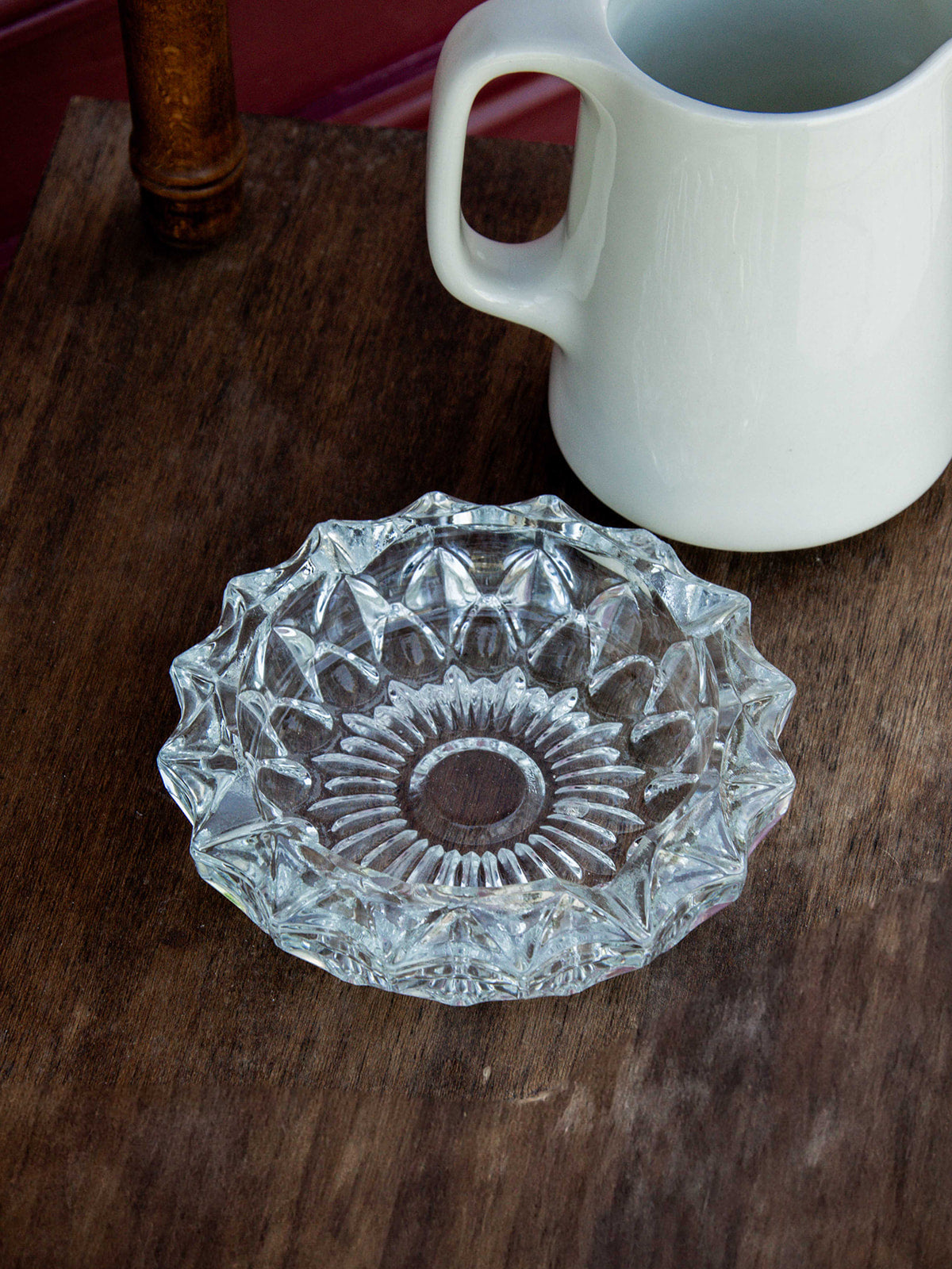 Discover this magnificent sculpted glass ashtray, adorned with delicate details that give it a unique elegance. A few chips, almost invisible vestiges of time, add to its charm and authentic character. Perfect for adding an artistic touch to your home, it will easily find its place on a table or in a living room, enhancing your decor with refinement.