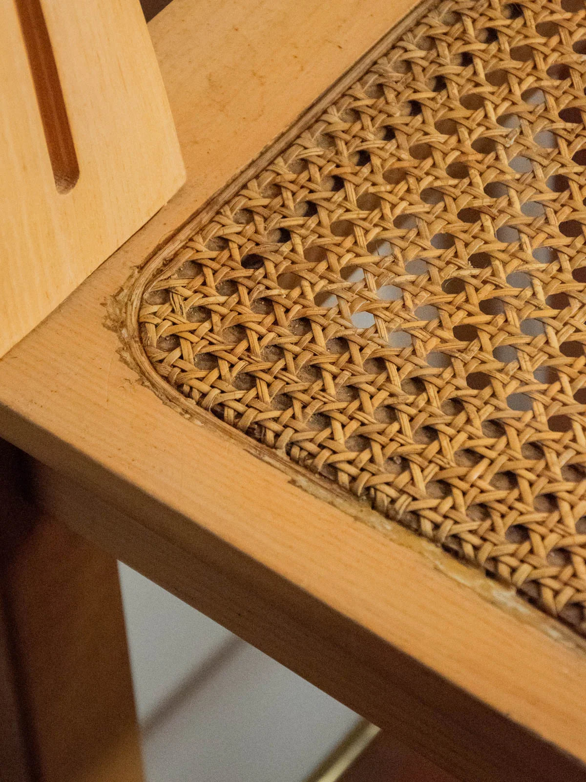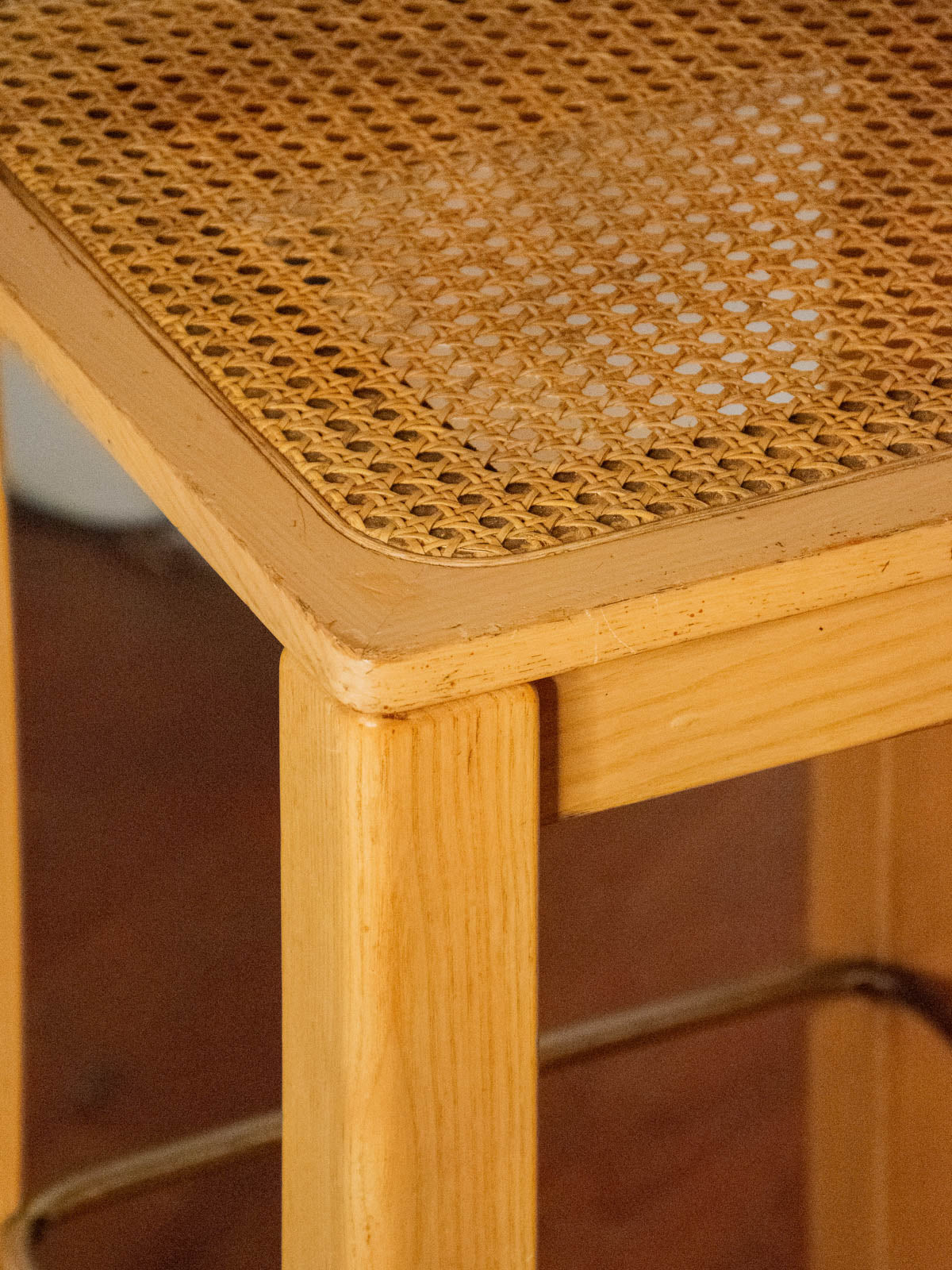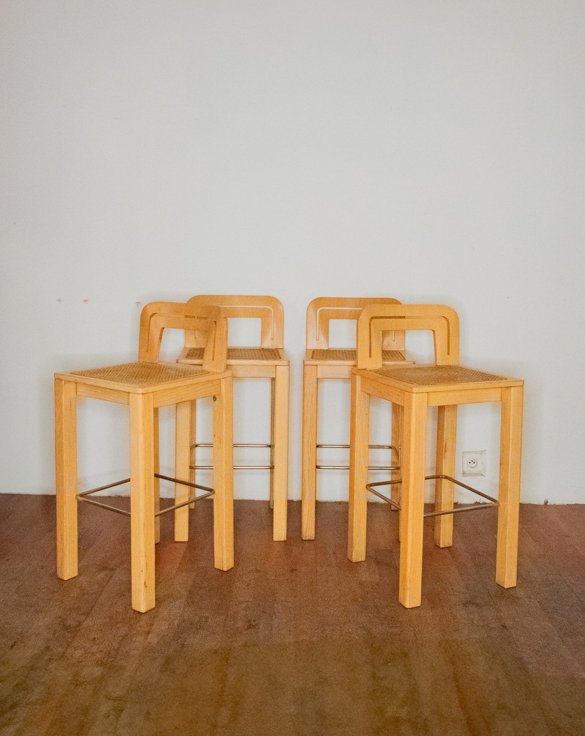 Invite this set of four 1970s bar stools, crafted from light wood with restored caning, into your space for a modern retro touch. Their slender proportions and lightweight seats fit easily around a counter or island, offering both comfort and conviviality. The warm wood complements the textured caning, bringing transparency and character to a contemporary kitchen or cozy bar area, creating an atmosphere that is both welcoming and refined.