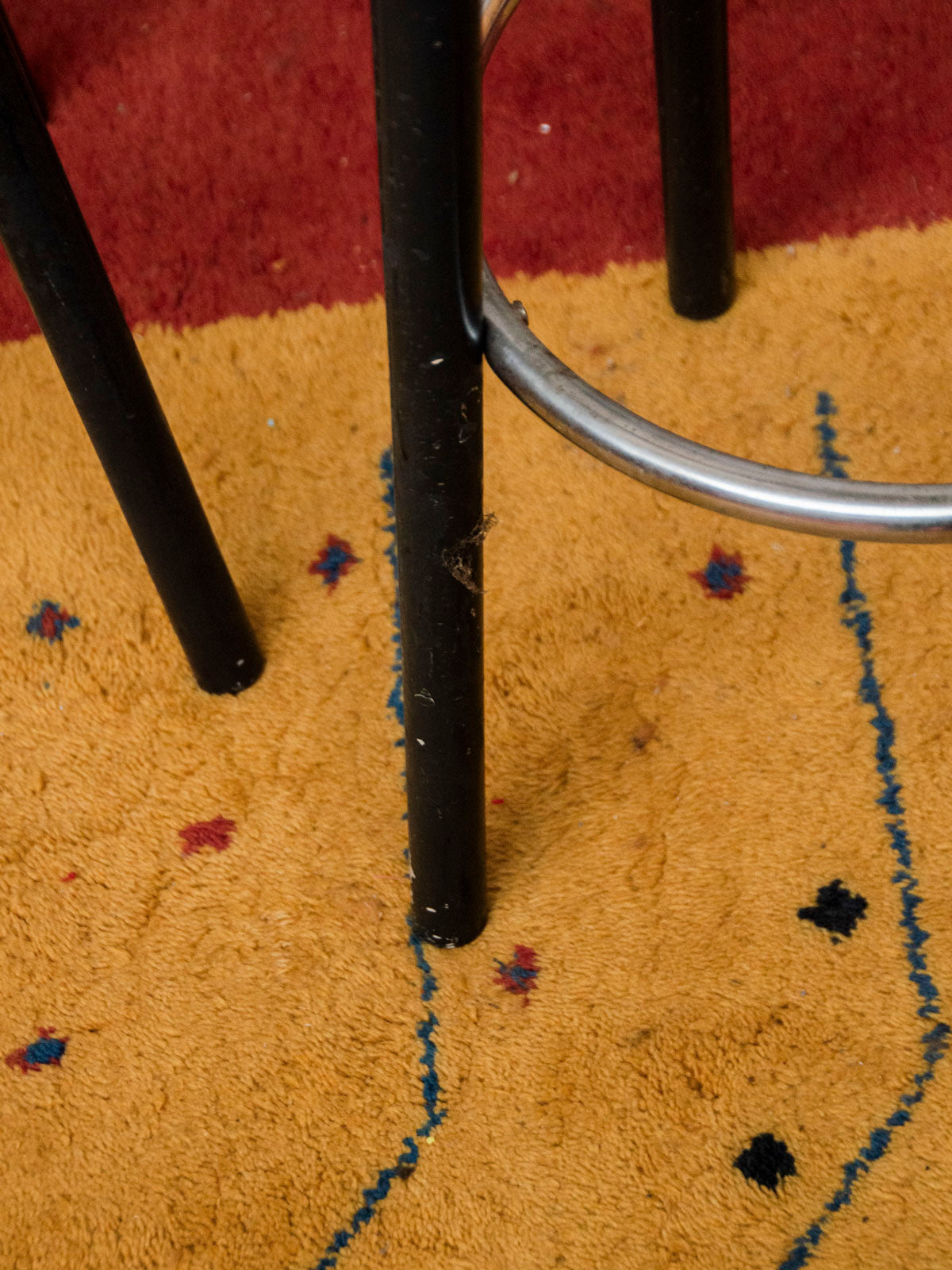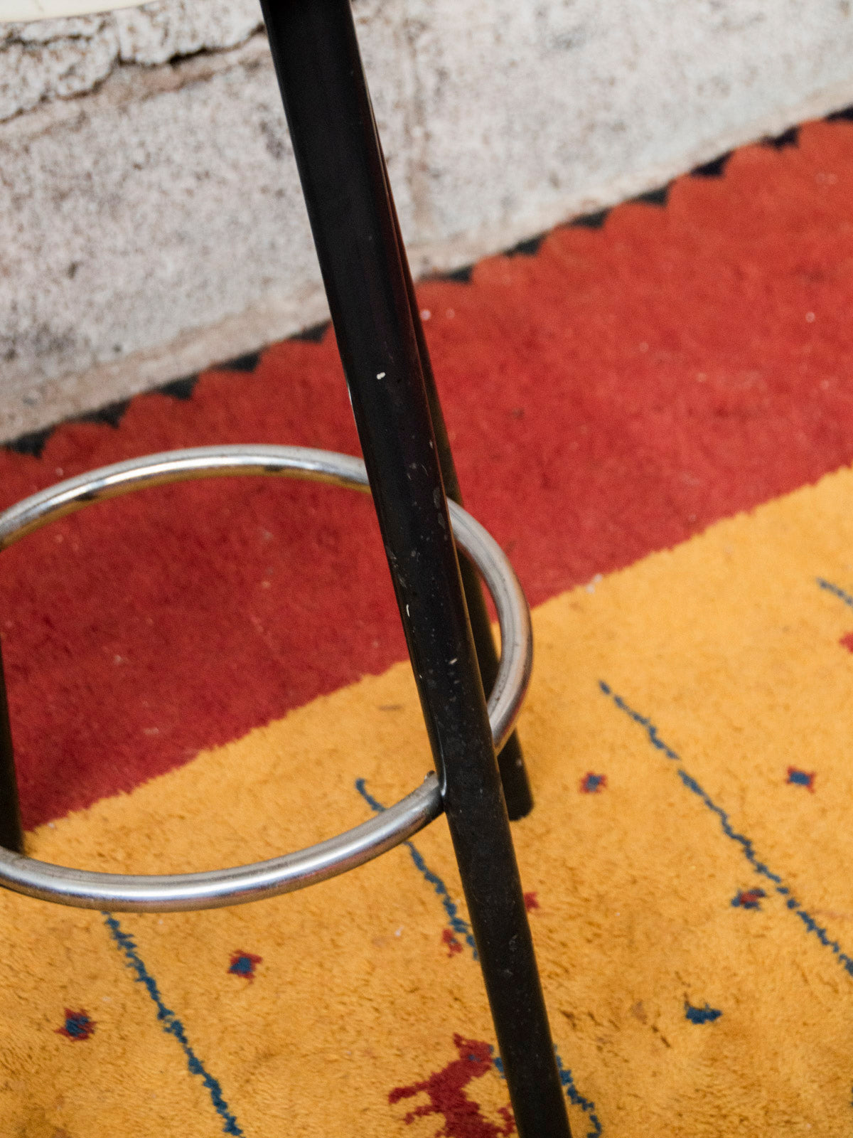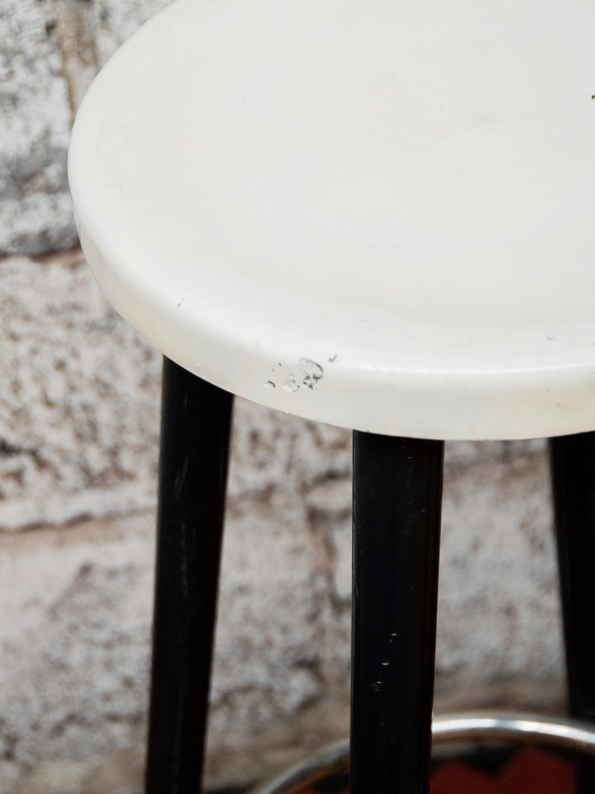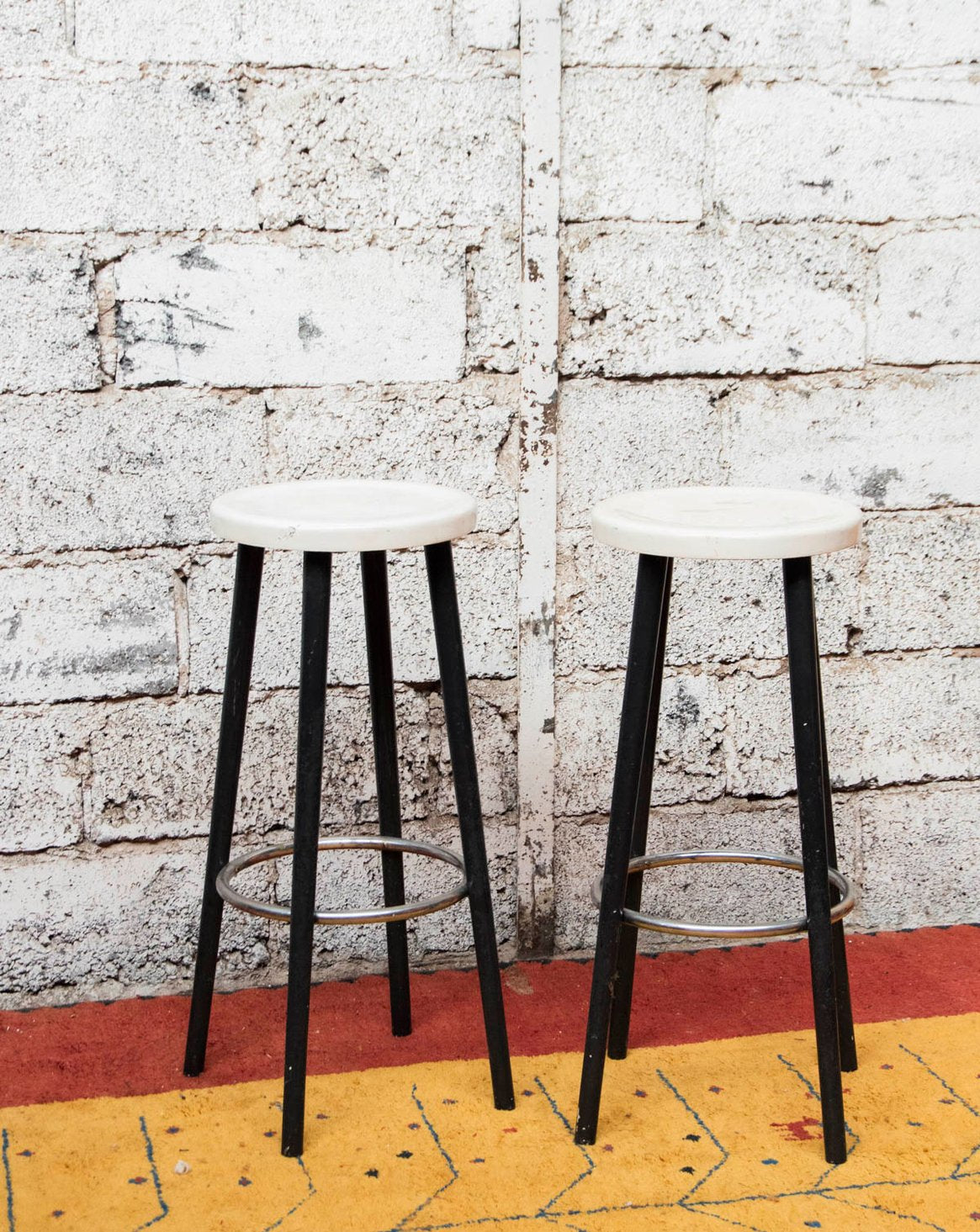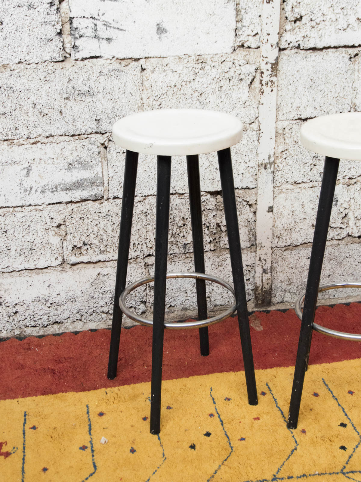 Discover this pair of white plastic bar stools, featuring black legs and a chrome metal footrest, with a modern and contrasting design. Their slender height is suitable for an indoor counter or bar, offering functional and easy-to-maintain seating for everyday use, and bringing a contemporary and warm touch to the kitchen or a convivial space. Damaged seats.