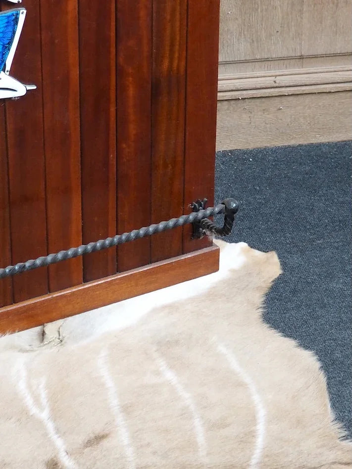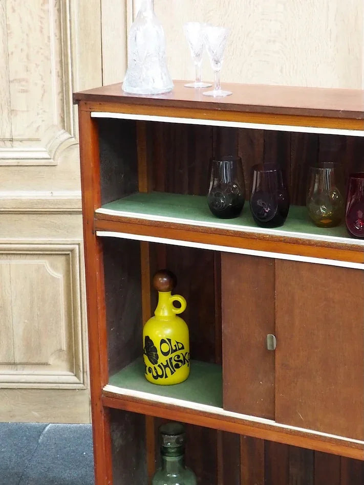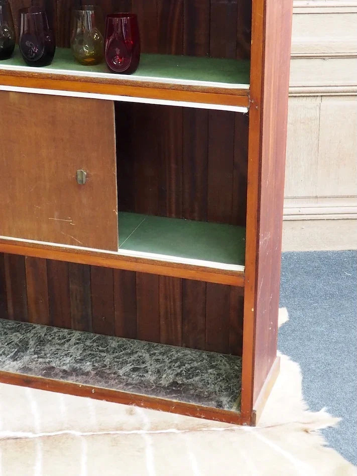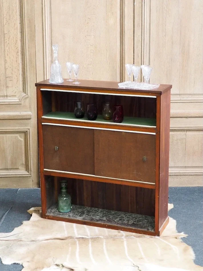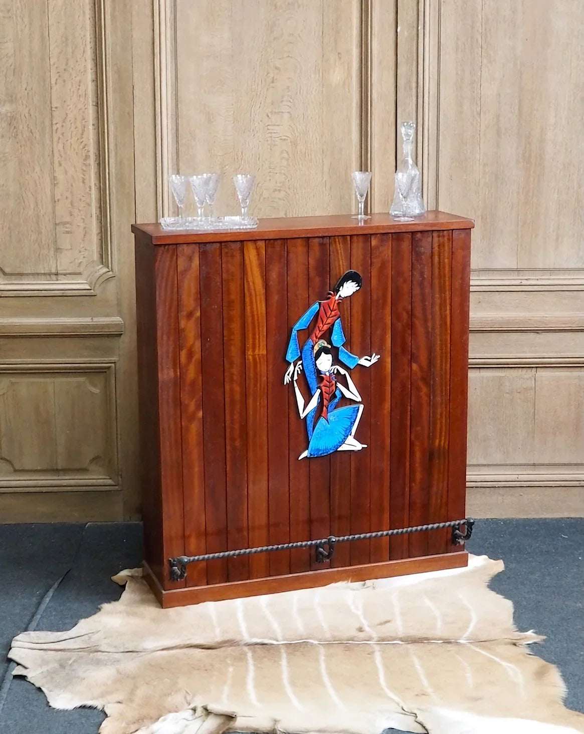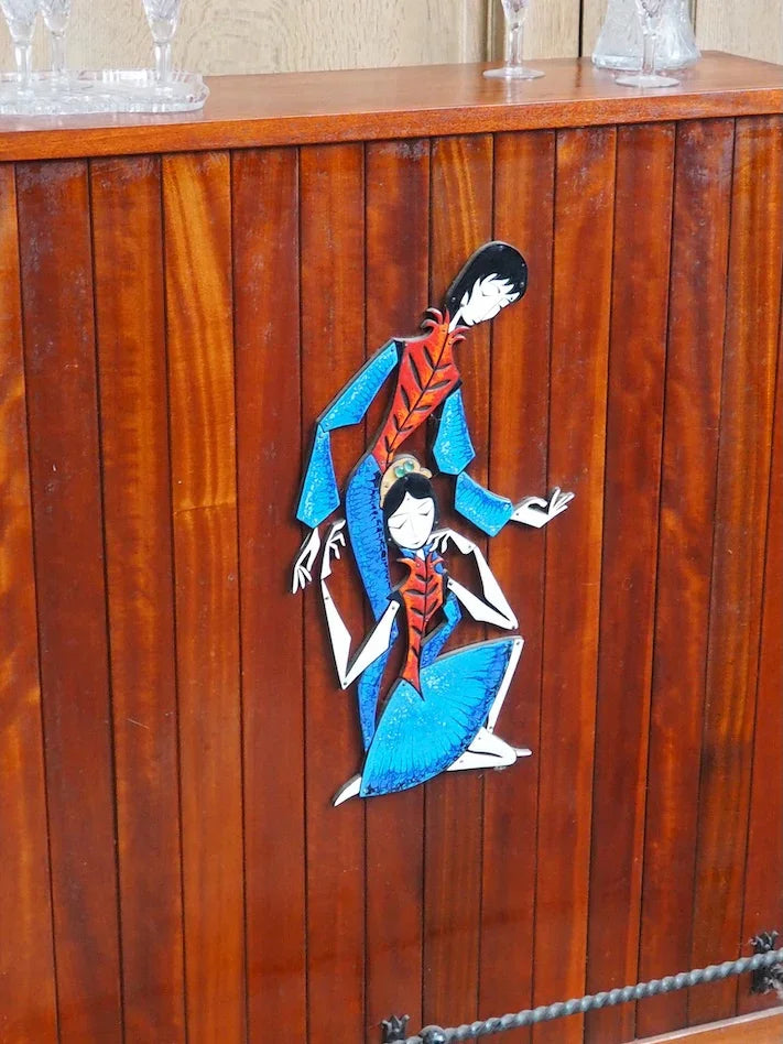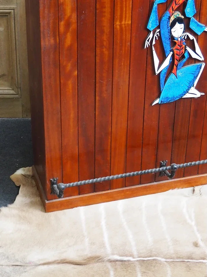 Elevate your living room with this 1950s/60s teak and mahogany bar cabinet. Its vertical lines create an elegant presence without cluttering the space. The enclosed niche offers organized storage for bottles and glasses, while the enameled metal plaque adorned with an Indonesian scene adds a touch of exotic charm. The black twisted wrought iron footrest highlights the handcrafted character and robust construction, perfect for creating a warm and inviting atmosphere for your gatherings.