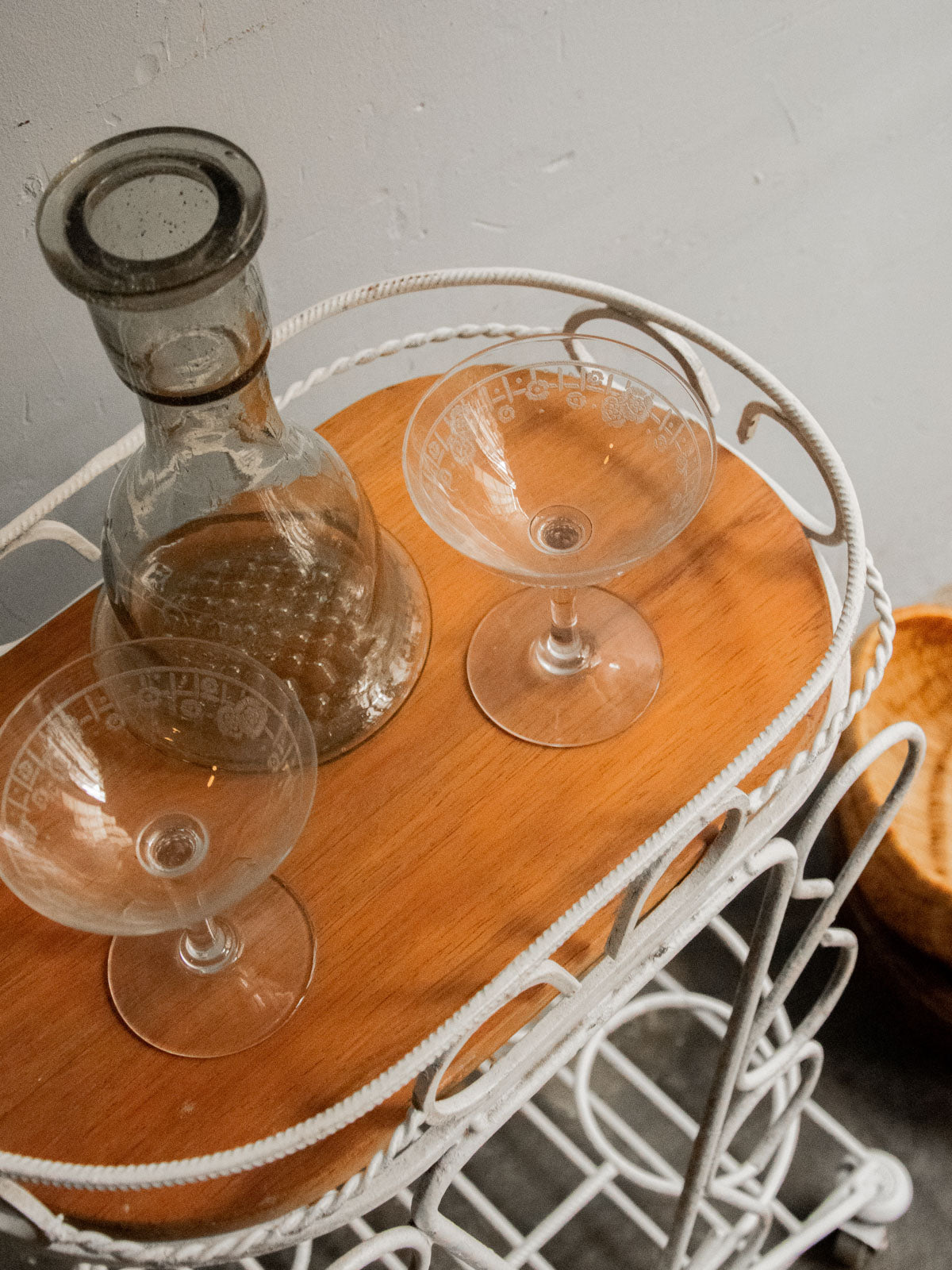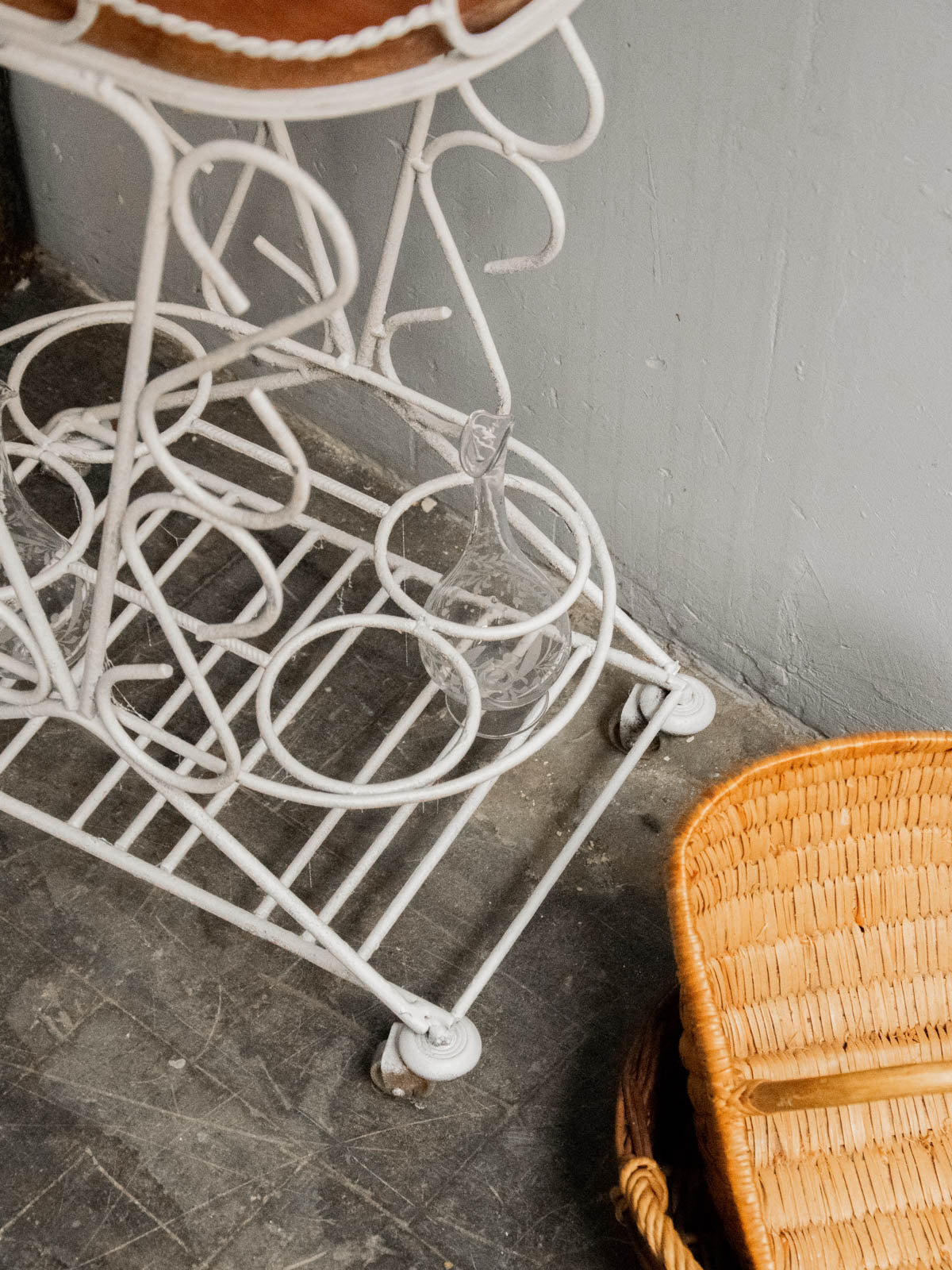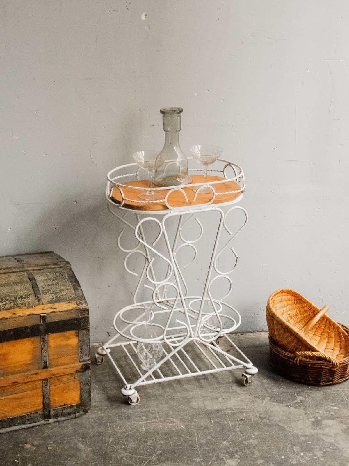 Embrace this small rolling bar with its delicate lines, combining a removable rounded wooden top with a forged metal frame for an elegant balance of warmth and sturdiness. Designed for a compact size, it holds four bottles in designated slots, rests on a lower shelf useful for glasses and accessories, and moves easily to streamline your gatherings. Ideal for casual drinks on a balcony or in a living room, it creates an intimate and sophisticated atmosphere.