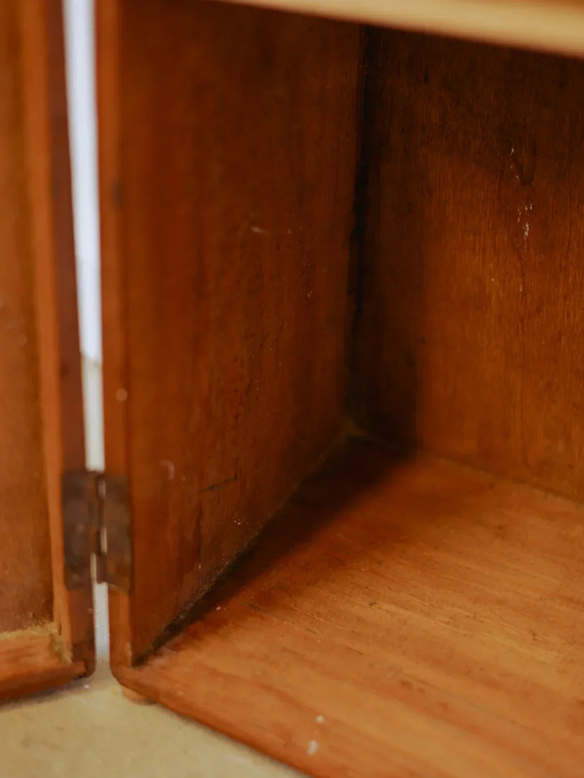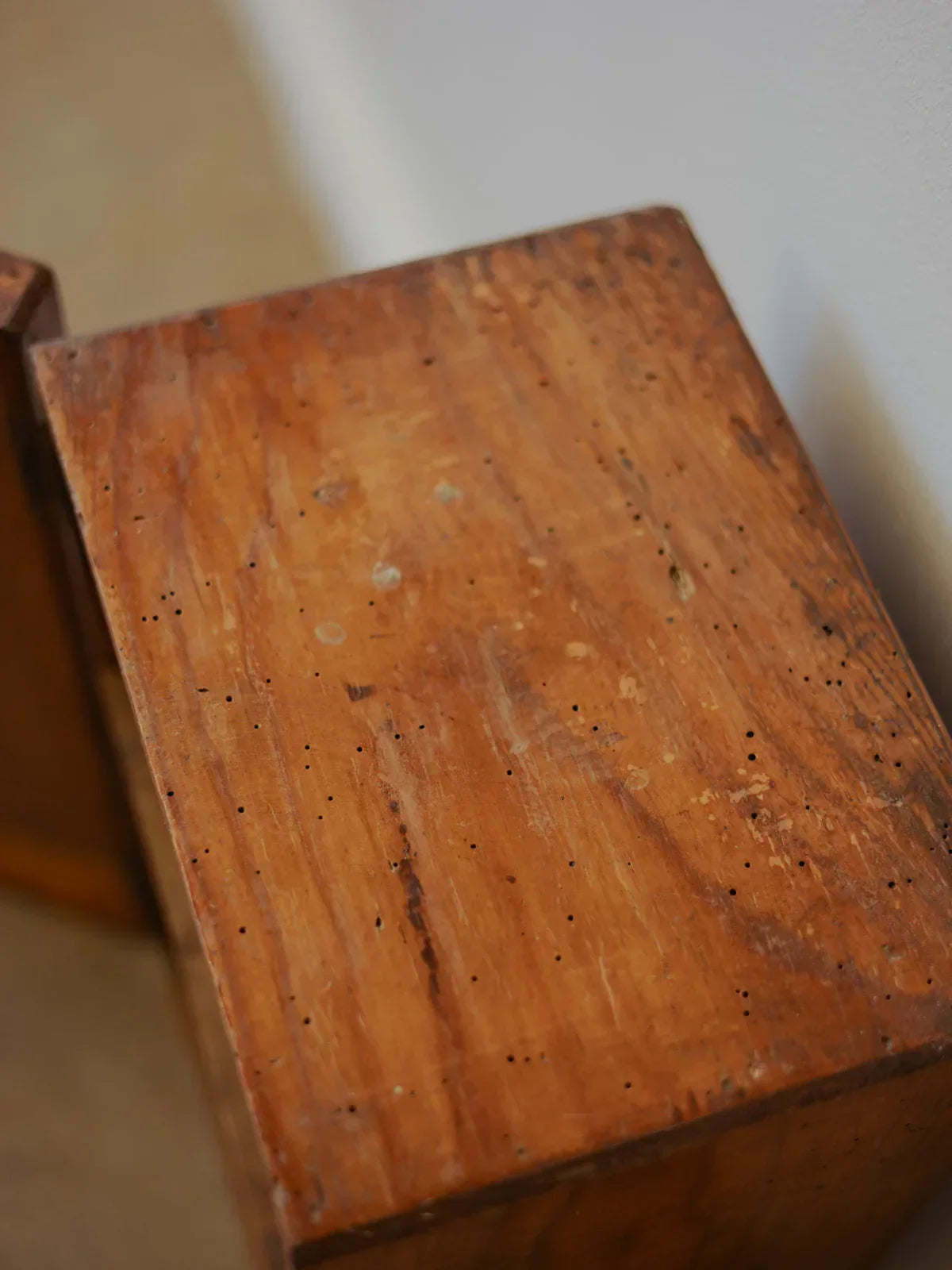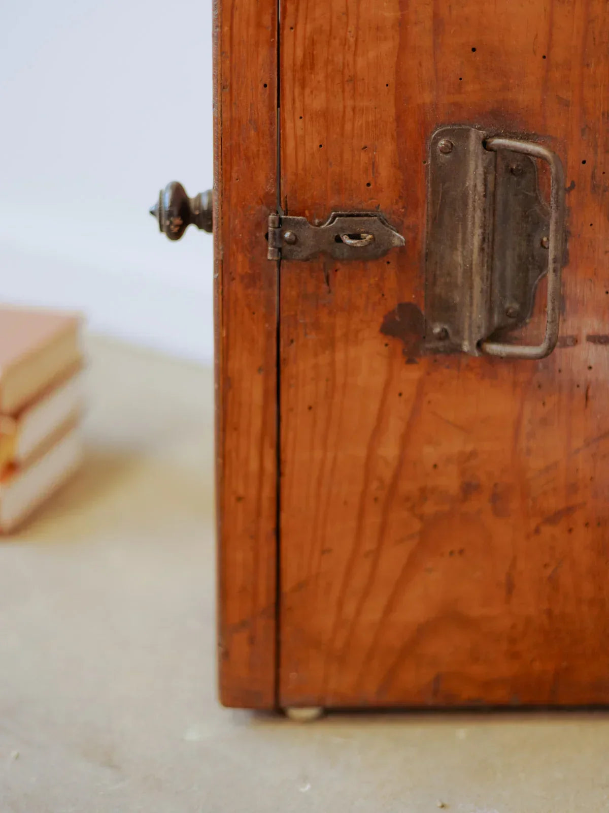 Create a welcoming, travel-inspired atmosphere with this small trunk reimagined as a mini bar. Made of patinated wood, it features a metal strap and knob. Its compact size opens to reveal an interior shelf designed to hold a few bottles and glasses, ideal for a discreet bar area in the living room or dining room. The contrasting materials add a refined, vintage touch to your décor. Signs of age and treated woodworm are present.