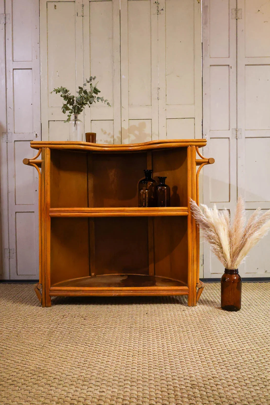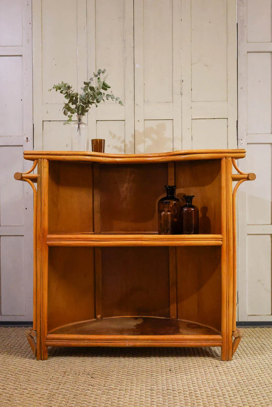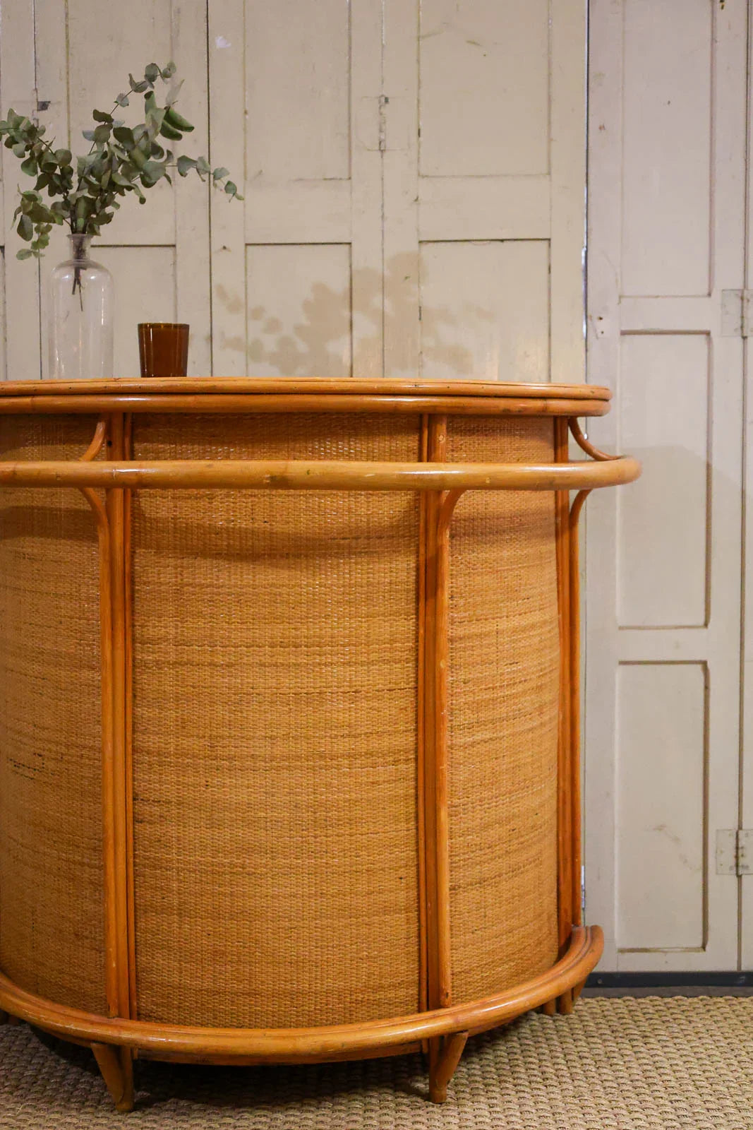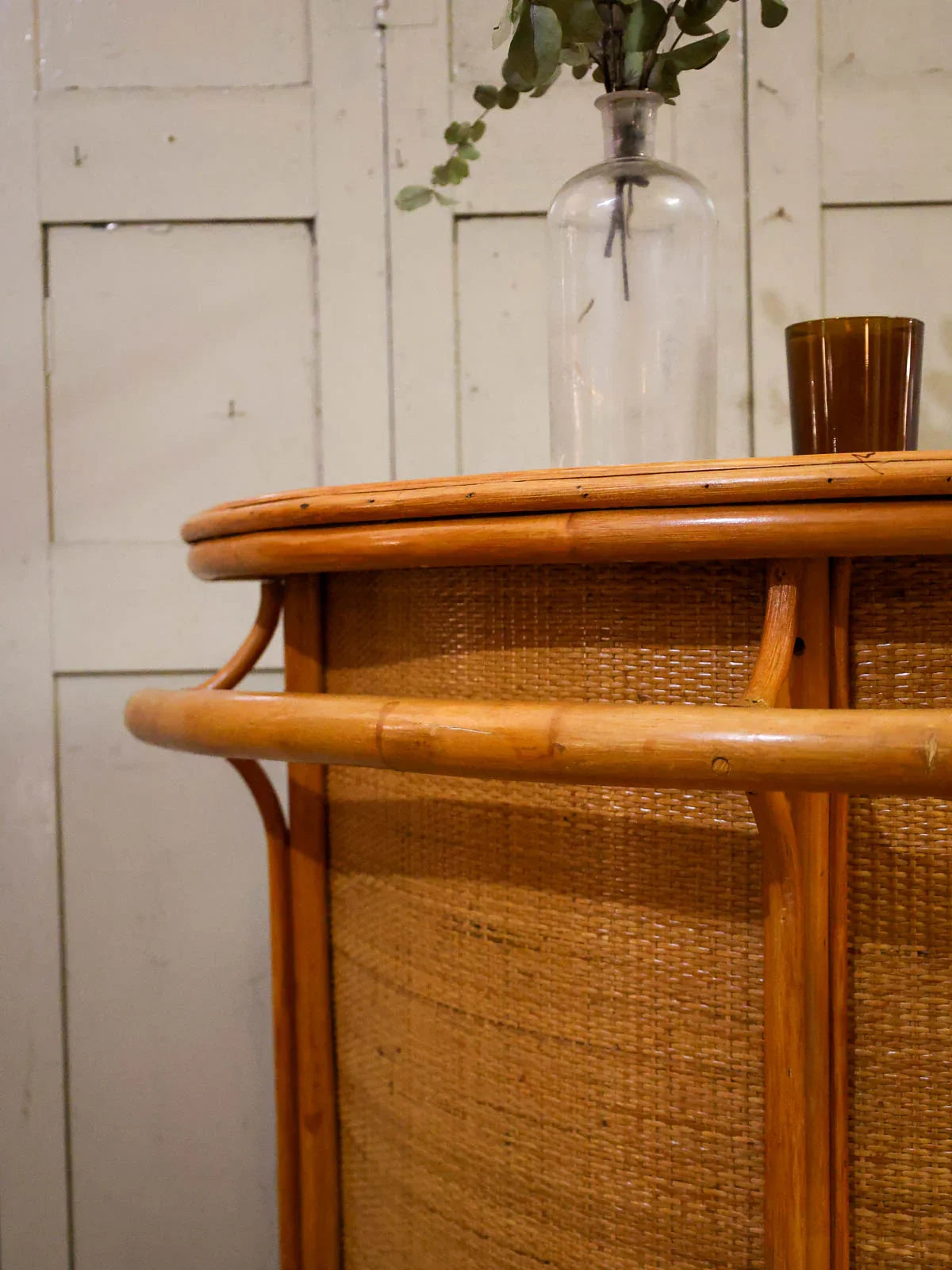 Bring a touch of bohemian chic to your home with this rattan bar, combining lightness and natural warmth. Its rounded shape and wide serving surface accommodate bottles and glasses, while an integrated shelf optimizes storage for entertaining essentials. The handcrafted weave and soft hue introduce an authentic texture that softens the ambiance, ideal for a convivial aperitif corner in the living room, kitchen, or conservatory, instantly creating a relaxed and elegant atmosphere. Signs of wear present.