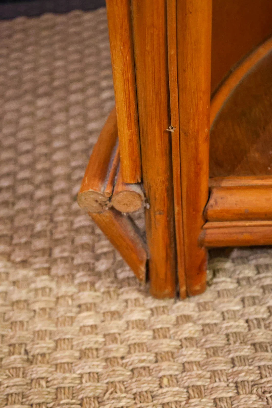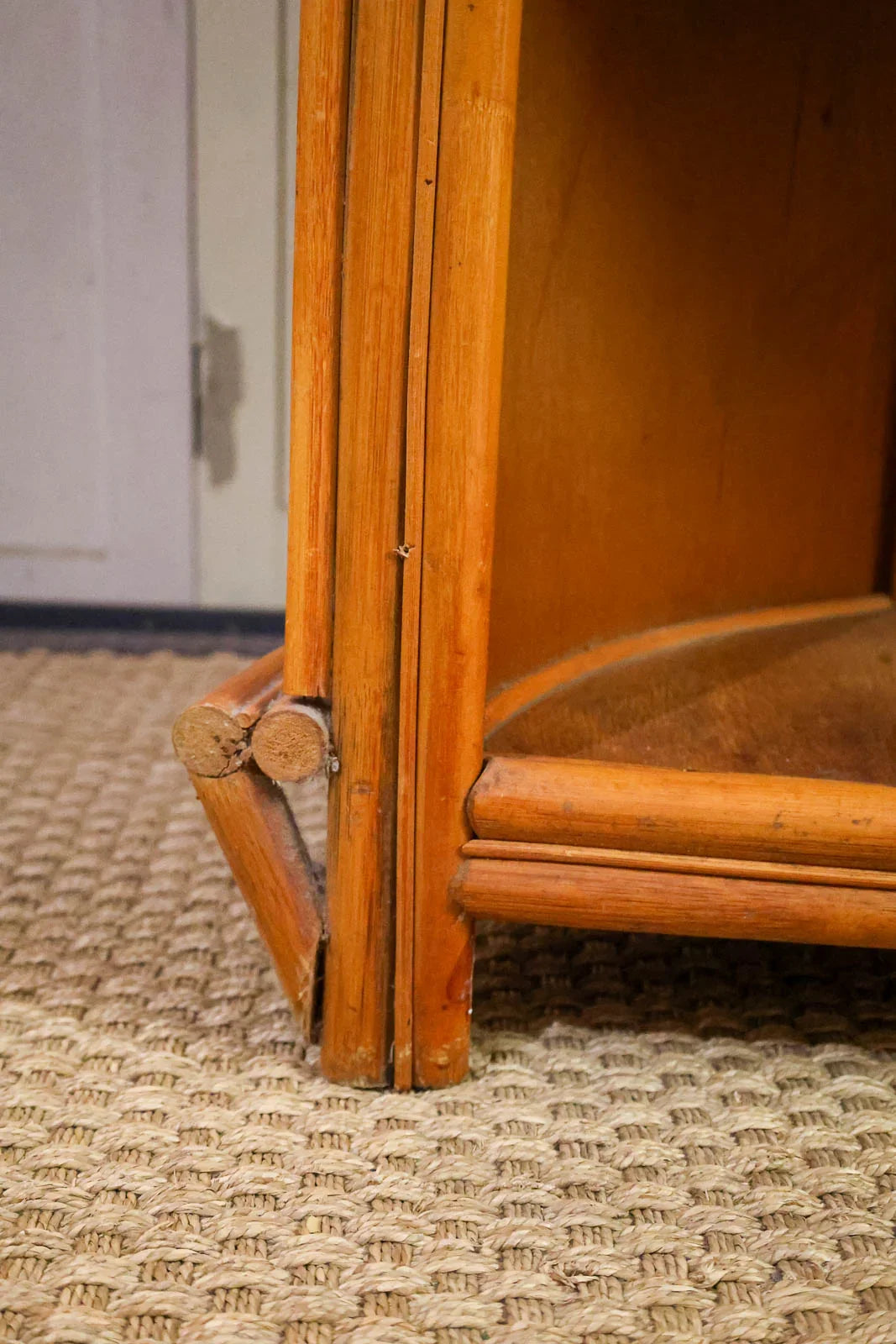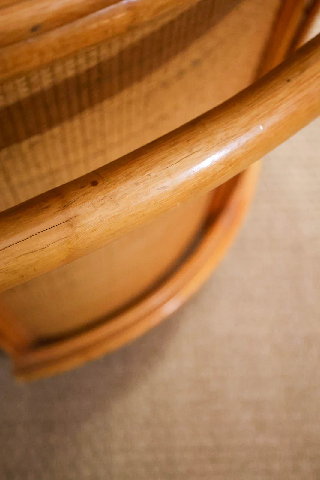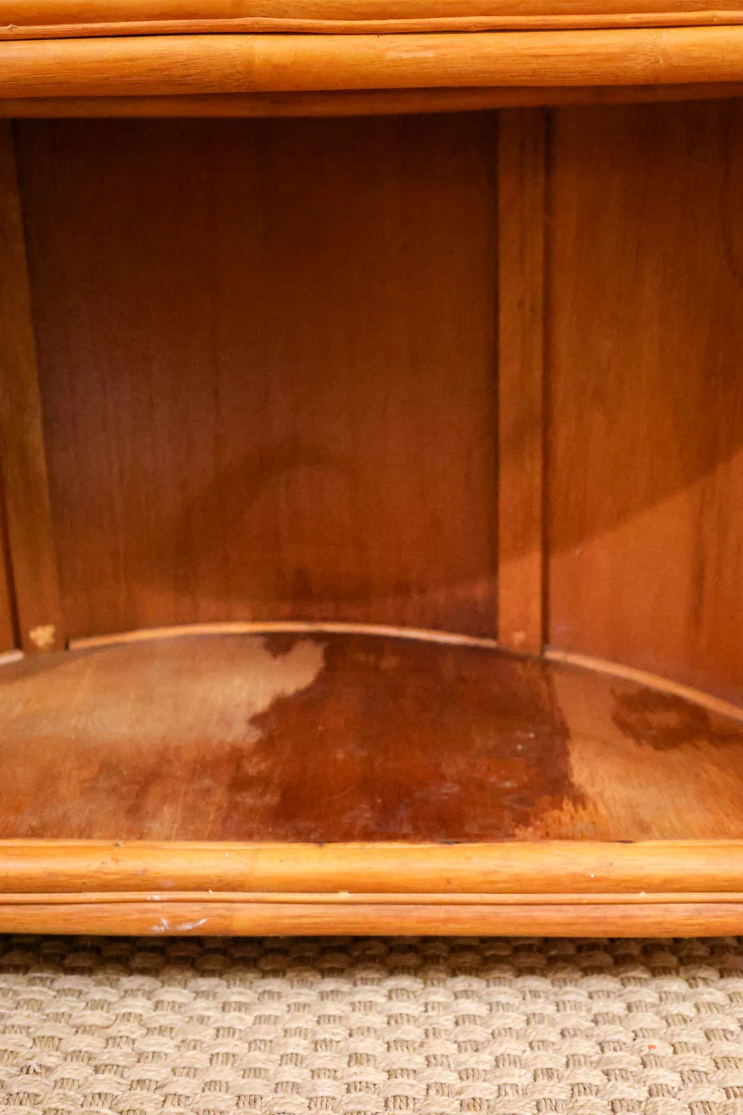 Bring a touch of bohemian chic to your home with this rattan bar, combining lightness and natural warmth. Its rounded shape and wide serving surface accommodate bottles and glasses, while an integrated shelf optimizes storage for entertaining essentials. The handcrafted weave and soft hue introduce an authentic texture that softens the ambiance, ideal for a convivial aperitif corner in the living room, kitchen, or conservatory, instantly creating a relaxed and elegant atmosphere. Signs of wear present.