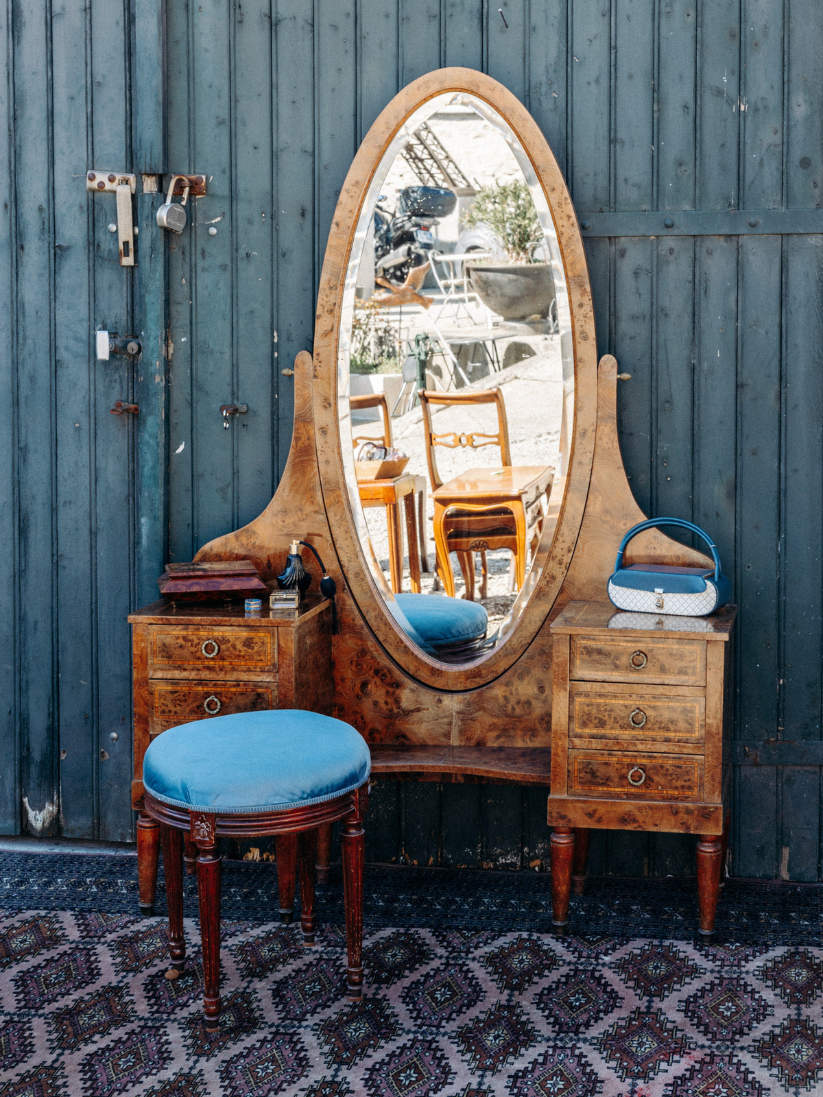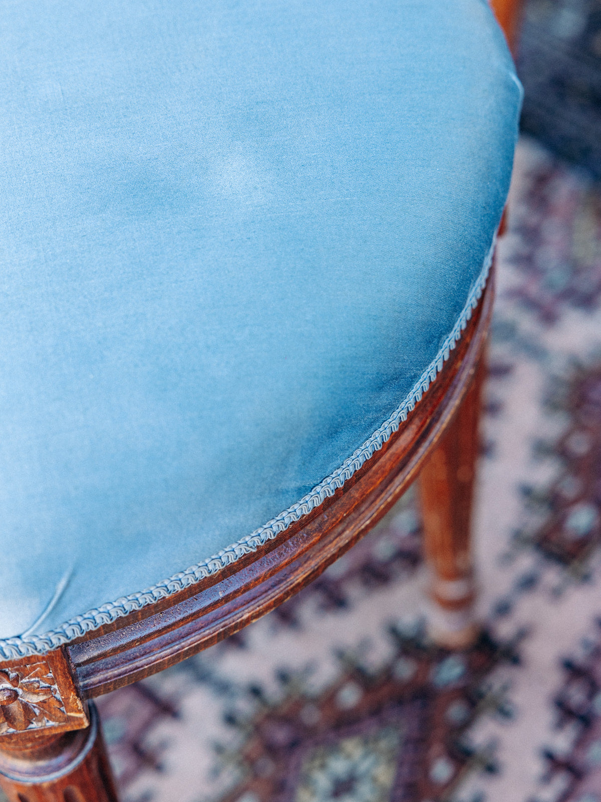 Rediscover the charm of vintage furniture with this wooden stool with fluted legs, combining elegance and authenticity. Its delicately engraved seat is upholstered in a satin blue fabric, bringing a chic touch to your home. The slight marks of time bear witness to its history without altering its unique look. An ideal accessory to enhance your decor with refinement.