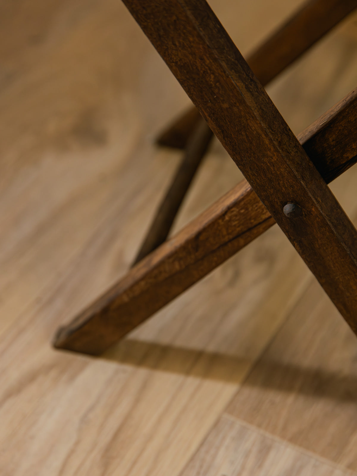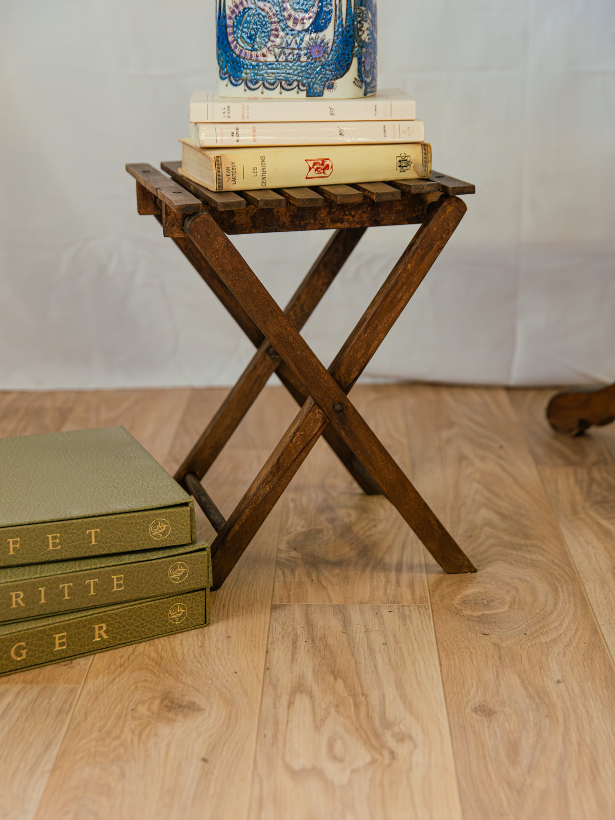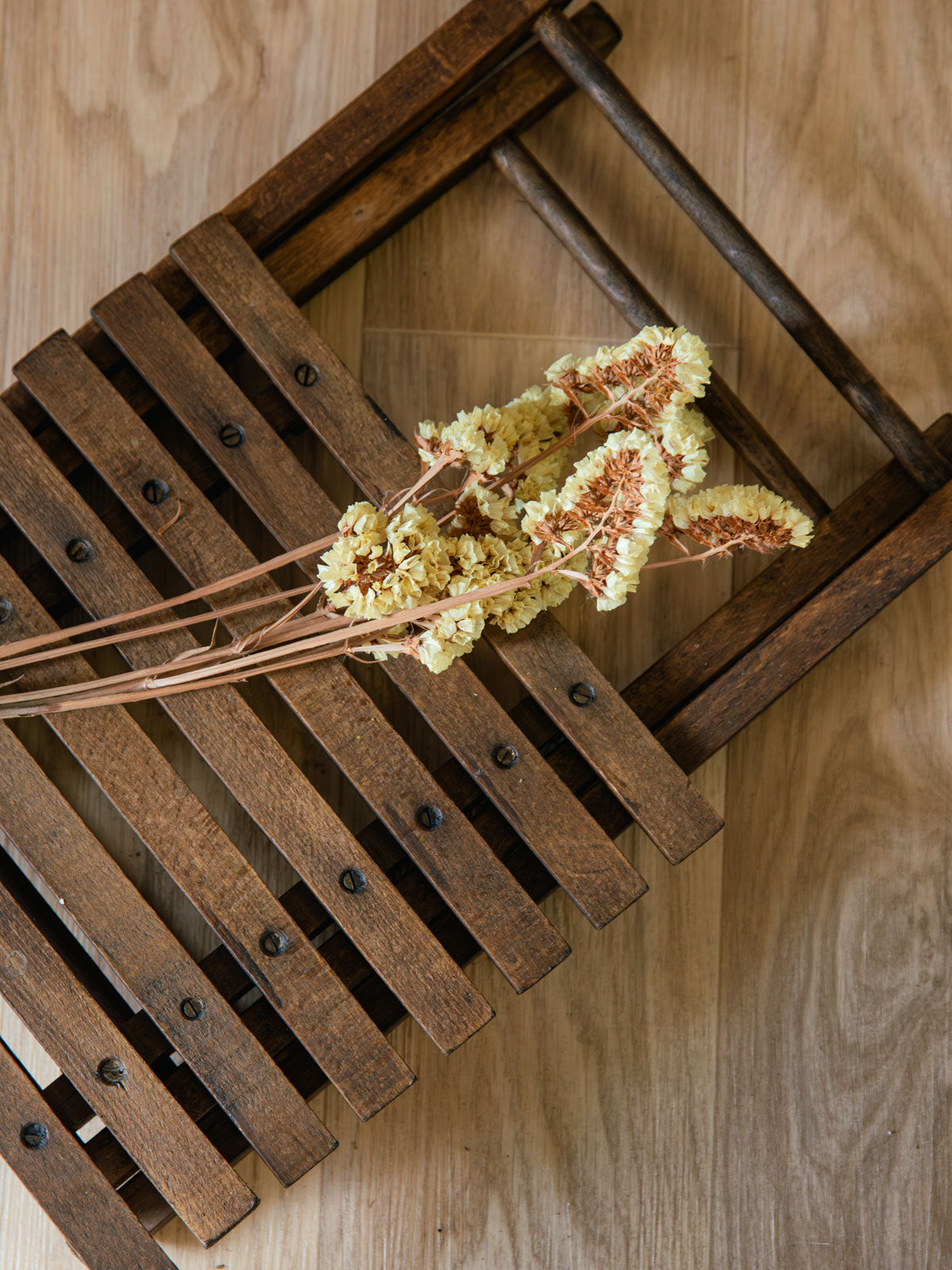 Embrace this charming folding wooden stool, featuring a slender slatted seat and a lightweight frame that folds flat for easy storage. Its dark wood finish and elegant proportions give it a timeless appeal, perfect for a coffee corner, entryway, or as a cozy extra seat. Sturdy and functional, it offers a stable seat while remaining easy to move. Minor signs of age are present.