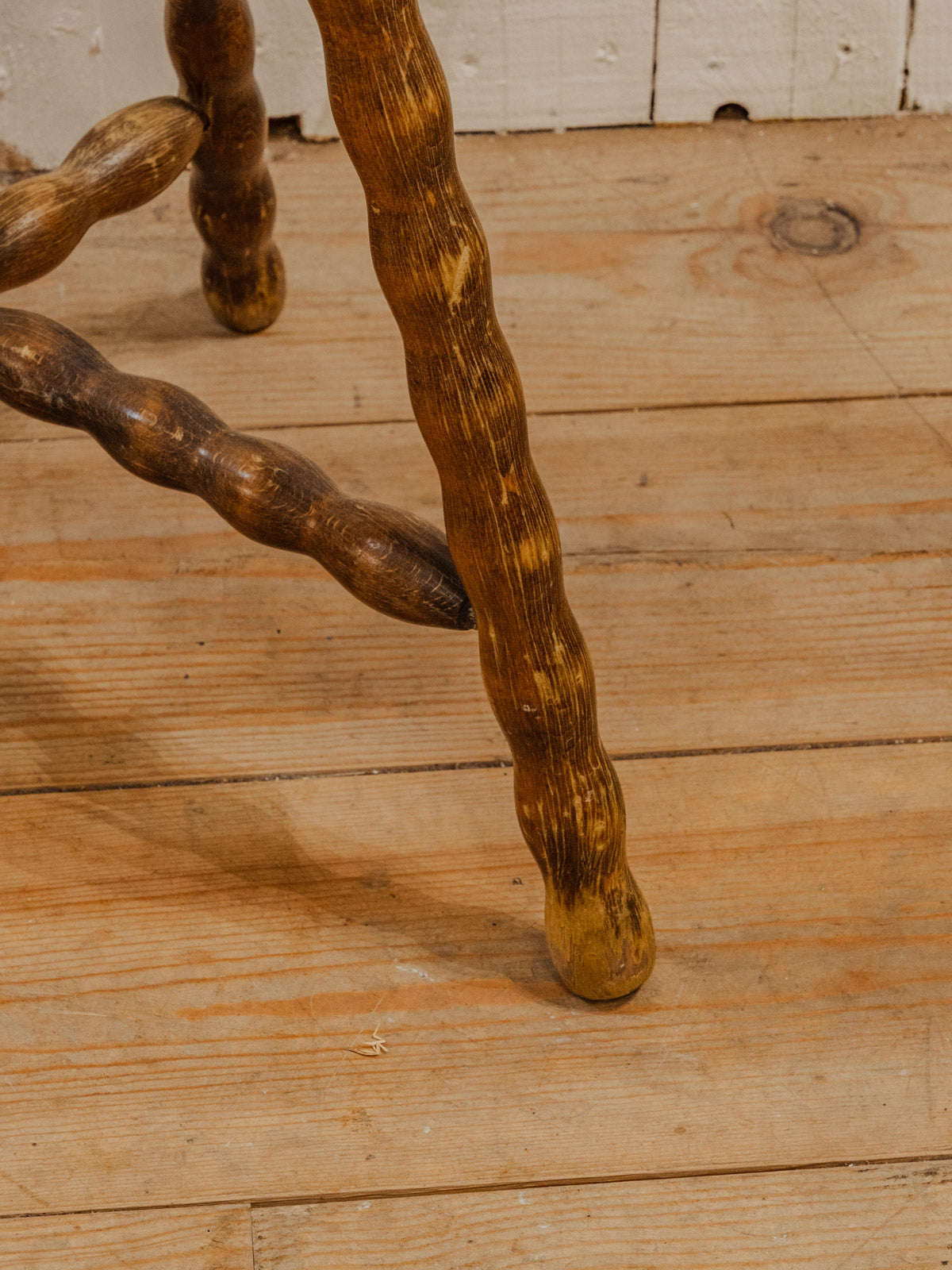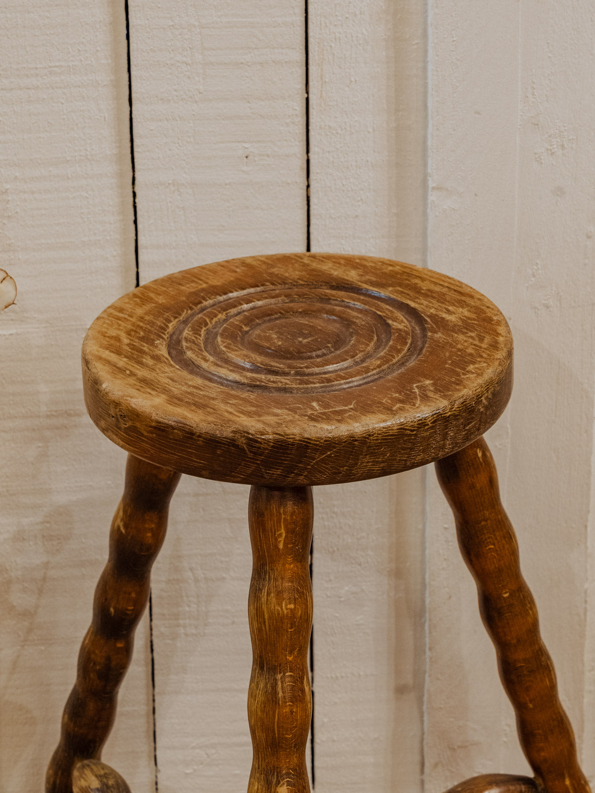 Embrace this wooden stool with its round seat and farmhouse charm that invites simplicity. Its rounded legs and warm grain offer a clean and authentic silhouette, perfect as an extra seat next to a coffee table or as a discreet step stool. Easy to move, it blends seamlessly into a kitchen, entryway, or reading nook for a soft and rustic ambiance. Some signs of age are present.