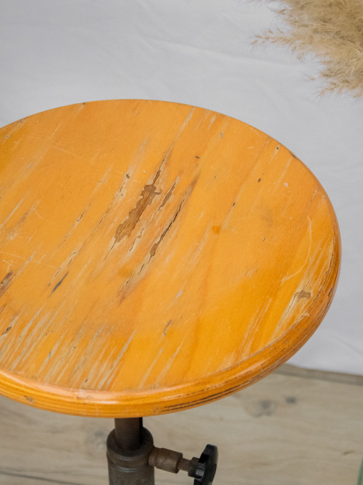 Adopt this industrial workshop stool, combining a round, patinated wooden seat with a sturdy metal frame, for a functional seat and a graphic silhouette; perfect for a work surface, bar, or bistro corner, it brings a warm and authentic loft atmosphere thanks to its raw materials and sculptural presence. Two protective rubber feet are missing, the base has been treated against rust, and the seat's varnish is cracked, attesting to its faithful service. A few signs of wear that only add to its authenticity.