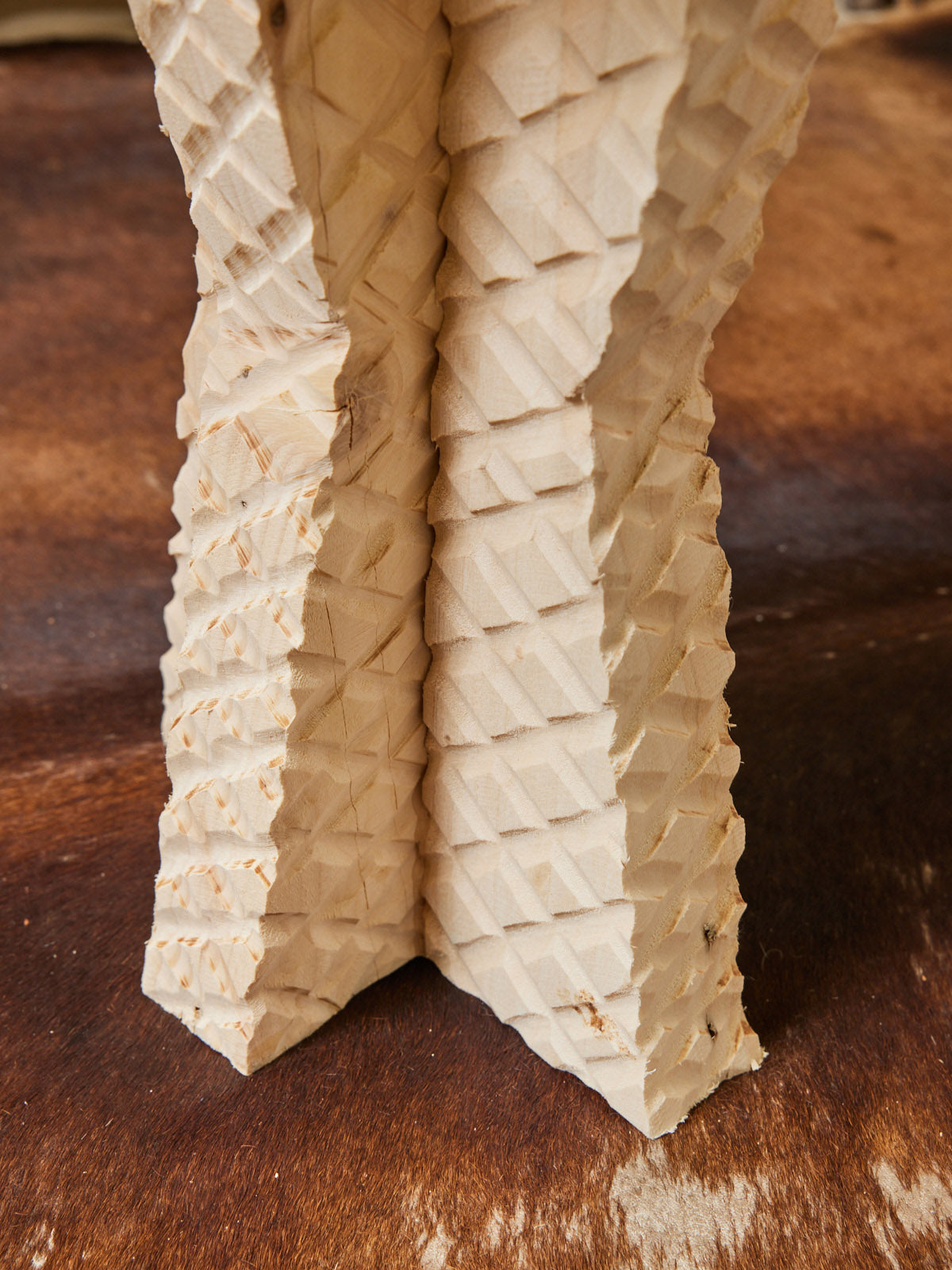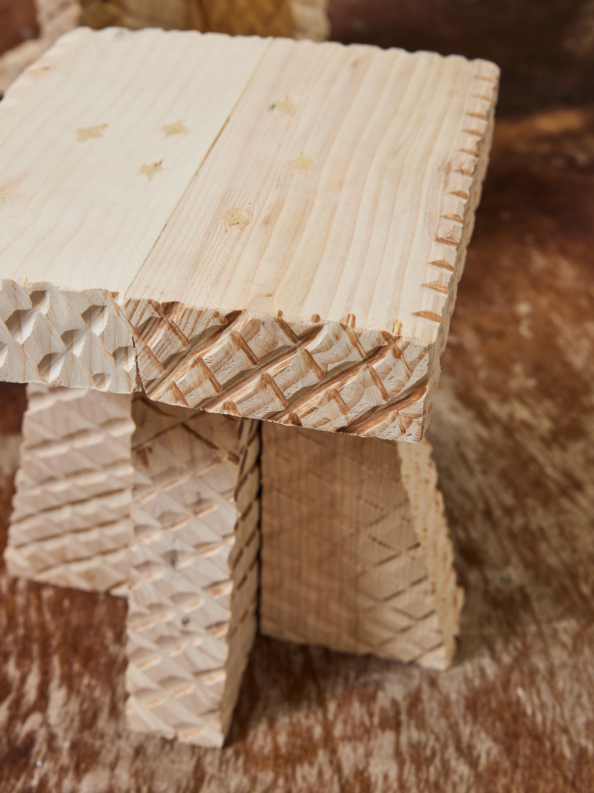 Embrace this trio of handcrafted, Brutalist wooden stools. Their sculptural forms and sharp angles bring a unique presence to your interior. Their robust construction and warm wood grain make them equally at home around a coffee table or as extra seating in a living room or studio; their compact proportions offer comfort and practicality without overwhelming the space. Ideal for contemporary décor with artisanal touches, they create an intimate and creative atmosphere.