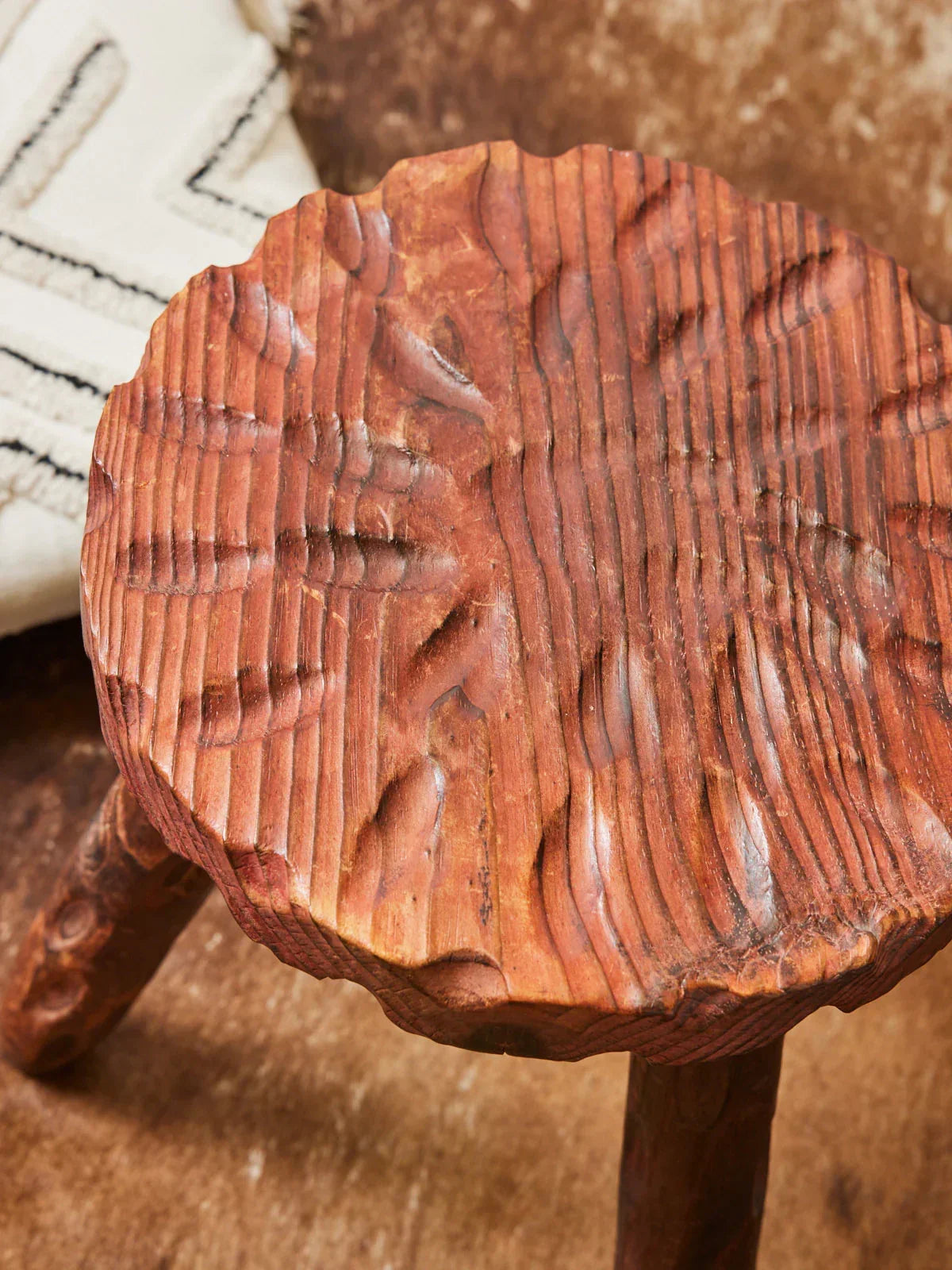 Embrace this round wooden stool, with its sculptural design where solid volumes meet organic curves. The raw, naturally finished material reveals the wood grain and offers a warm and stable seat, perfect as an extra seat or small side table. Its compact proportions fit easily into a reading nook, entryway, or contemporary living room, adding a touch of understated elegance. A piece that is both functional and expressive, creating a chic, workshop-style atmosphere.