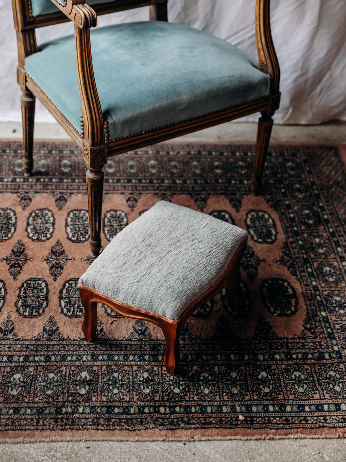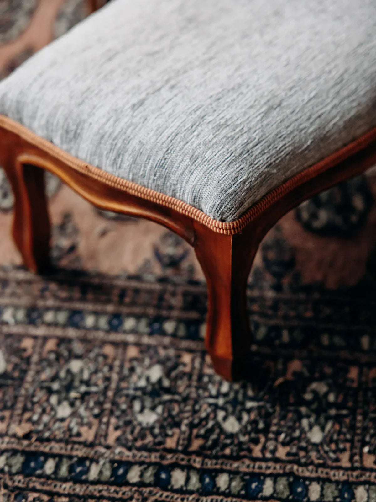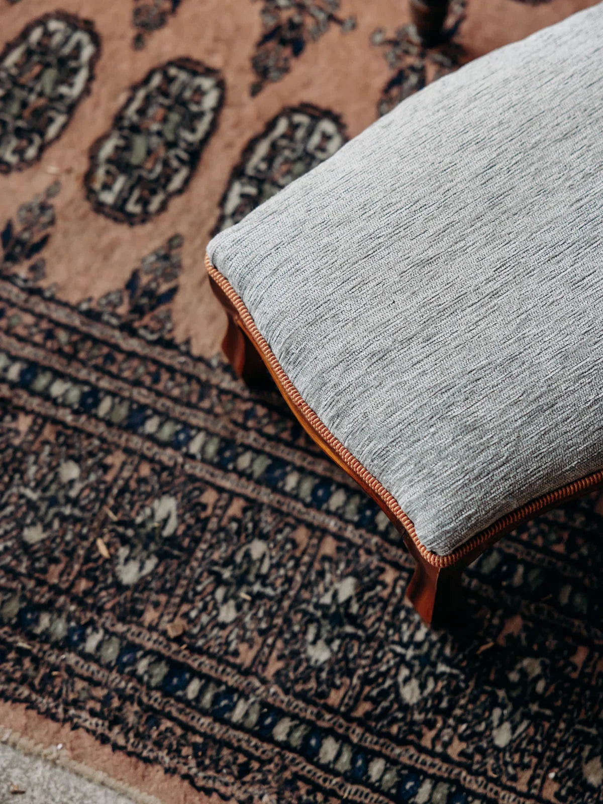 Embrace this small, reupholstered footstool, dressed in gray fabric with orange piping and resting on a delicately lined wooden frame. Its compact size and low profile make it easy to place next to an armchair or sofa, and it can serve as an extra seat or a tray stand. Its understated, contemporary finish adds a warm and graphic touch to a living room or bedroom, perfect for creating a welcoming and bright atmosphere.