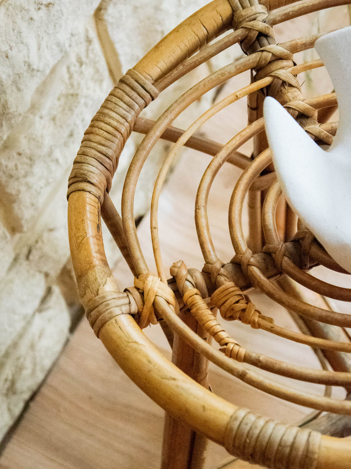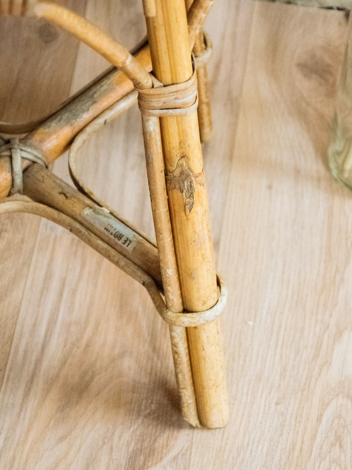Invite this charmingly aged rattan stool into your home. Its light lines and natural weave add a touch of bohemian elegance. Its compact size and plant fiber construction make it an easy-to-place occasional seat, perfect for an entryway, a reading nook, or as a side table. The warmth of the material and the patina tell a subtle story. Minor signs of age are present.