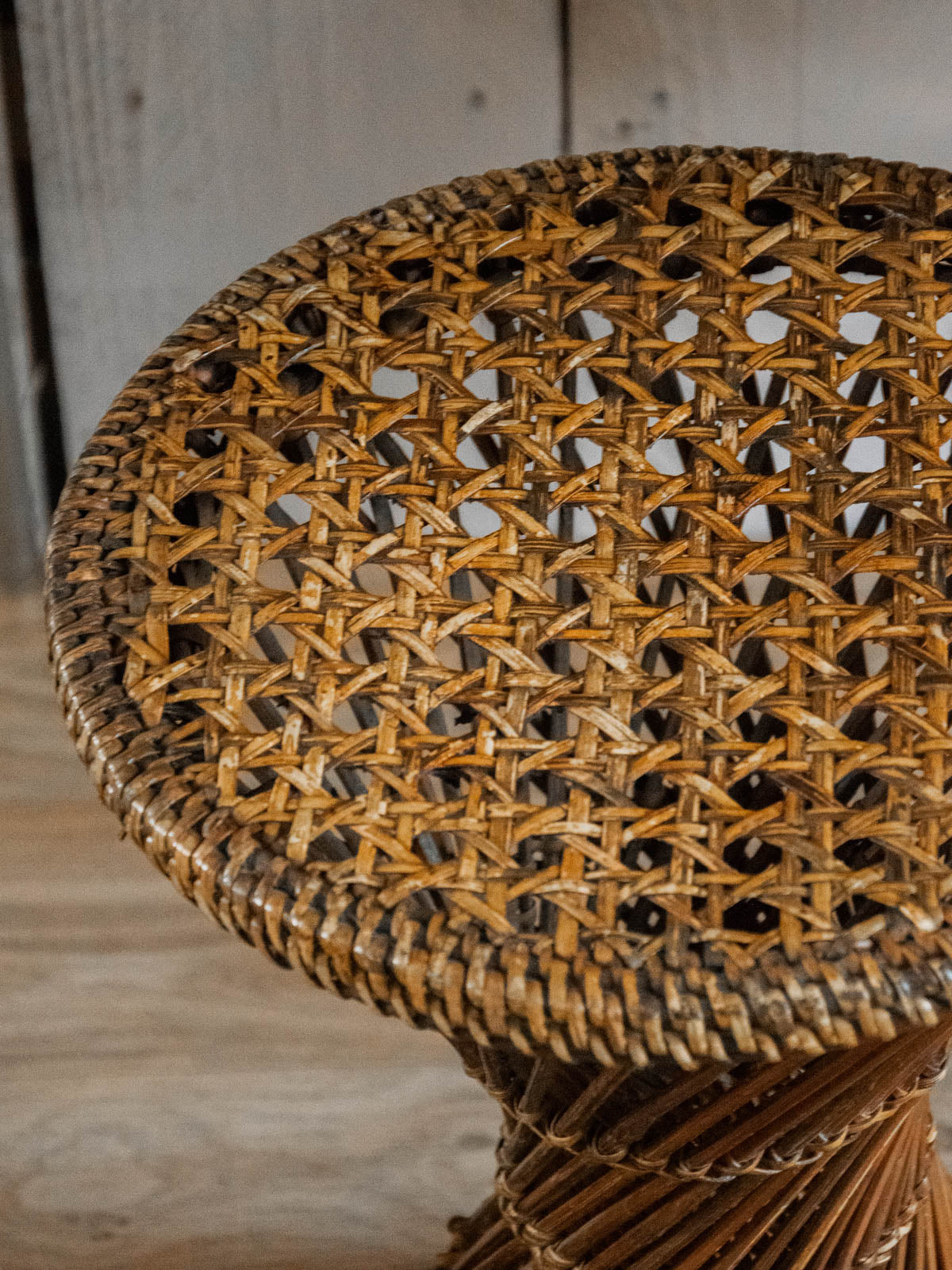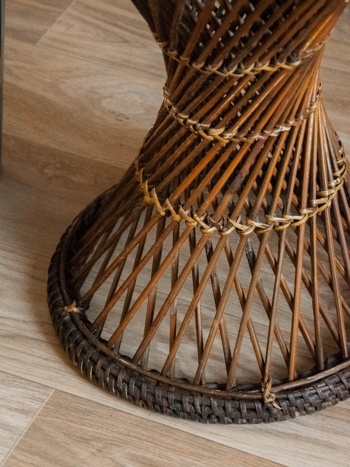 Embrace this dark rattan tam-tam style stool, with its rounded lines and low seat that invites relaxation. Handwoven, its dark rattan provides a warm and natural texture, ideal for complementing a living room corner, an entryway, or serving as a discreet footrest. Its compact silhouette makes it easy to move and versatile, for use as an extra seat or a decorative stand next to a plant or coffee table. Minor signs of age are present.