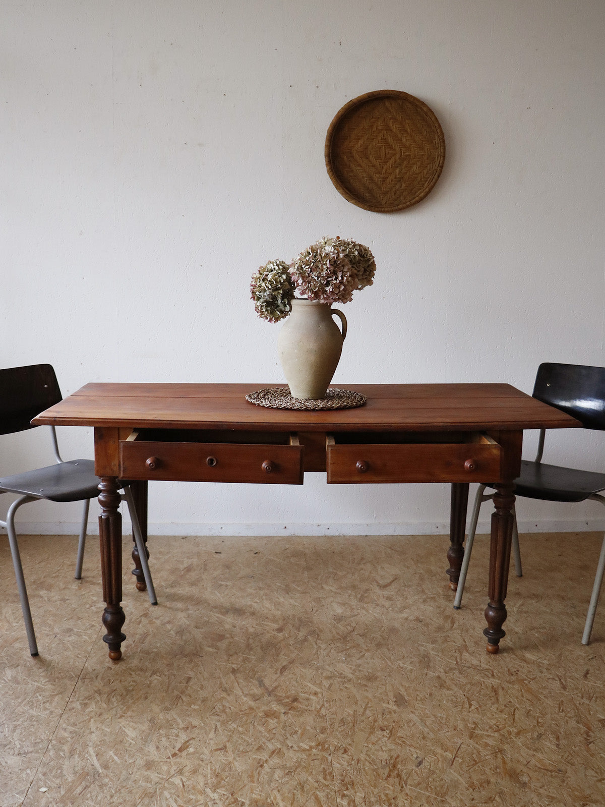 Embrace this antique farmhouse table crafted from solid cherry wood. Its generous proportions make it ideal as a family table or occasional desk. Two discreet drawers offer convenient storage for linens or stationery, while the warmth of the cherry wood and its natural patina create an authentic and inviting atmosphere. Its robust construction encourages everyday use, combining rustic charm with modern functionality. There is some wear on the right-hand drawer. It comfortably seats 4 to 6 people.
