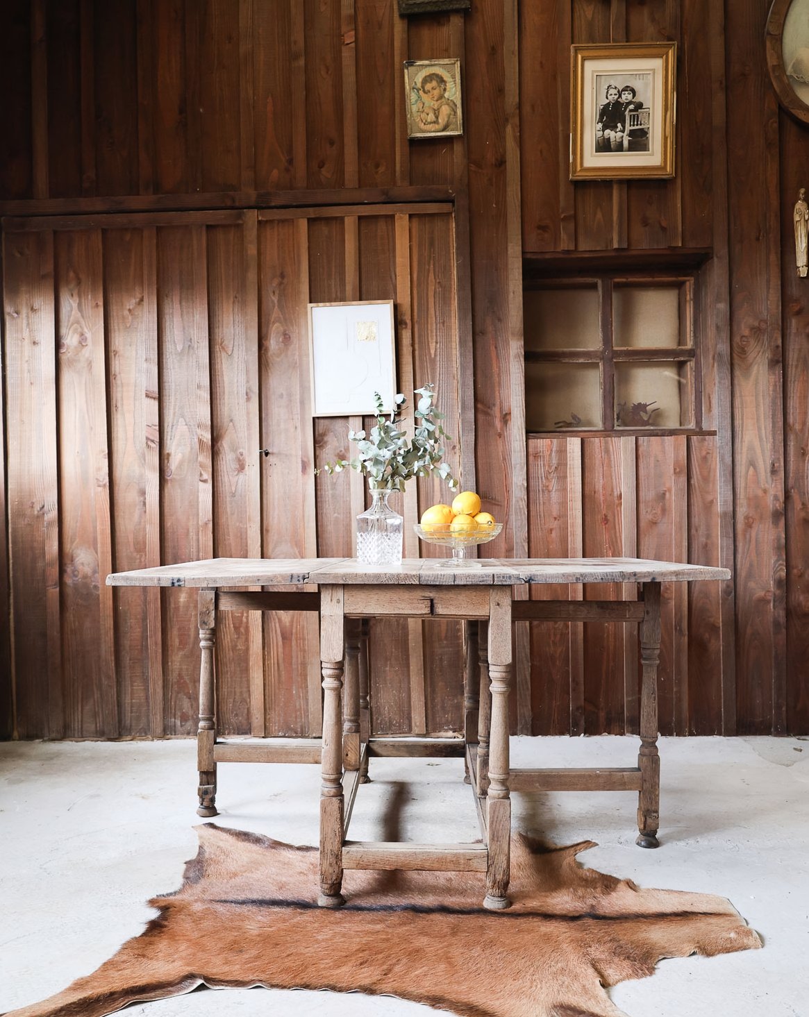 Embrace this rustic farmhouse table with its authentic character, which transforms into a console or side table thanks to its drop-leaf top. Its solid top and substantial thickness complement the sculpted wooden legs, offering a blend of robustness and handcrafted elegance. Designed for flexible spaces, it accommodates convivial meals or serves as an entryway console without taking up too much room, creating a warm and rustic atmosphere. Its proportions allow it to seat several guests while remaining suitable for compact interiors. Perfect for seating 6 to 8 people.