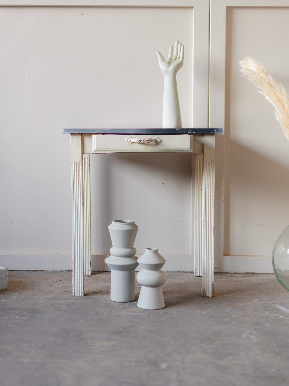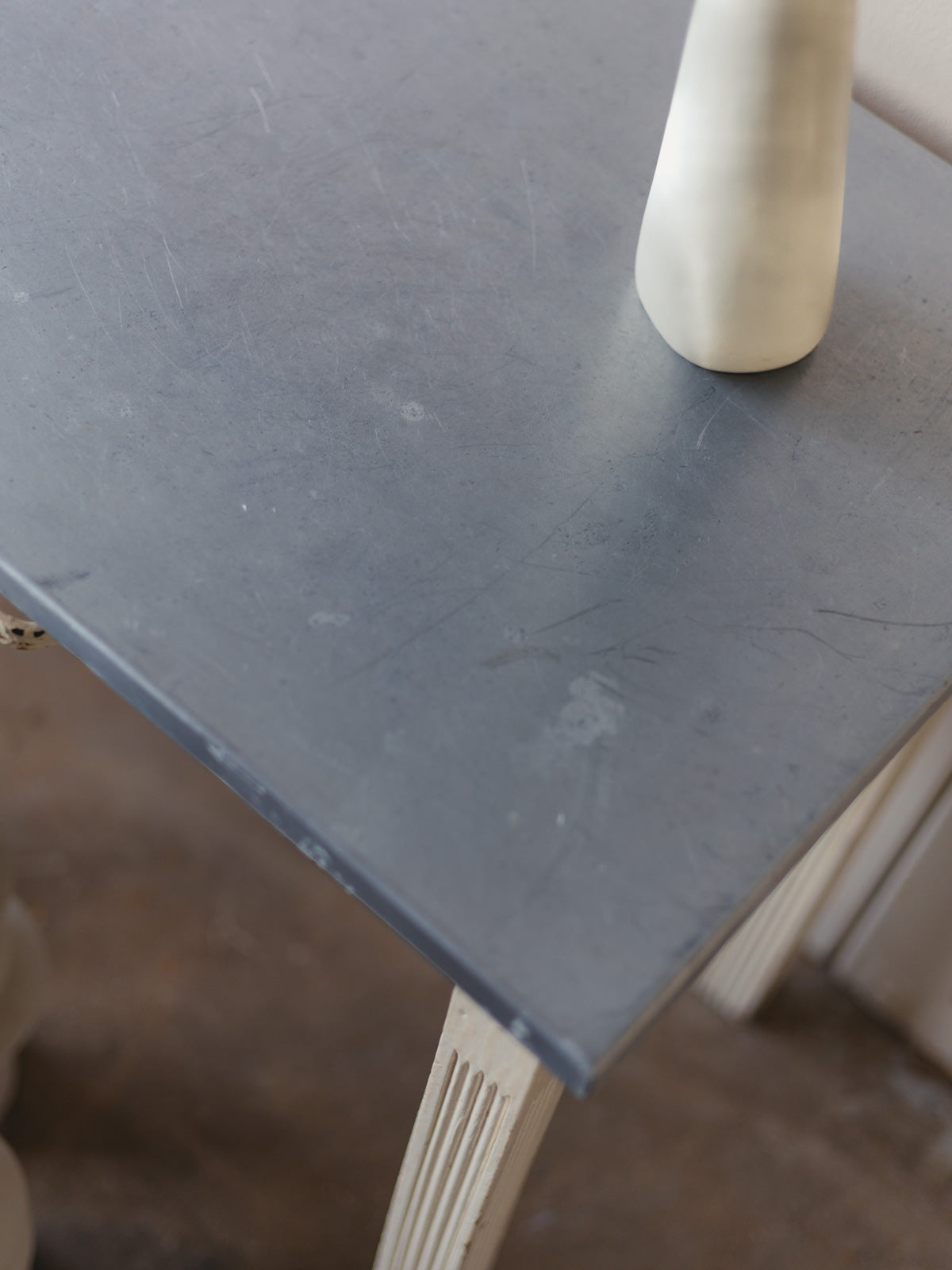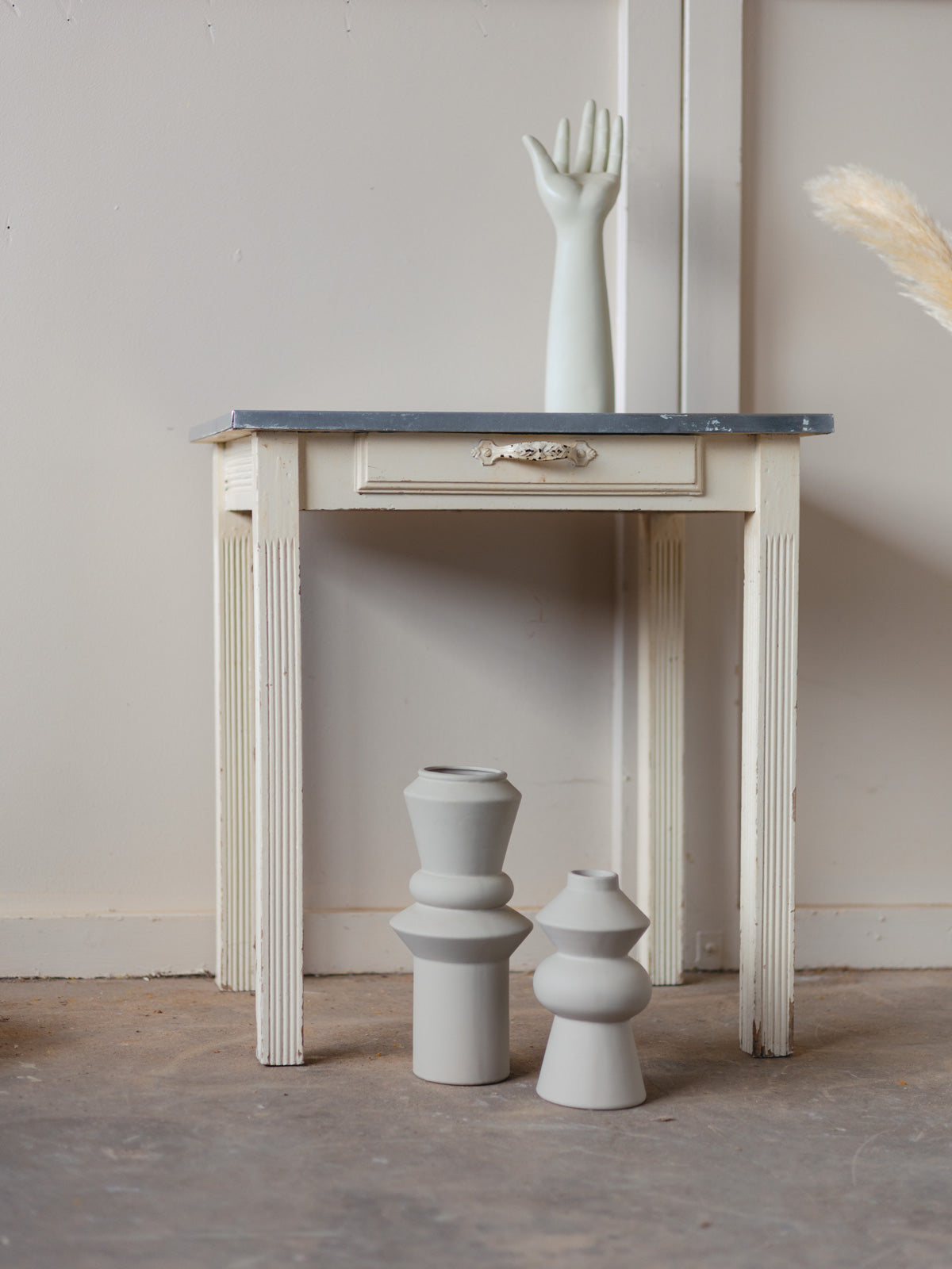 Add a touch of rustic charm with this small table featuring a zinc top and off-white painted legs, combining sturdiness with a patinated elegance. Its compact size and low height make it ideal as a side table, a work surface for repotting, or an intimate dining nook, while its wooden frame adds a warm presence. The patina tells its story and creates an authentic atmosphere. Old paint is visible, and there are signs of age.