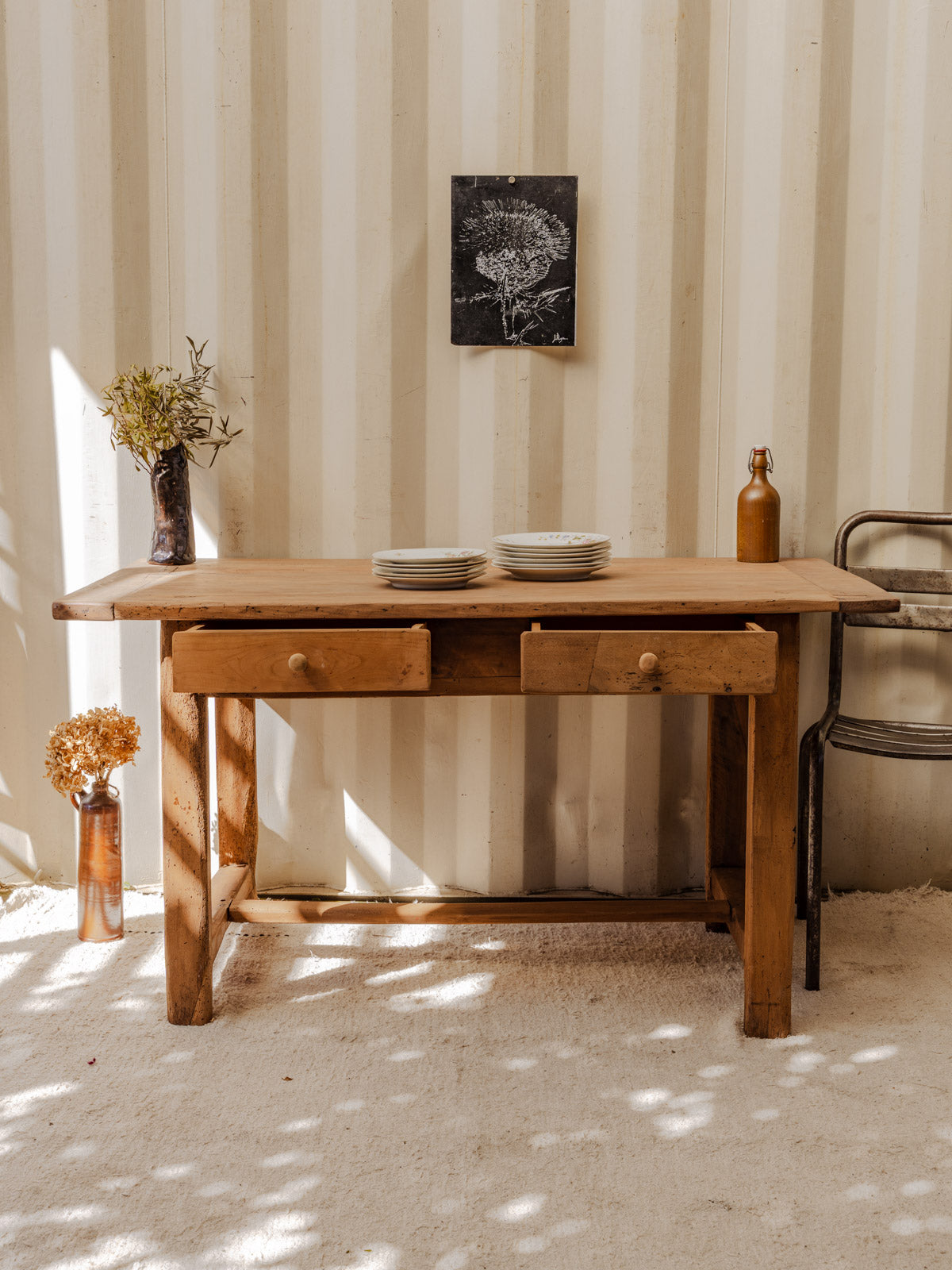 Découvrez cette table à manger en bois aux lignes épurées, pensée pour rassembler 4 à 6 convives autour d'un plateau lumineux. Ses proportions et ses deux tiroirs offrent un équilibre pratique entre surface conviviale et rangement subtil, parfait pour repas quotidiens ou moments partagés. Sa finition naturelle apporte une ambiance chaleureuse et contemporaine à la salle à manger ou à l'atelier. Quelques traces du temps présentes.