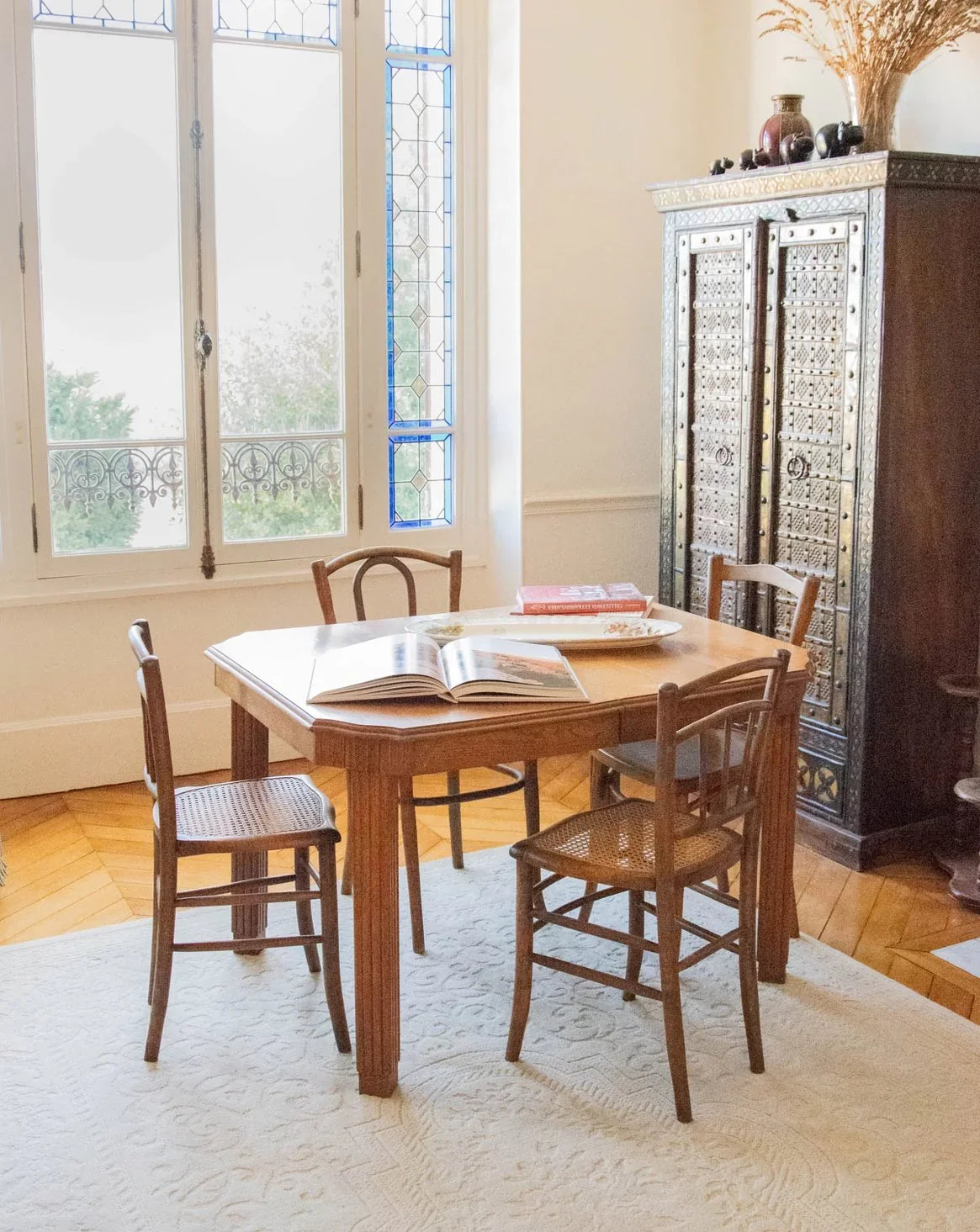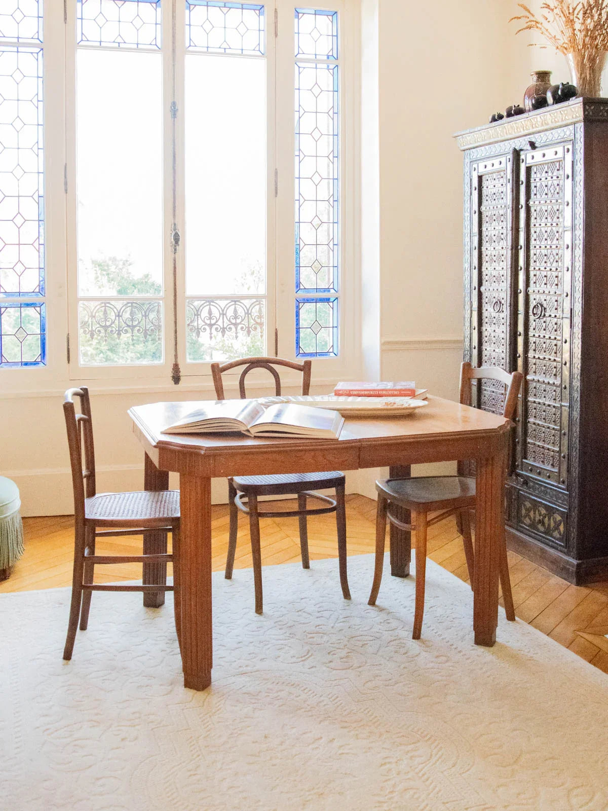 The farmhouse table is a timeless design that has long graced dining rooms. This wooden dining table, inspired by autumn, is a classic choice for vintage and bohemian decor. With its bright, light wood tones and rustic look, it's especially prized for its generous size, solid color, and drawers beneath the tabletop. The large farmhouse table is an essential element for any family gathering!