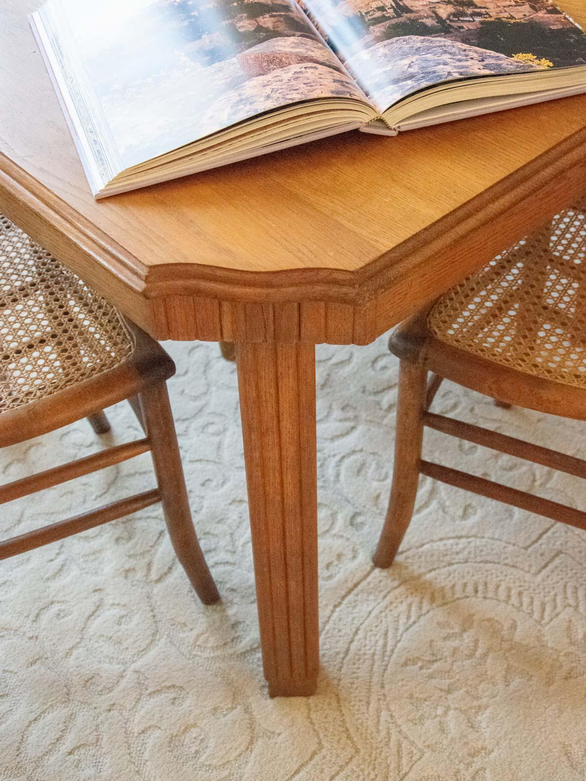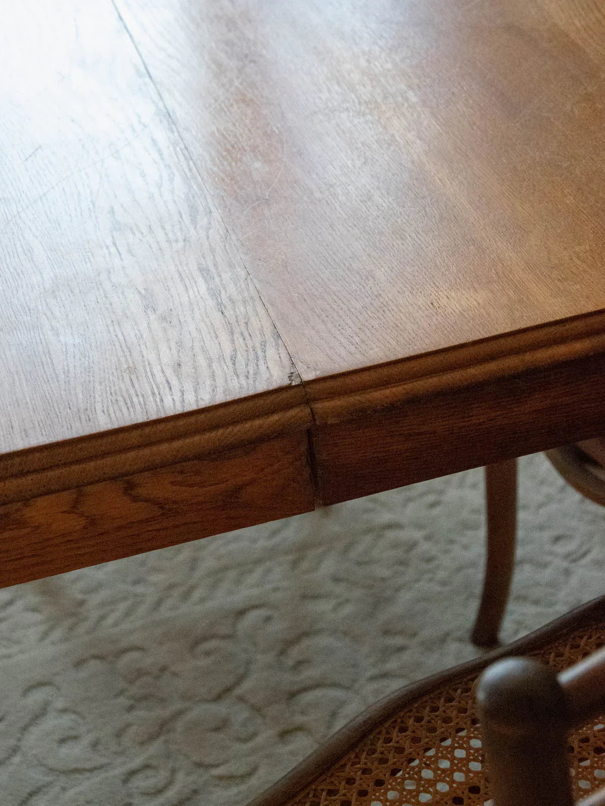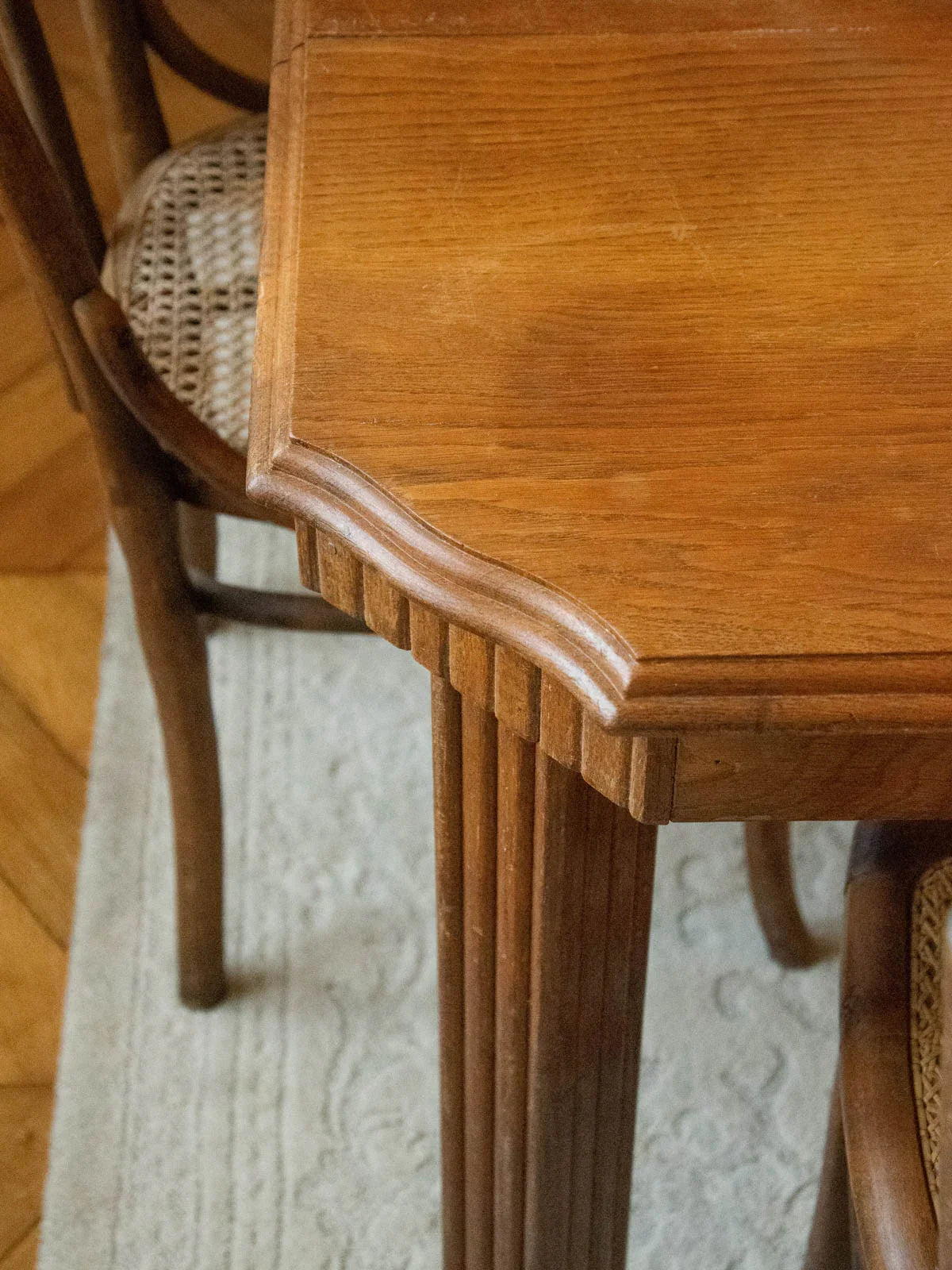 Choose this light oak table with its finely sculpted legs, which combines traditional craftsmanship with clean lines. Its generous surface accommodates meals, workshops, and family gatherings for up to four people, while the space beneath the tabletop offers comfortable room to move around. The natural wood grain and luminous hue radiate a gentle warmth and a timeless appeal, ideal for a convivial dining room or a chic country-style interior. Some signs of age are present.