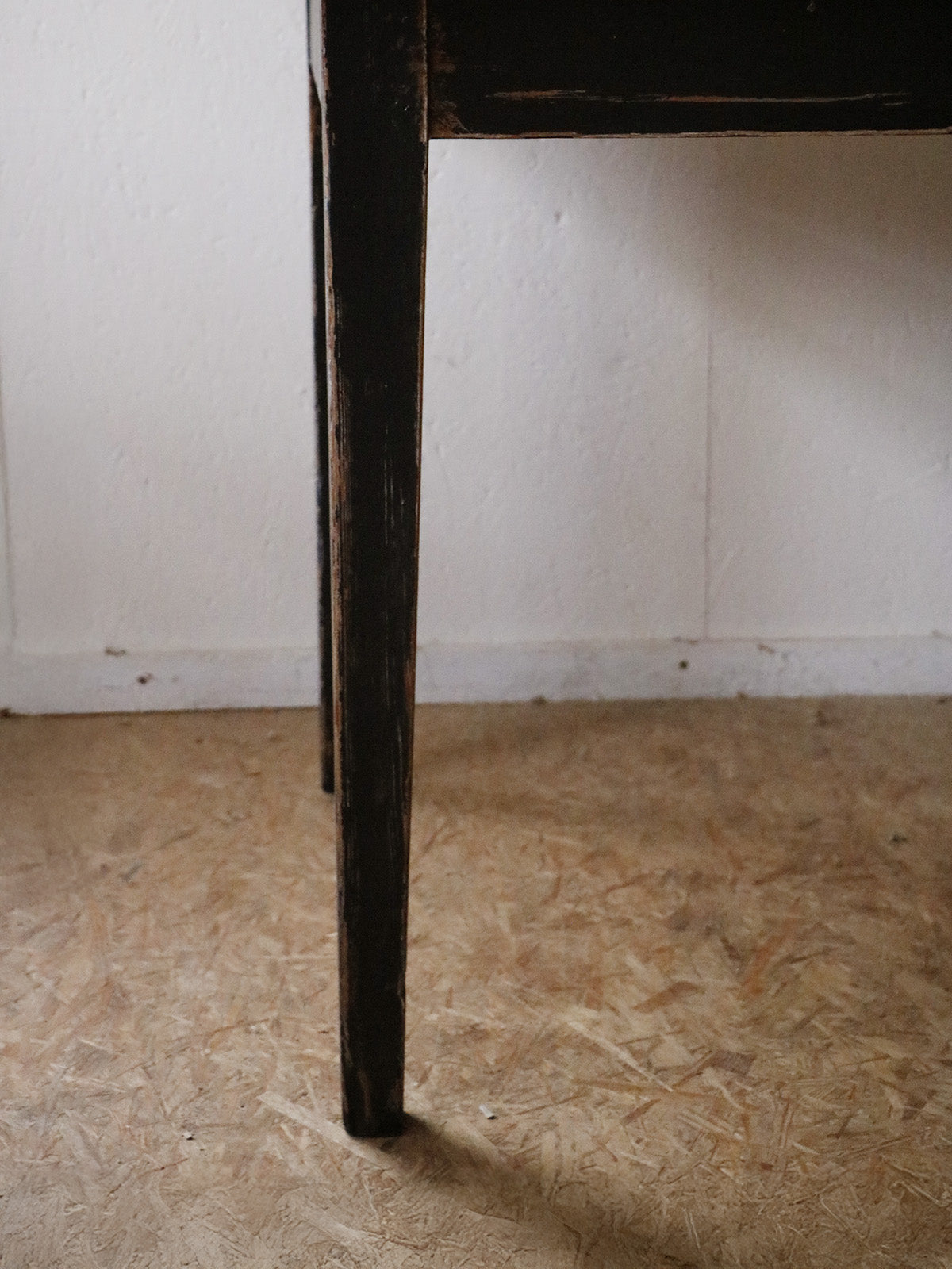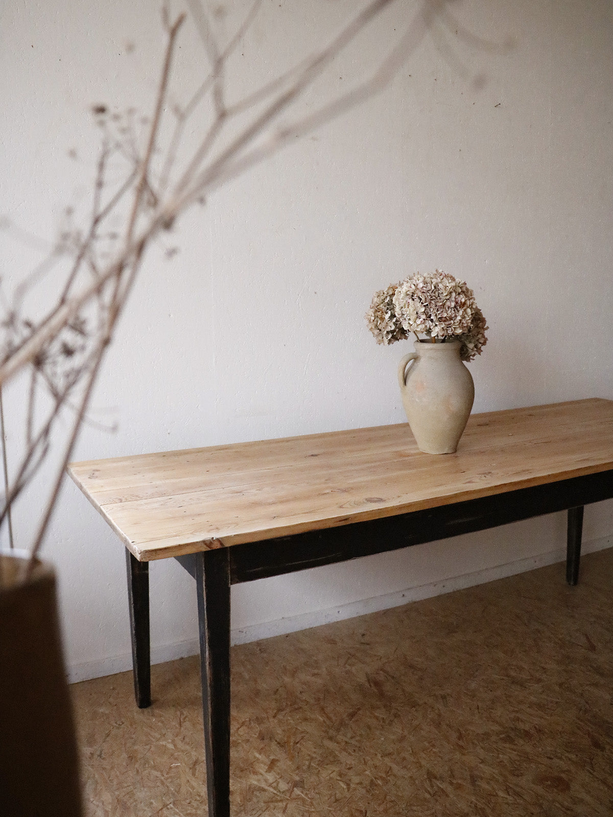 Elevate your space with this 1950s fir farmhouse table, where the structured frame and generous tabletop invite convivial meals or moments of creative expression. The light wood exudes a beautiful natural warmth, while the black-finished legs provide a graphic contrast and understated elegance. Sturdy and authentically characterful, it finds its place in a rustic-chic kitchen or a contemporary dining room. It comfortably seats 6 to 8 people.