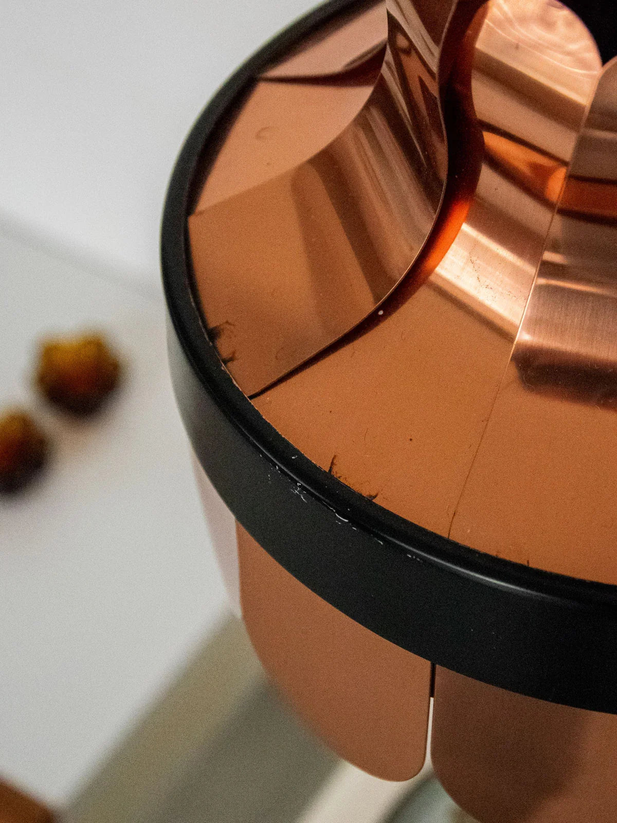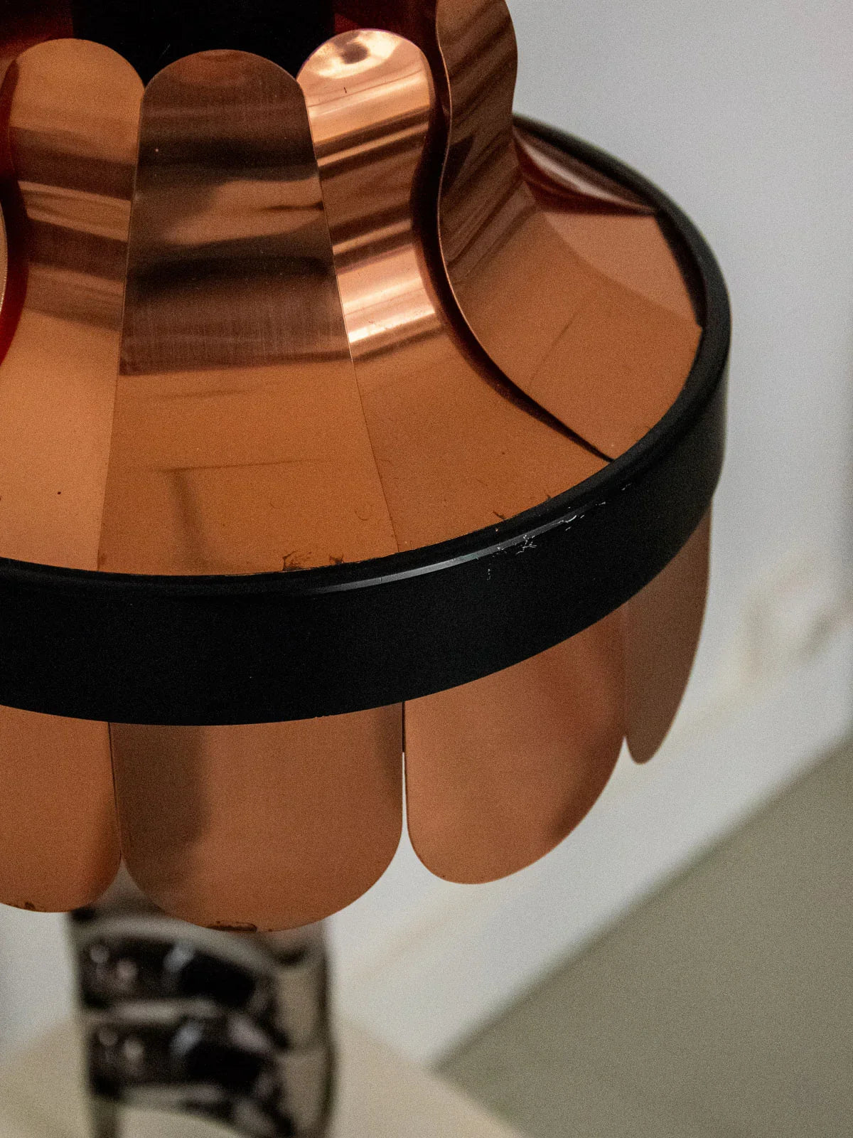 Enhance your interior with this Scandinavian pendant light from the 1970s, reminiscent of a flower whose copper petals create a warm and sculptural silhouette. Its copper and lacquered metal construction diffuses a soft, focused light, ideal above a side table, in a reading nook, or in an entryway where its compact size adds an elegant touch. Made in Denmark, this vintage style features clean lines and a discreet character. Minor signs of wear and oxidation are present.