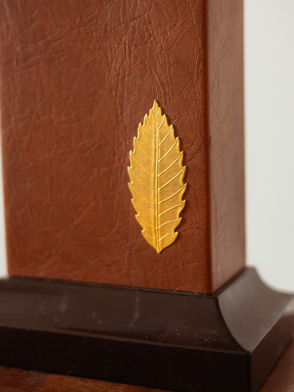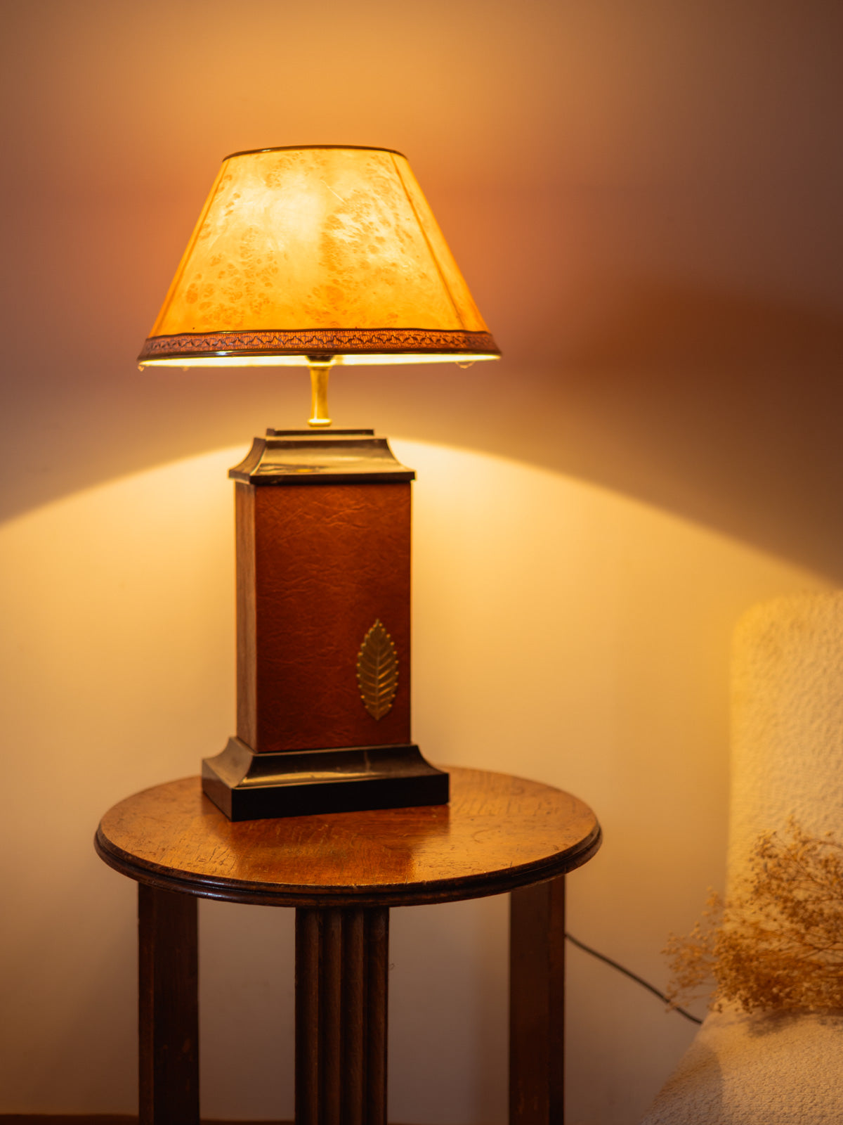 Enhance your interior with this lamp that combines wood and leather with a pink marbled plasticized canvas shade, resting on a black base with an elegant brown center. Its silver and gold trim and the gold leaf adorning the shade add a refined and luminous touch, while the gold stem creates a slender silhouette, ideal for a side table or console. Warm materials and meticulous craftsmanship create a soft and intimate atmosphere. Minor signs of age are present.
