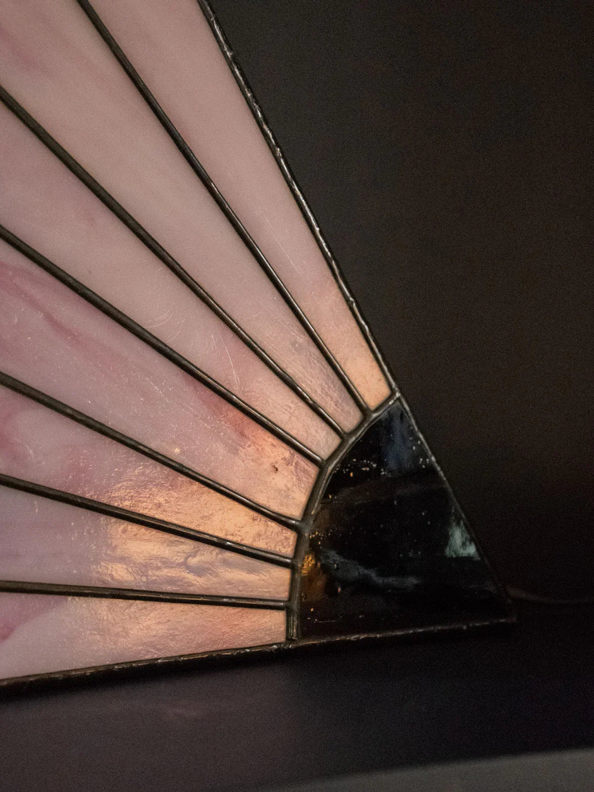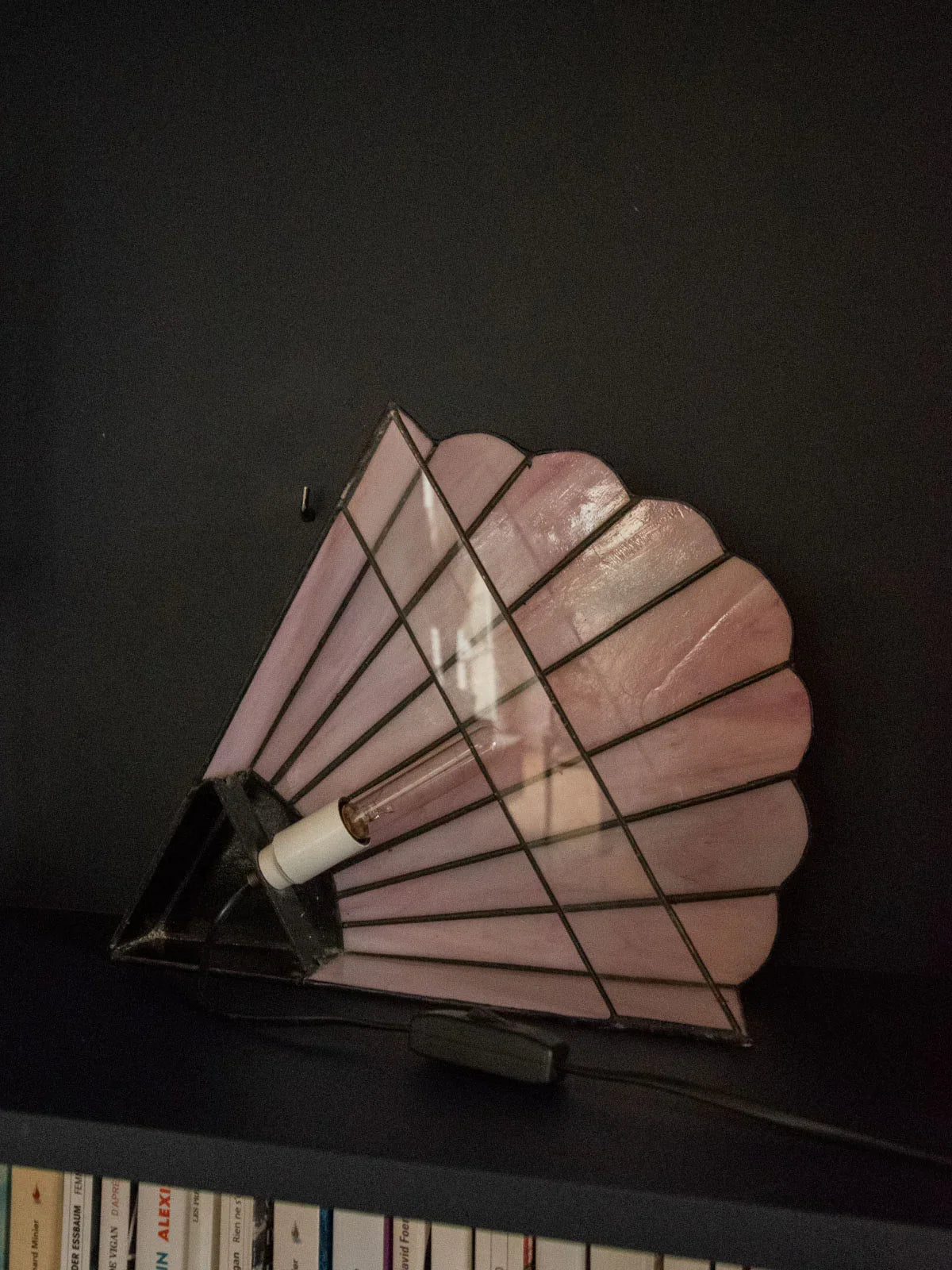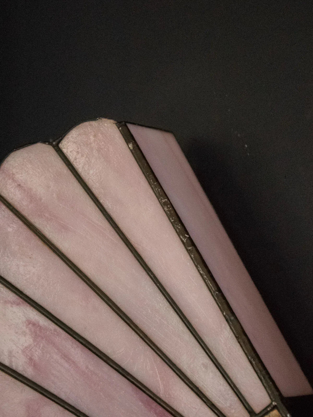 Add a delicate touch with this wall light in a black and pink duo, designed in a fan shape for a graphic and feminine profile. Its compact size and small base make it ideal for discreetly illuminating a hallway, headboard, or alcove, providing a soft light source. The contrasting hues create a warm and refined atmosphere, blending modernity and retro charm, enhancing an interior without being imposing. In the Tiffany style.