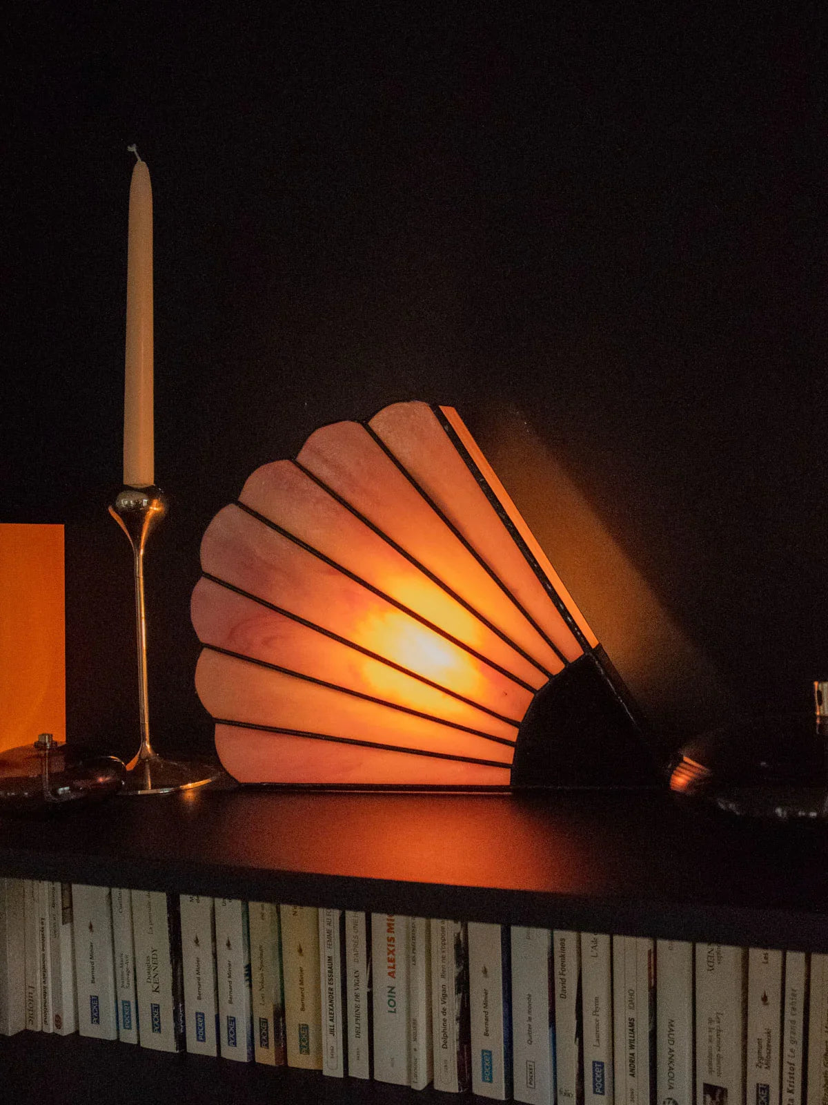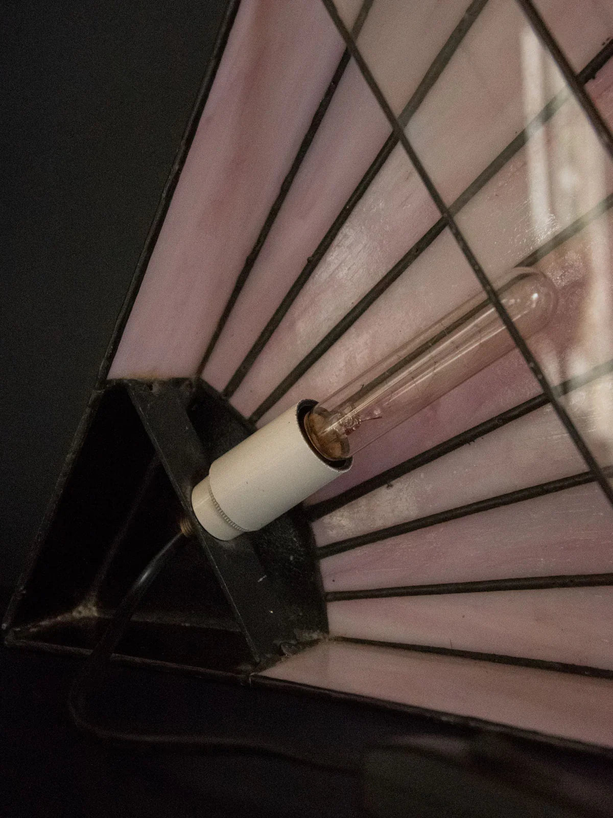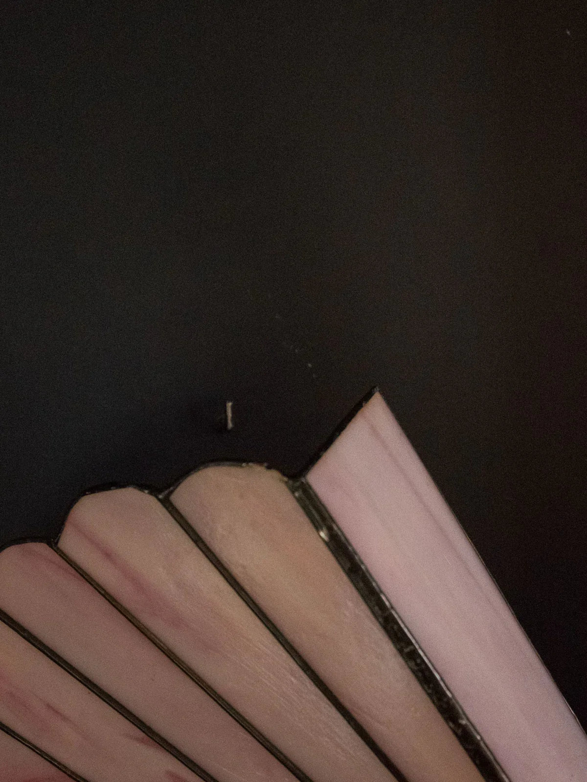 Add a delicate touch with this wall light in a black and pink duo, designed in a fan shape for a graphic and feminine profile. Its compact size and small base make it ideal for discreetly illuminating a hallway, headboard, or alcove, providing a soft light source. The contrasting hues create a warm and refined atmosphere, blending modernity and retro charm, enhancing an interior without being imposing. In the Tiffany style.