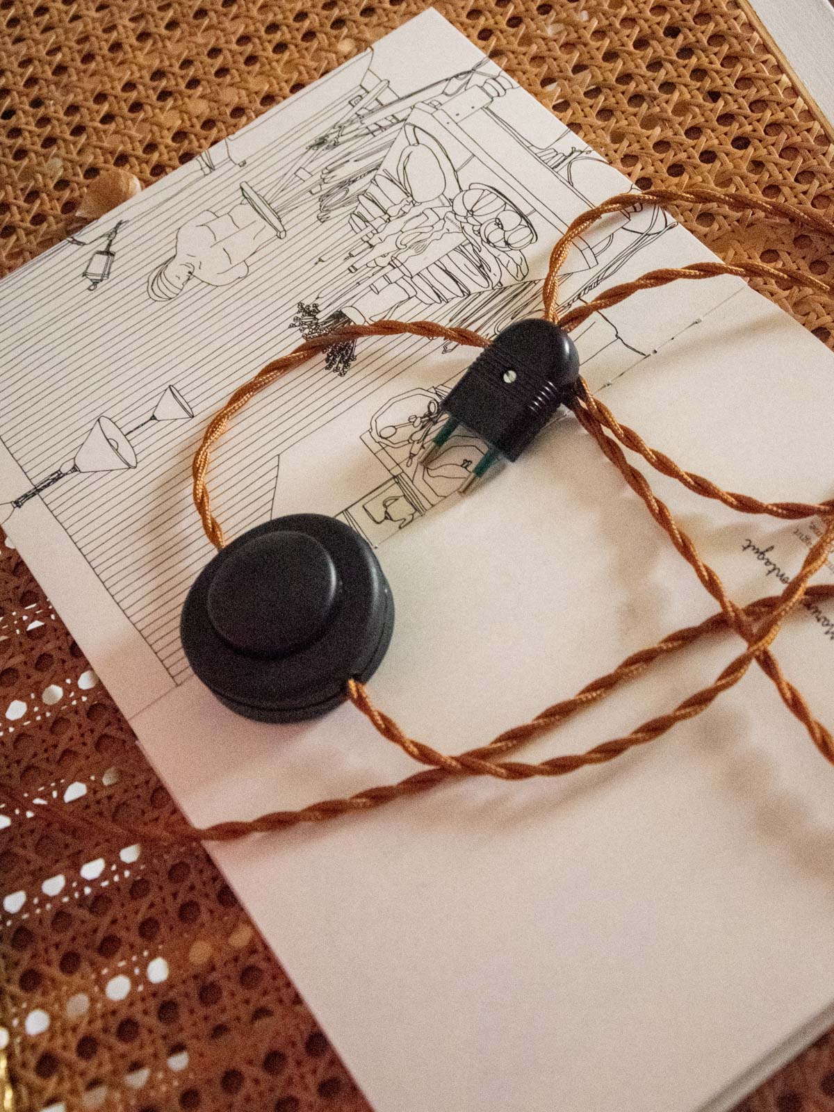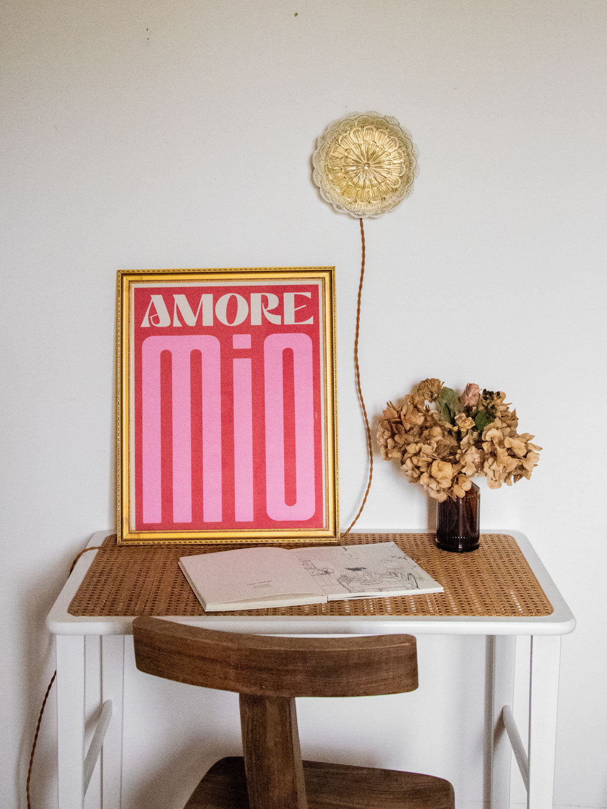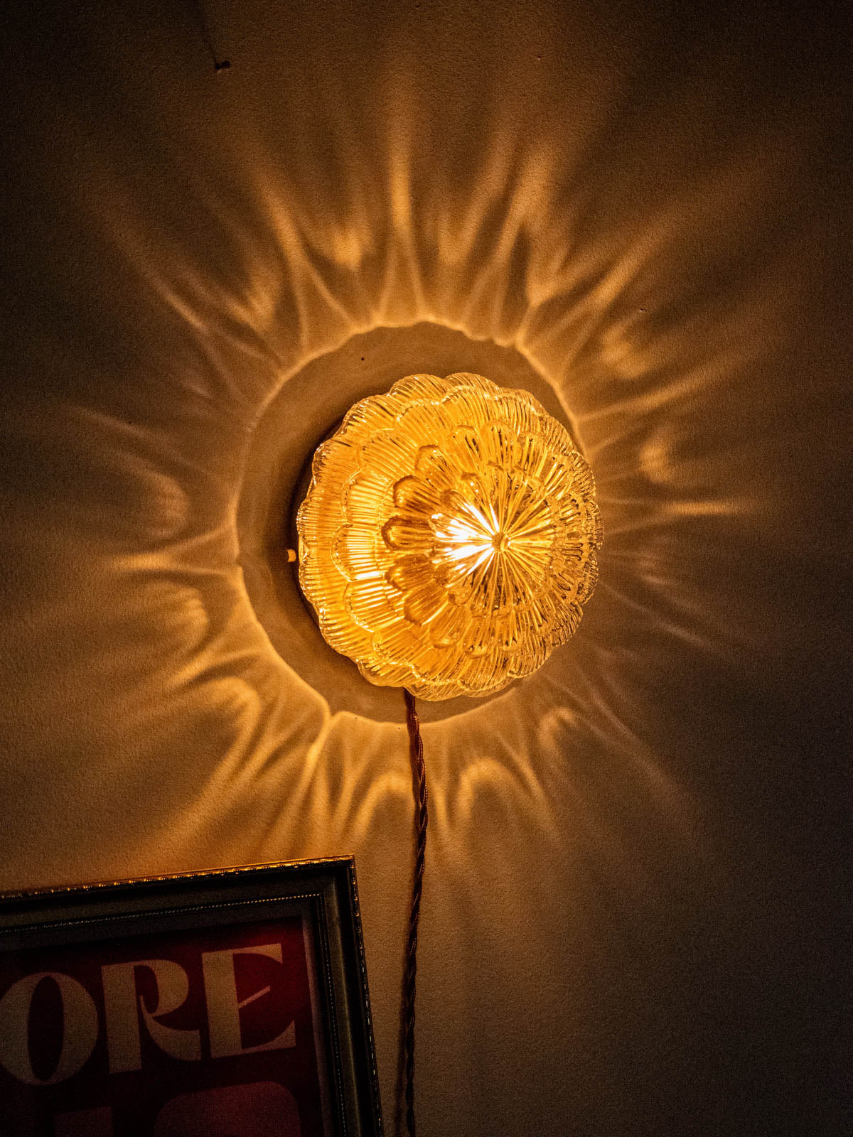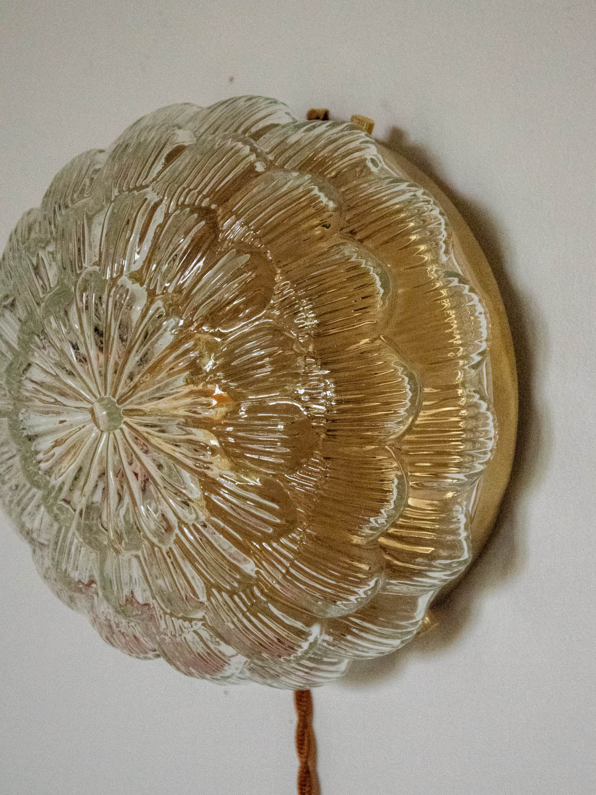 Discover this fully restored, handcrafted lamp, a unique piece that diffuses a sunbeam-like halo of light thanks to its floral glass globe and interior repainted with a golden sheen. It can be placed on a surface or mounted on the wall; it operates without a wall outlet and plugs in via a long, twisted brown cable with a foot switch. It comes with a G9 bulb that emits a warm light (2700K). The gold base, meticulous finishing, and updated wiring, all compliant with CE standards, ensure safe and worry-free use.
