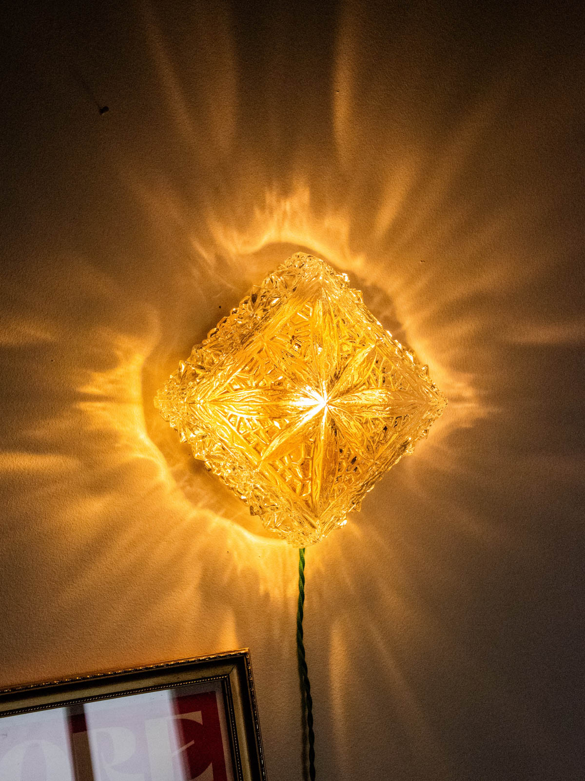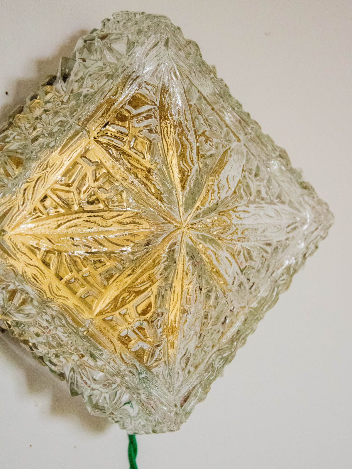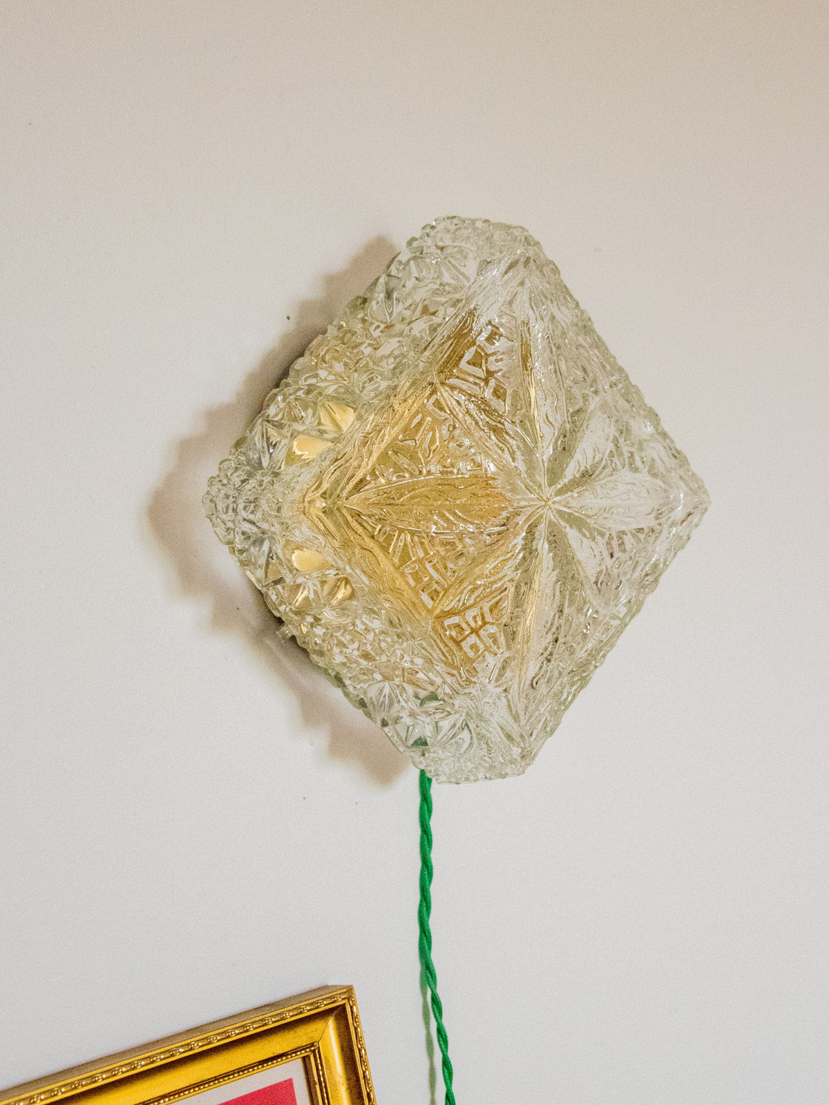 Discover this handcrafted lamp, restored as a unique piece. Its diamond-shaped glass sits atop a raw base, and its apple-green twisted cable gives it a look that is both vintage and contemporary. Designed for installation without a wall outlet, it can be hung on the wall or placed on a piece of furniture. The wiring has been updated to CE standards, and it comes with a 25W 2700K G9 bulb for a soft, sunbeam-like light. The interior, repainted with a touch of gold, enhances the light diffusion, while new glides ensure its stability.