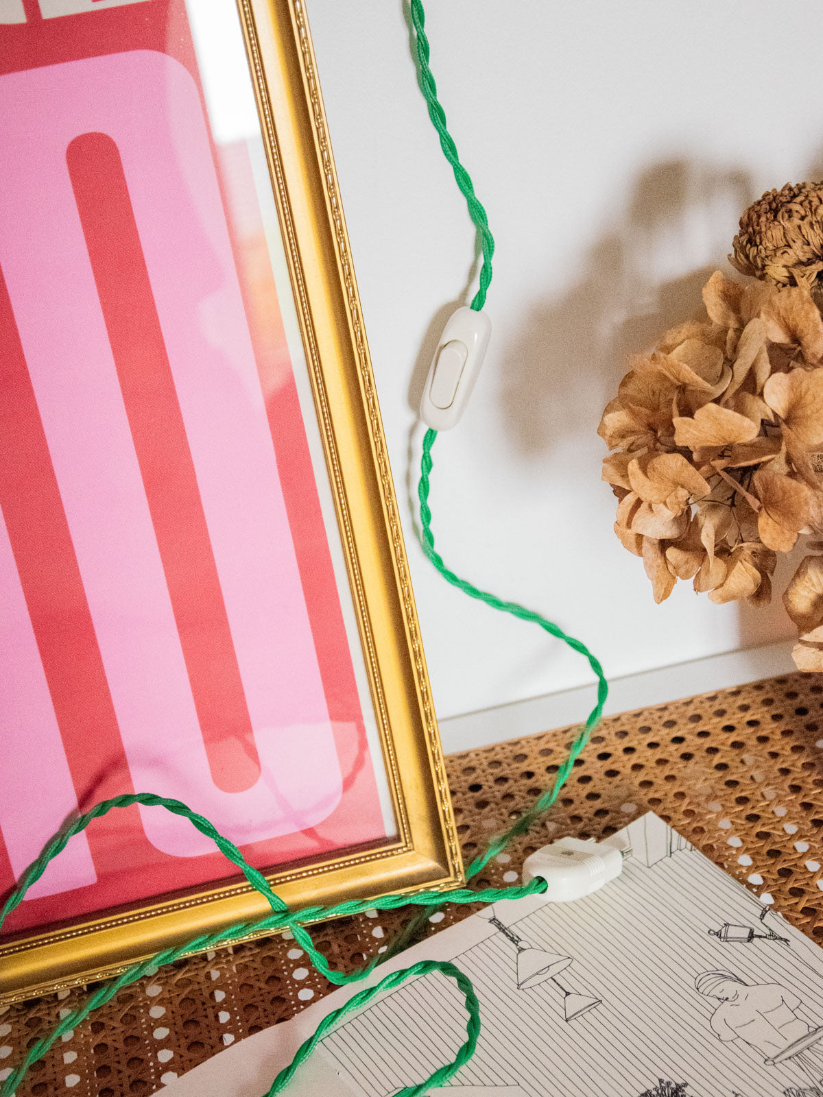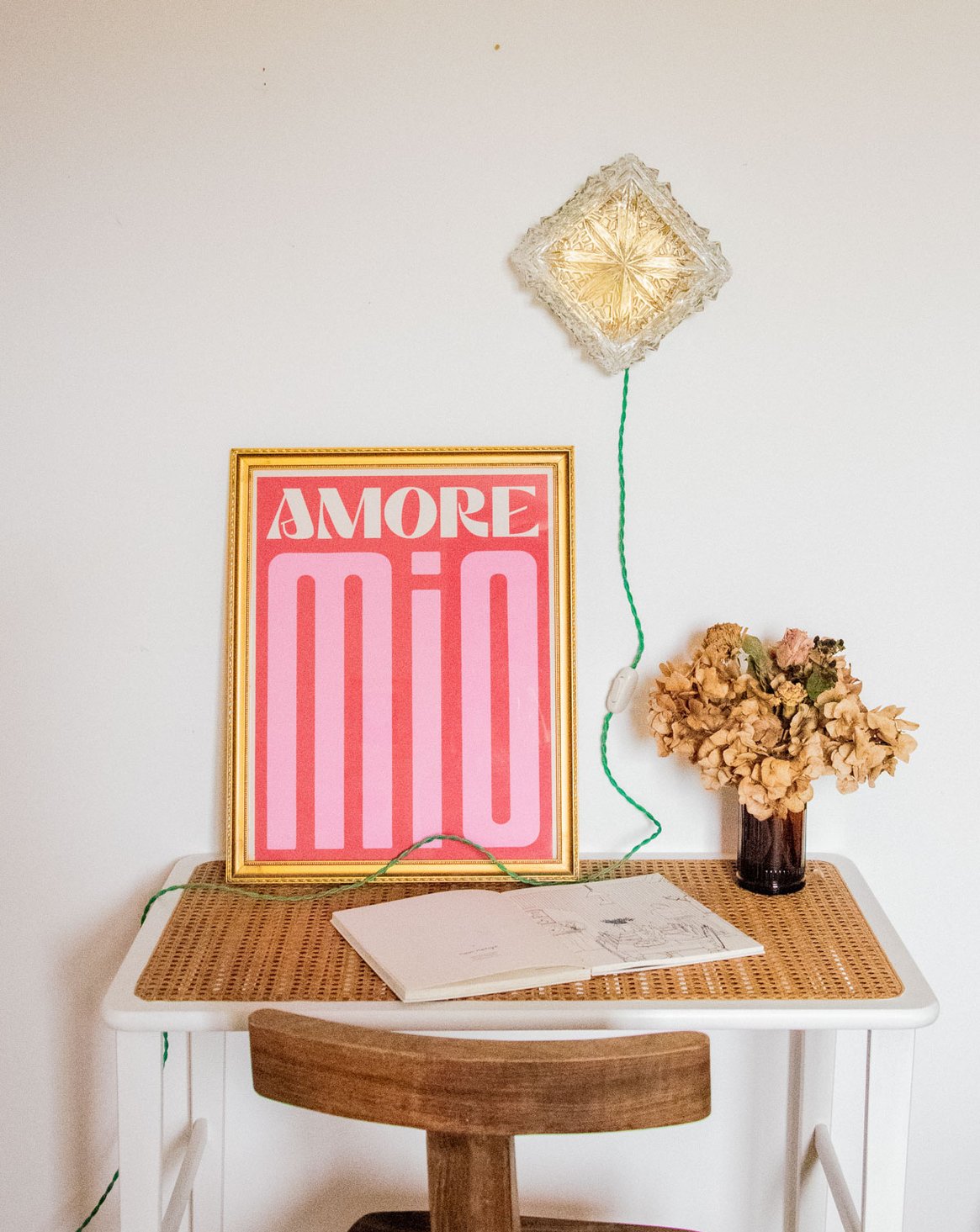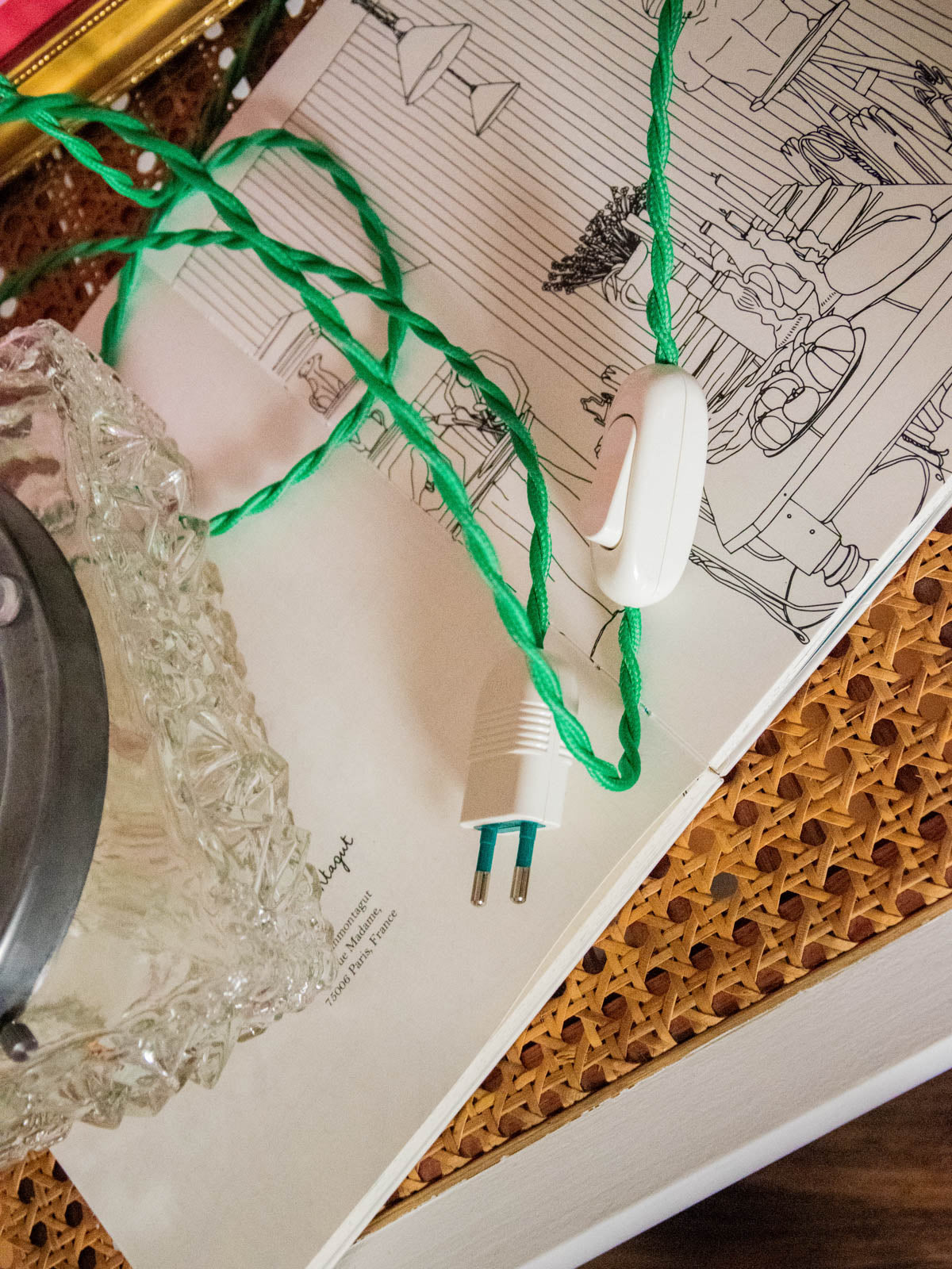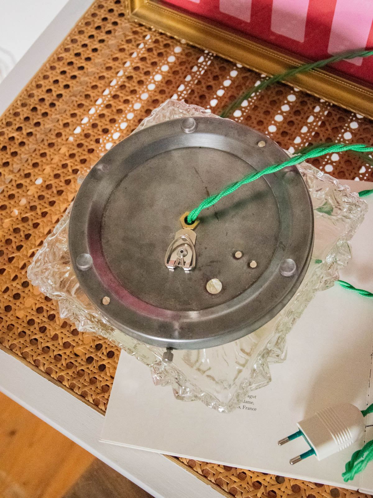 Discover this handcrafted lamp, restored as a unique piece. Its diamond-shaped glass sits atop a raw base, and its apple-green twisted cable gives it a look that is both vintage and contemporary. Designed for installation without a wall outlet, it can be hung on the wall or placed on a piece of furniture. The wiring has been updated to CE standards, and it comes with a 25W 2700K G9 bulb for a soft, sunbeam-like light. The interior, repainted with a touch of gold, enhances the light diffusion, while new glides ensure its stability.