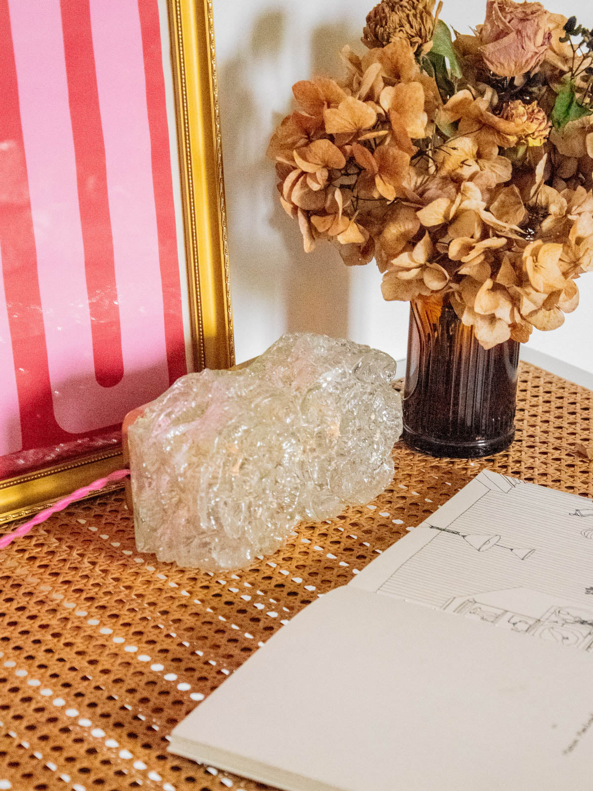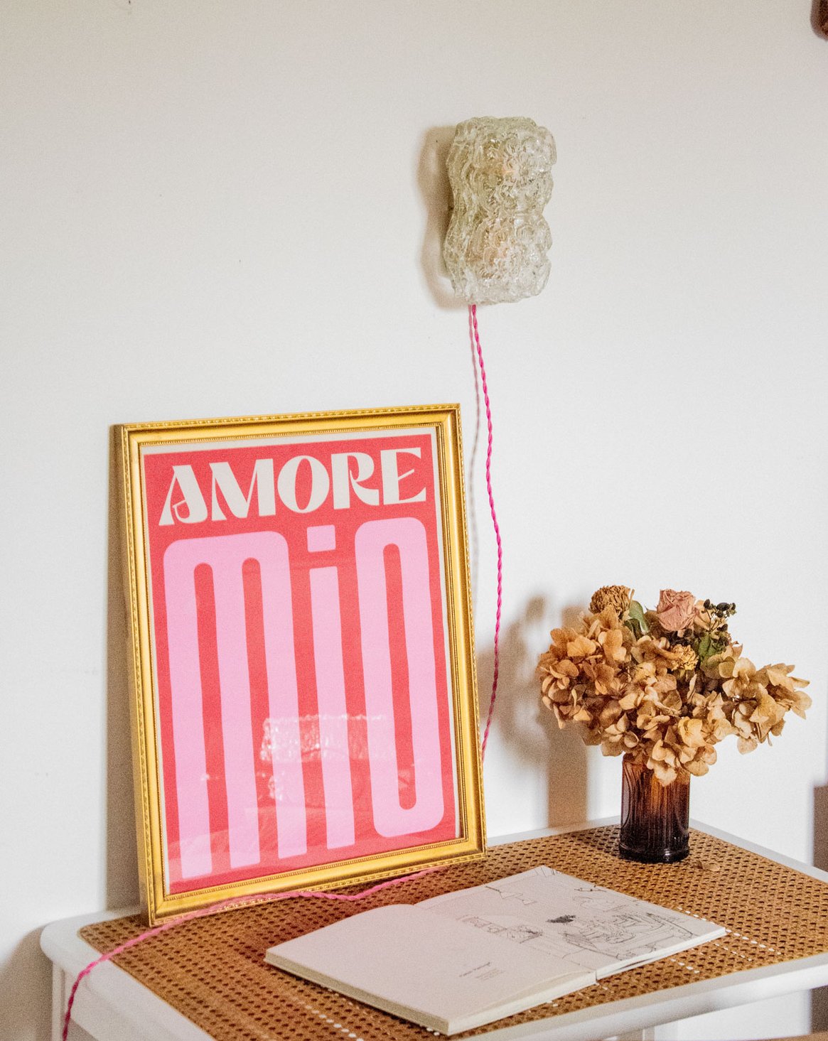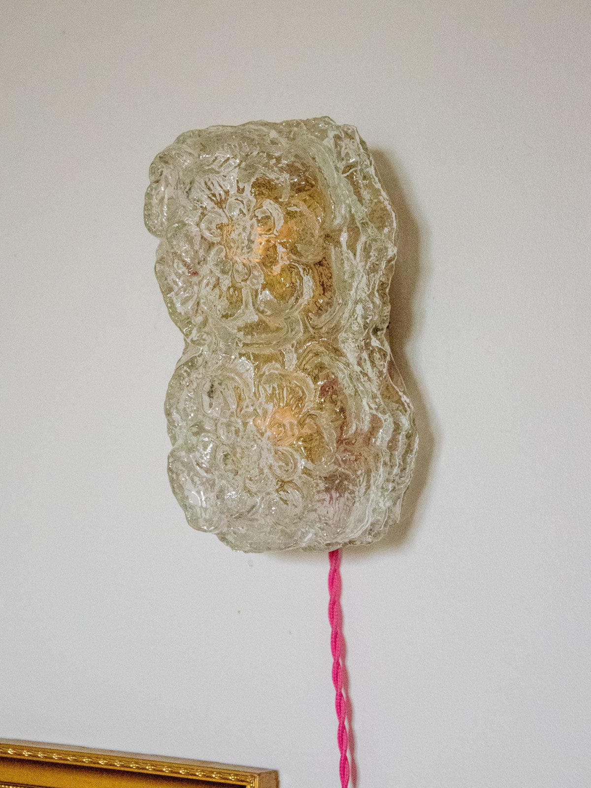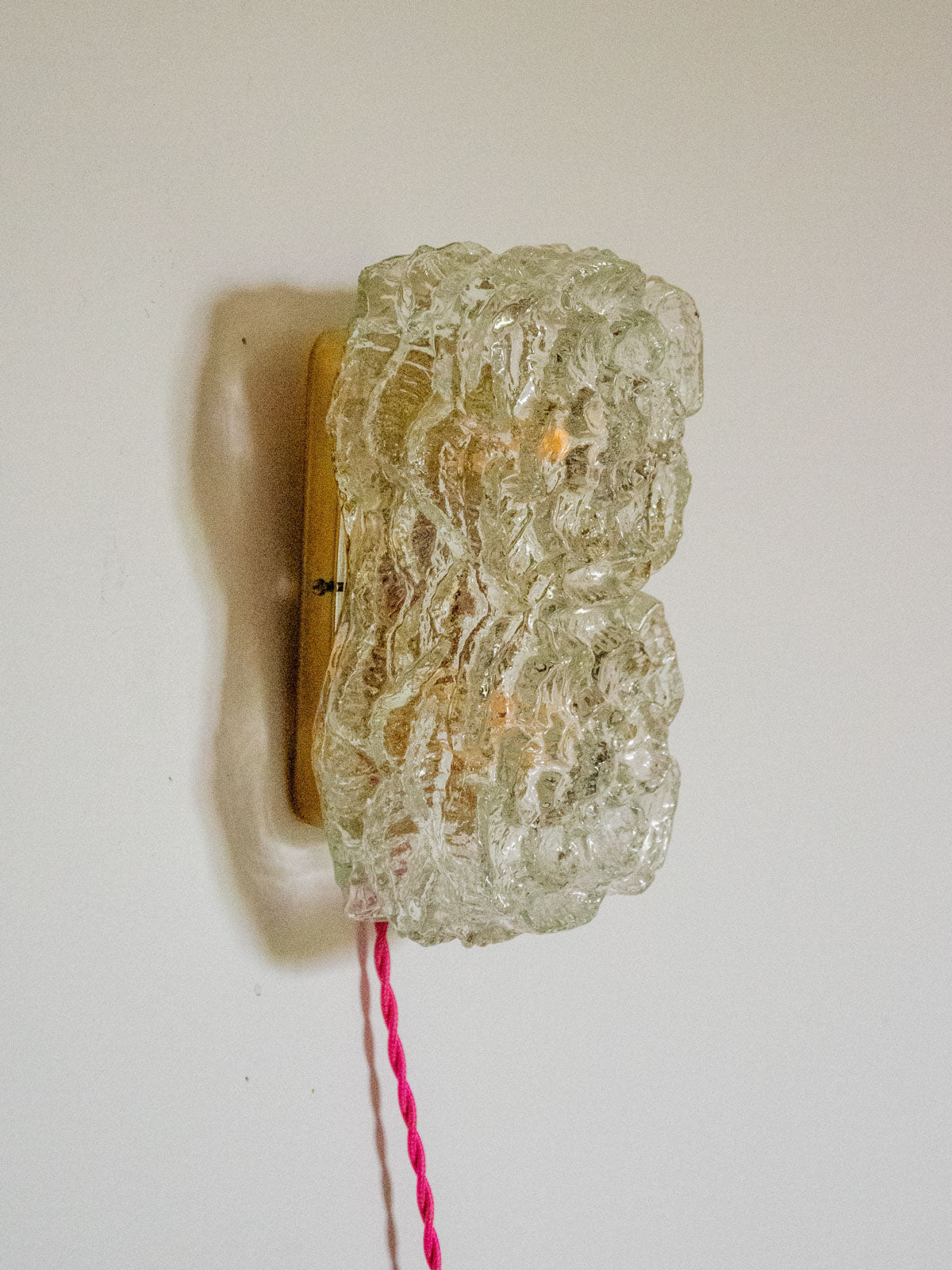 Enhance your interior with this handcrafted mood lamp, completely refurbished and designed as a unique piece. Its rectangular floral glass shade diffuses a warm, luminous halo, while the interior, repainted with a golden sheen, intensifies the softness of the light. Versatile, it can be placed on a surface or mounted as a wall light without the need for a wall connection and comes with a G9 bulb, updated electrical wiring (CE compliant), a new switch and glides; a power cord is included.