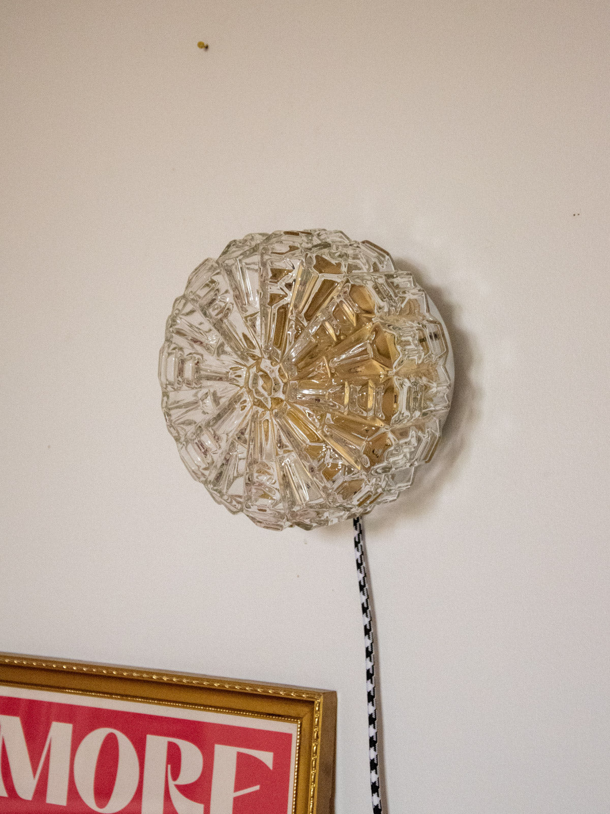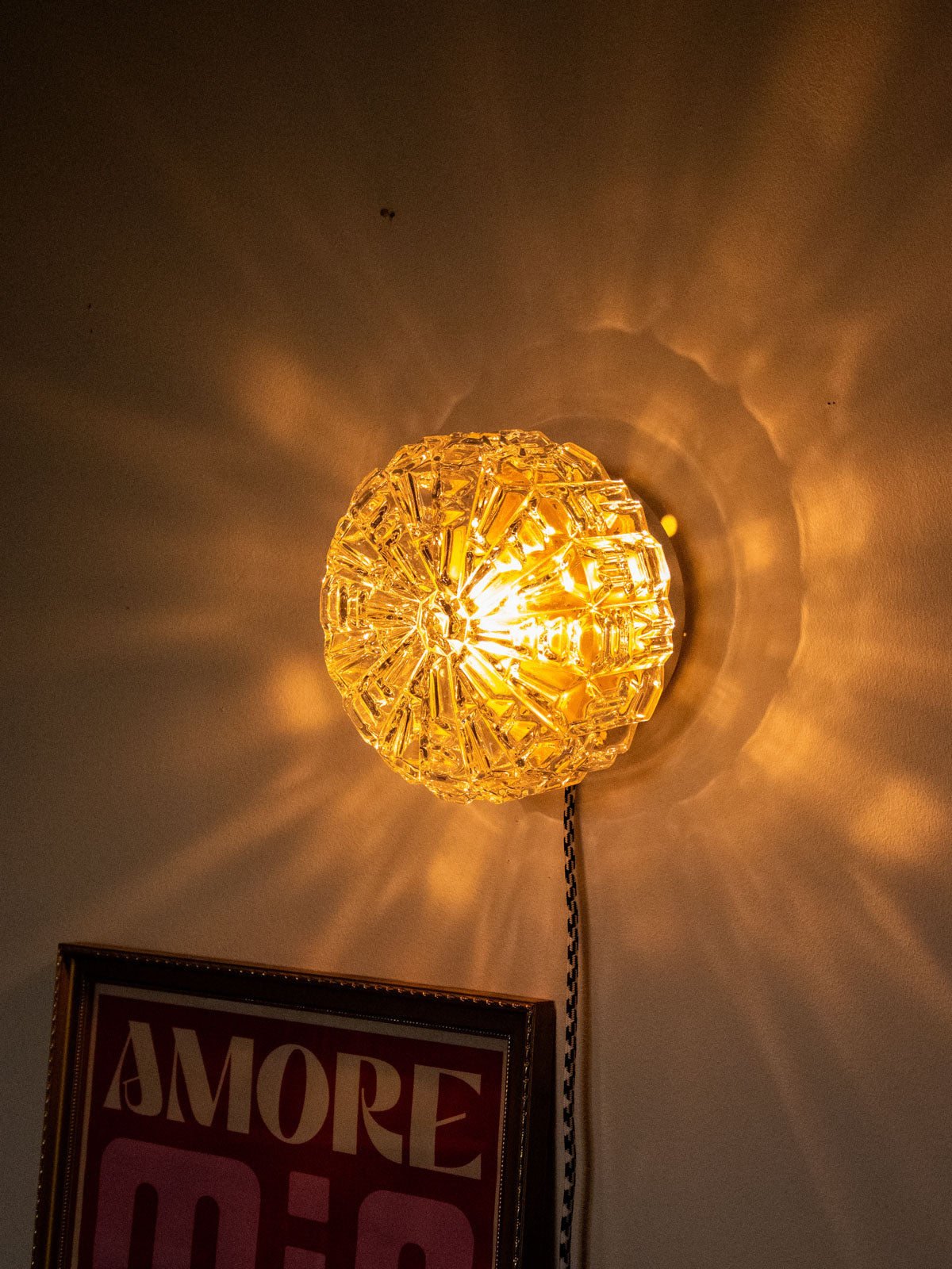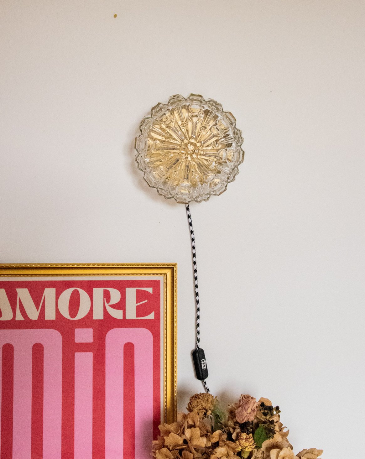 Bring a soft, sculptural light into your space with this unique, handcrafted lamp, completely refurbished. The floral glass globe diffuses a sunbeam-like halo, while the interior, repainted with a golden sheen, enhances a warm and sophisticated atmosphere. Designed for versatility, it can be hung on the wall or placed on a piece of furniture thanks to its raw base and new glides. The electrical wiring has been updated, and it comes with a G9 bulb and a two-meter cable with a switch.