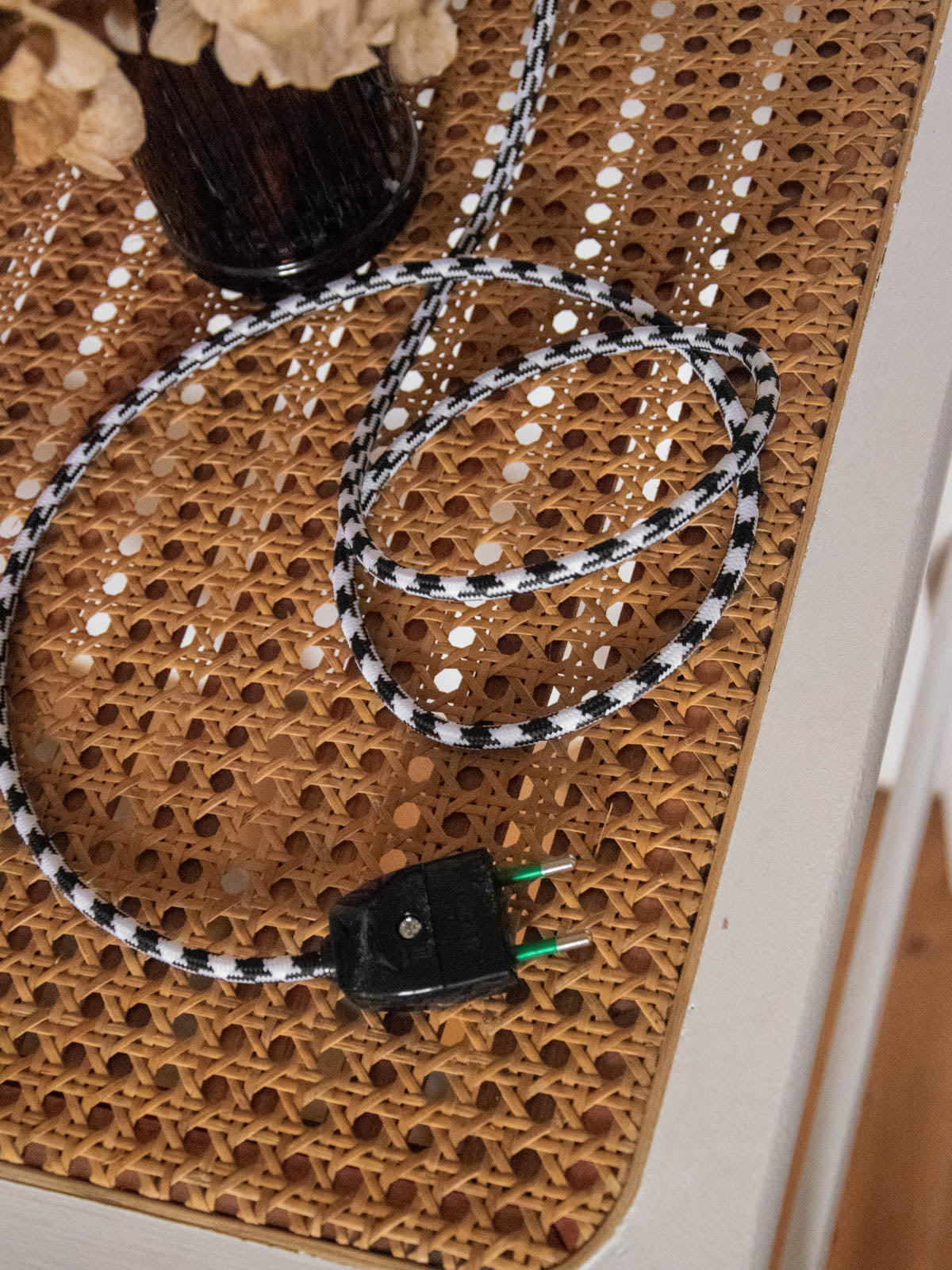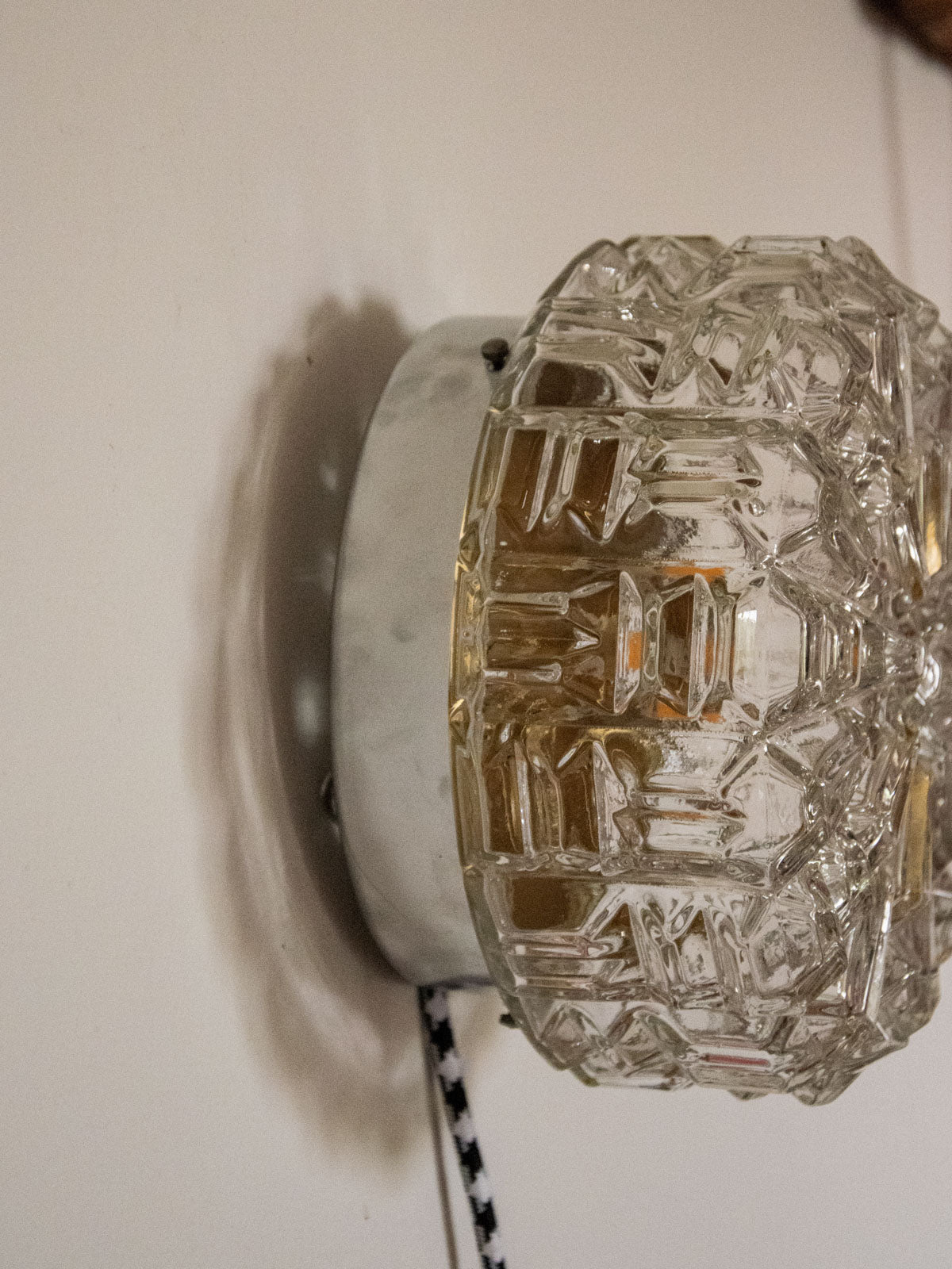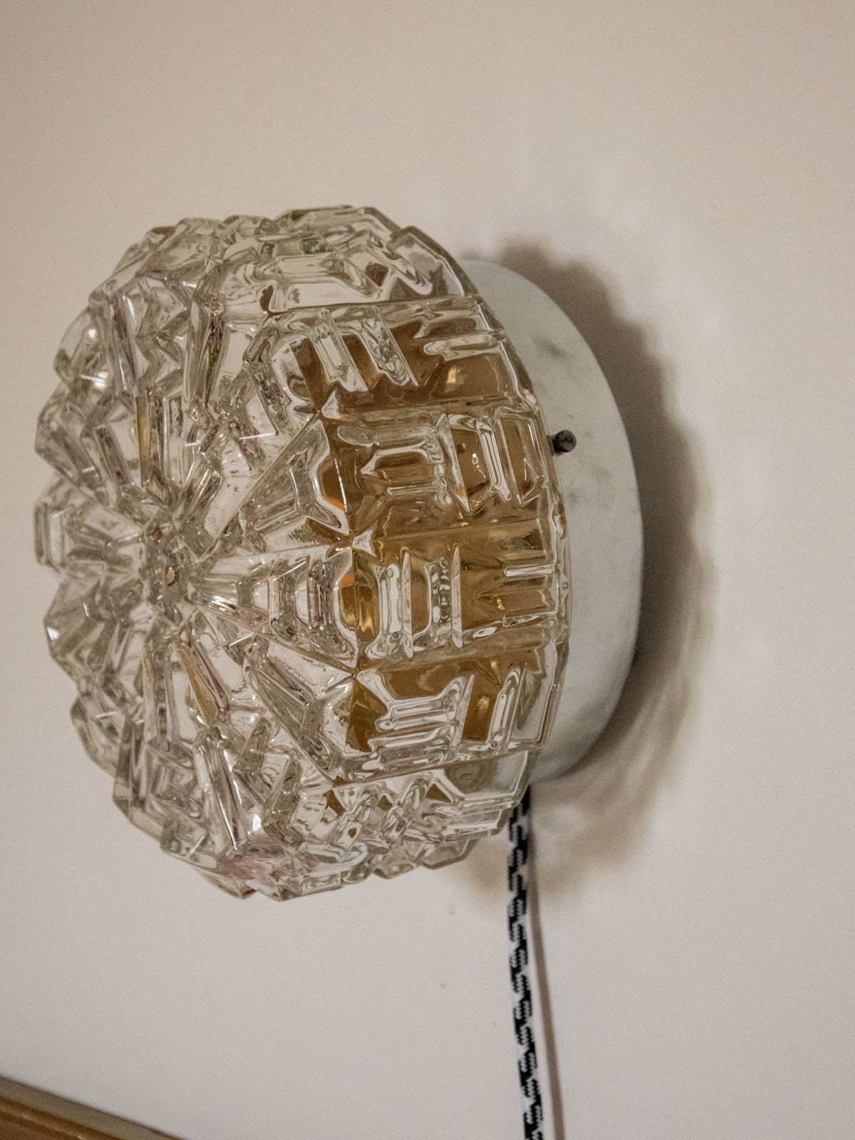 Bring a soft, sculptural light into your space with this unique, handcrafted lamp, completely refurbished. The floral glass globe diffuses a sunbeam-like halo, while the interior, repainted with a golden sheen, enhances a warm and sophisticated atmosphere. Designed for versatility, it can be hung on the wall or placed on a piece of furniture thanks to its raw base and new glides. The electrical wiring has been updated, and it comes with a G9 bulb and a two-meter cable with a switch.