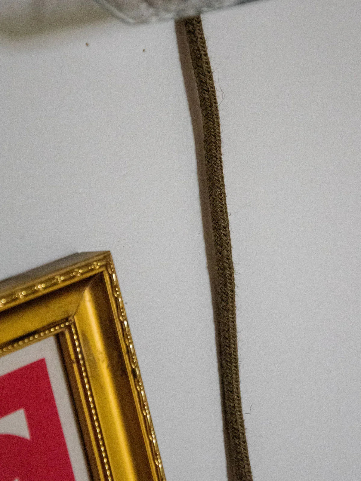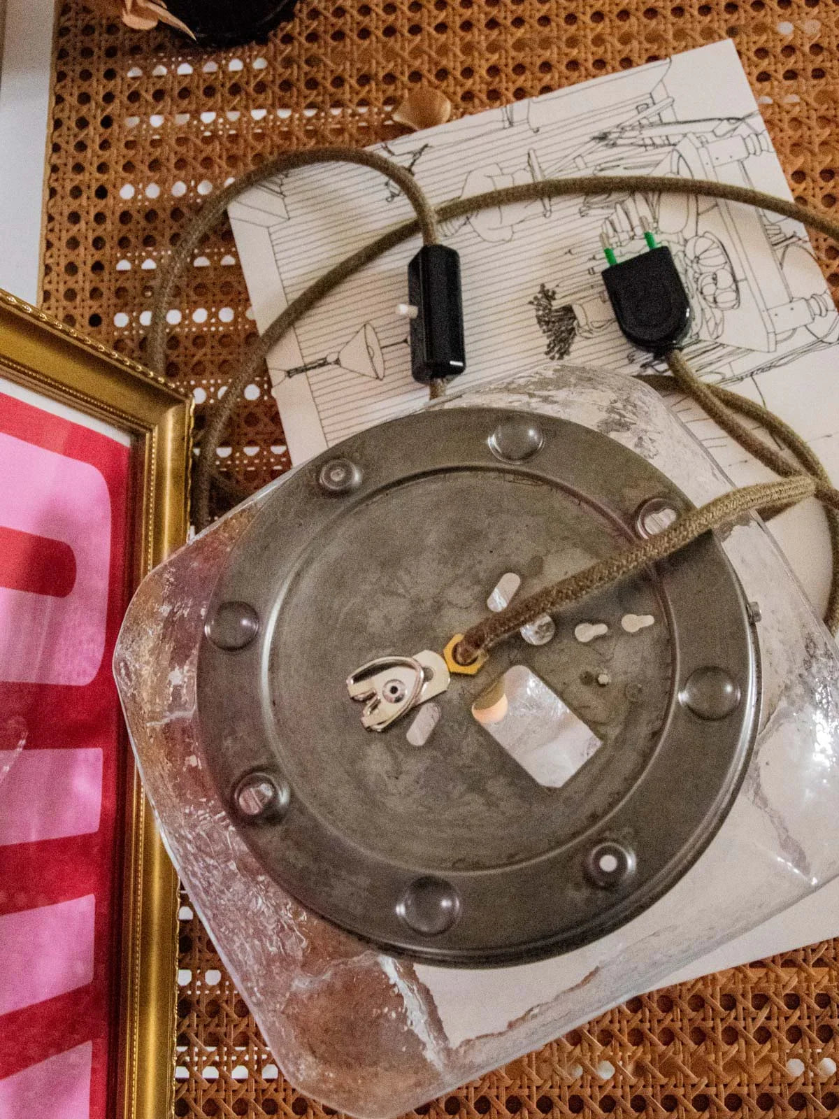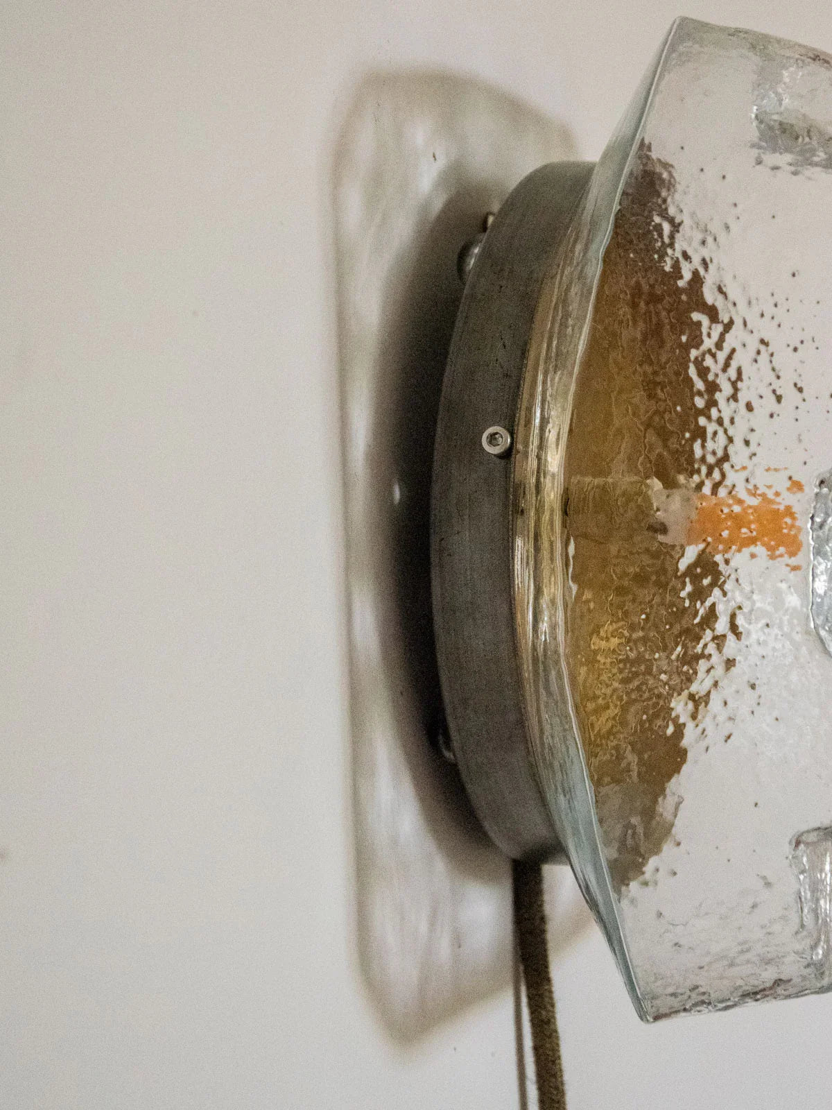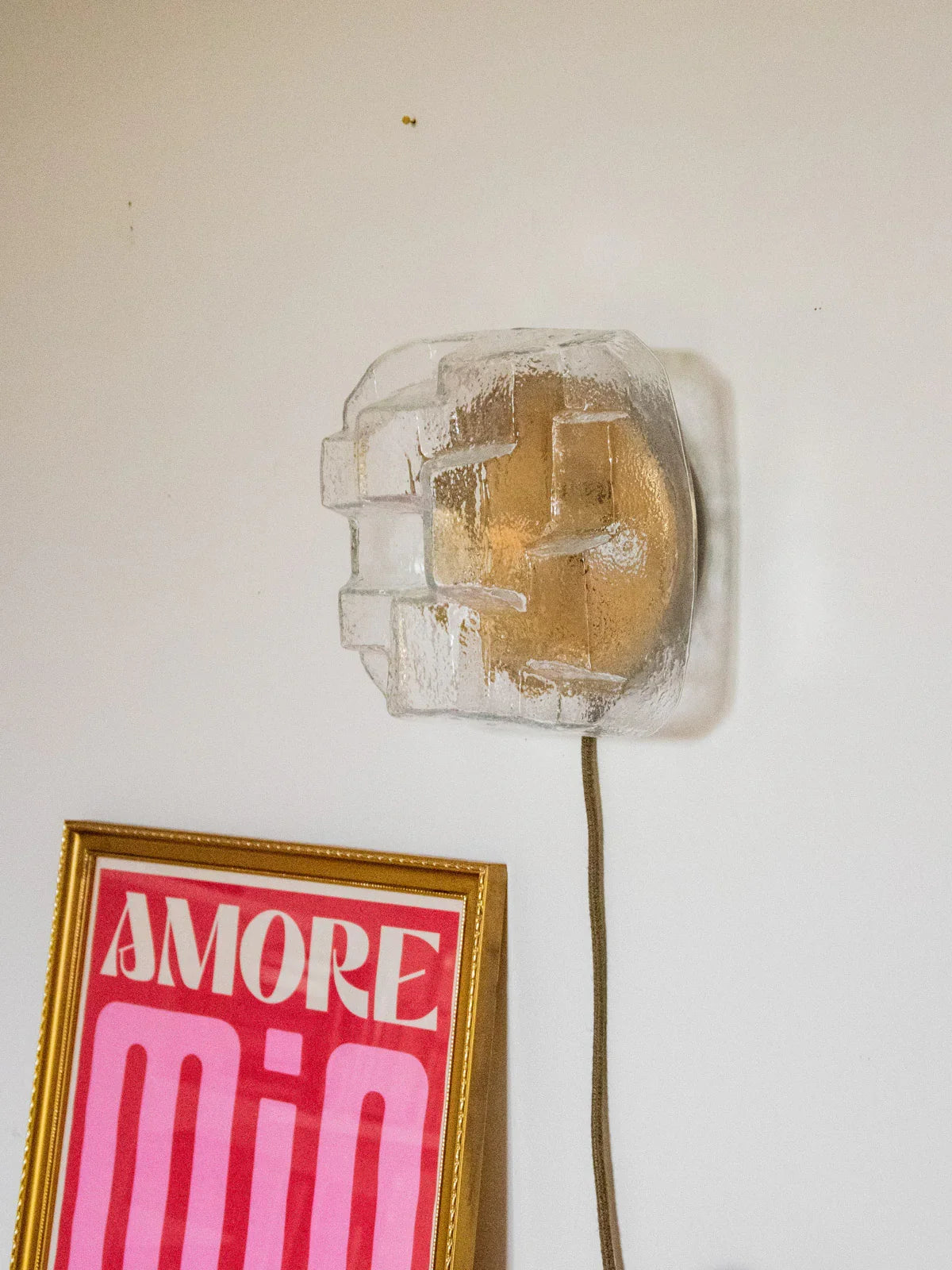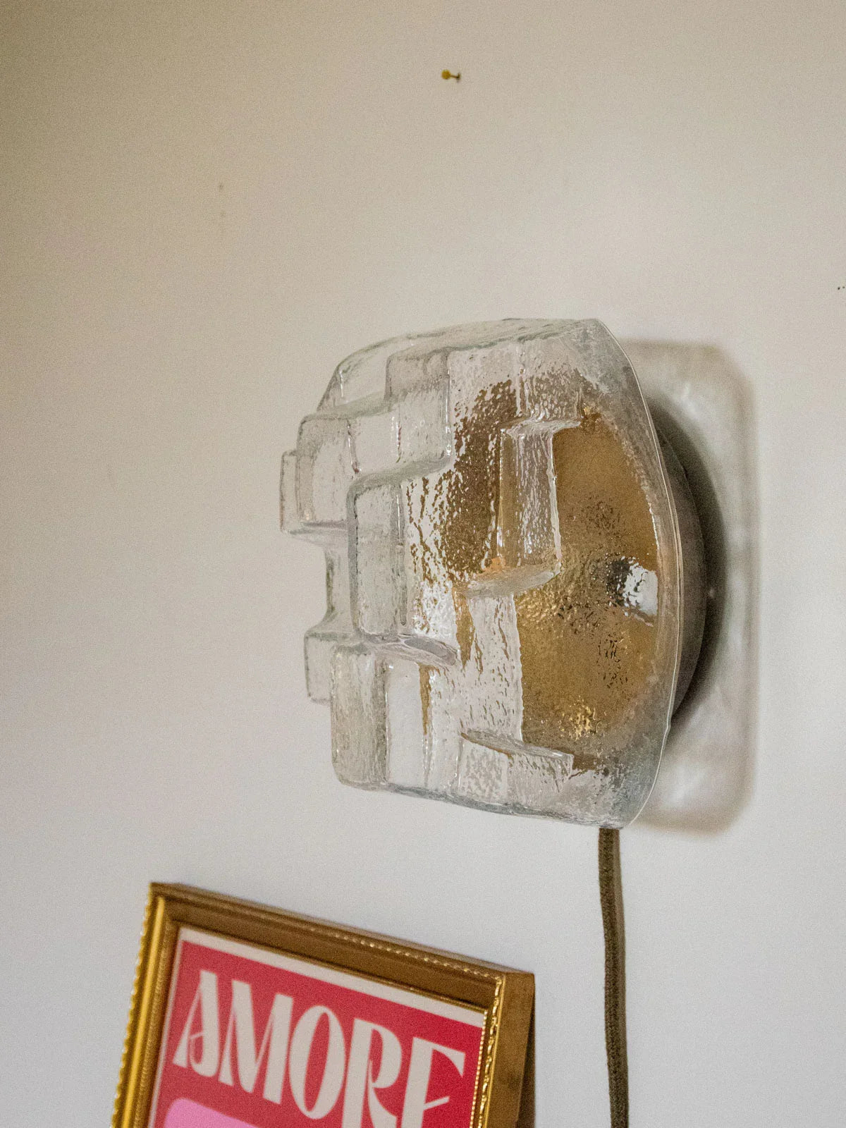 Discover this unique ambient lamp, completely restored by hand: a clear glass globe, a repainted gold interior, and a gold base enhance the light reflection, while the honey-colored twisted cable and black details lend it a refined elegance. The wiring has been redone, and it comes with a 25W 2700K G9 bulb and a long cable with a foot switch; a new hook on the back and glides allow it to be hung or placed on a surface. Compact and inviting, it diffuses a soft light, ideal for a bedside table or shelf.