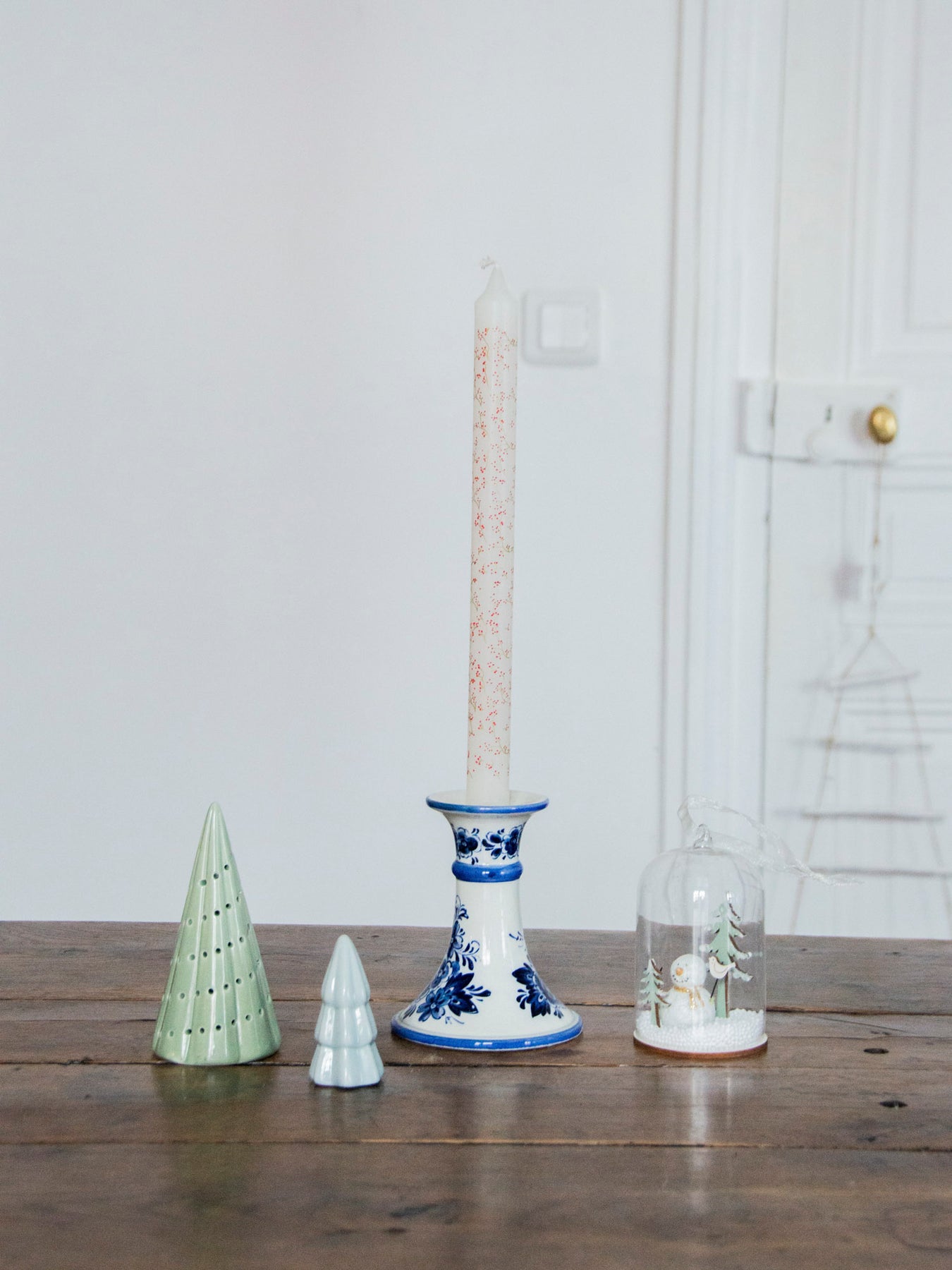 Elevate your table or shelf with this earthenware candle holder, delicately decorated with blue floral motifs. Its slightly flared base ensures reassuring stability and harmonious proportions, perfect for holding a medium-sized candle. The smooth glaze and floral design lend a retro and luminous touch, ideal for creating a soft ambiance during dinner or as a decorative accent in a serene interior. A small object with character that exudes warmth and poetry.
